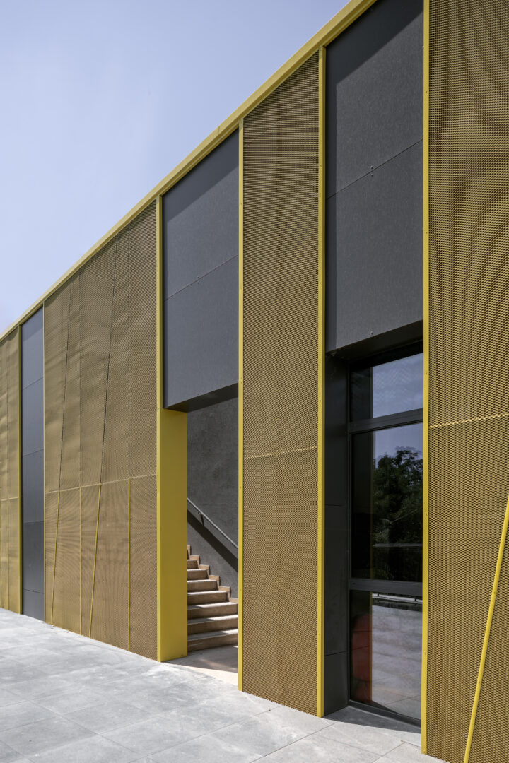 הקומה המרכזית חופתה ברשת פח מחוררת בגוון צהוב ובחיתוכים אלכסוניים המשווים למסה האורכית מראה ייחודי ומשתנה בעונות השנה ושעות היום. החיפוי מזכיר קליפת עץ מבוקעת עם משחק של מבט, תנועה, אור וצל. המבנה, למרות היותו חדש, נראה נטוע במקומו עטוף צמחיה וותיקה, בולט אך מתמזג, נדמה כאילו היה כאן כבר שנים רבות והקהילה אימצה אותו לחיקה באהבה גדולה.