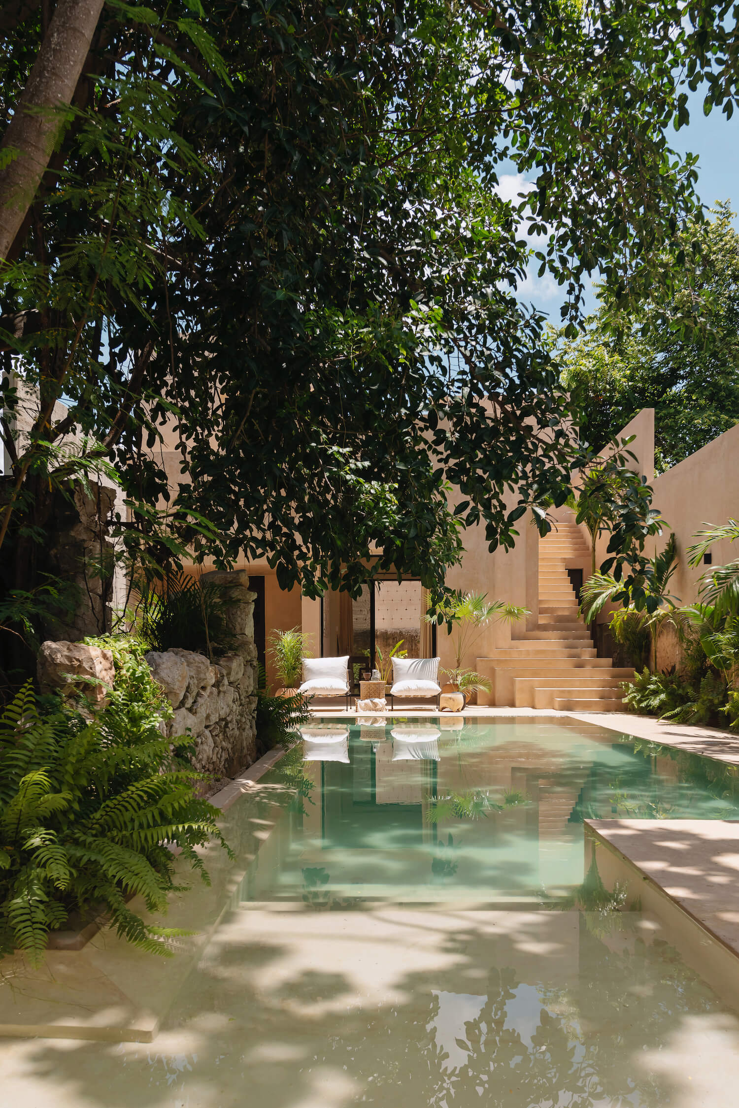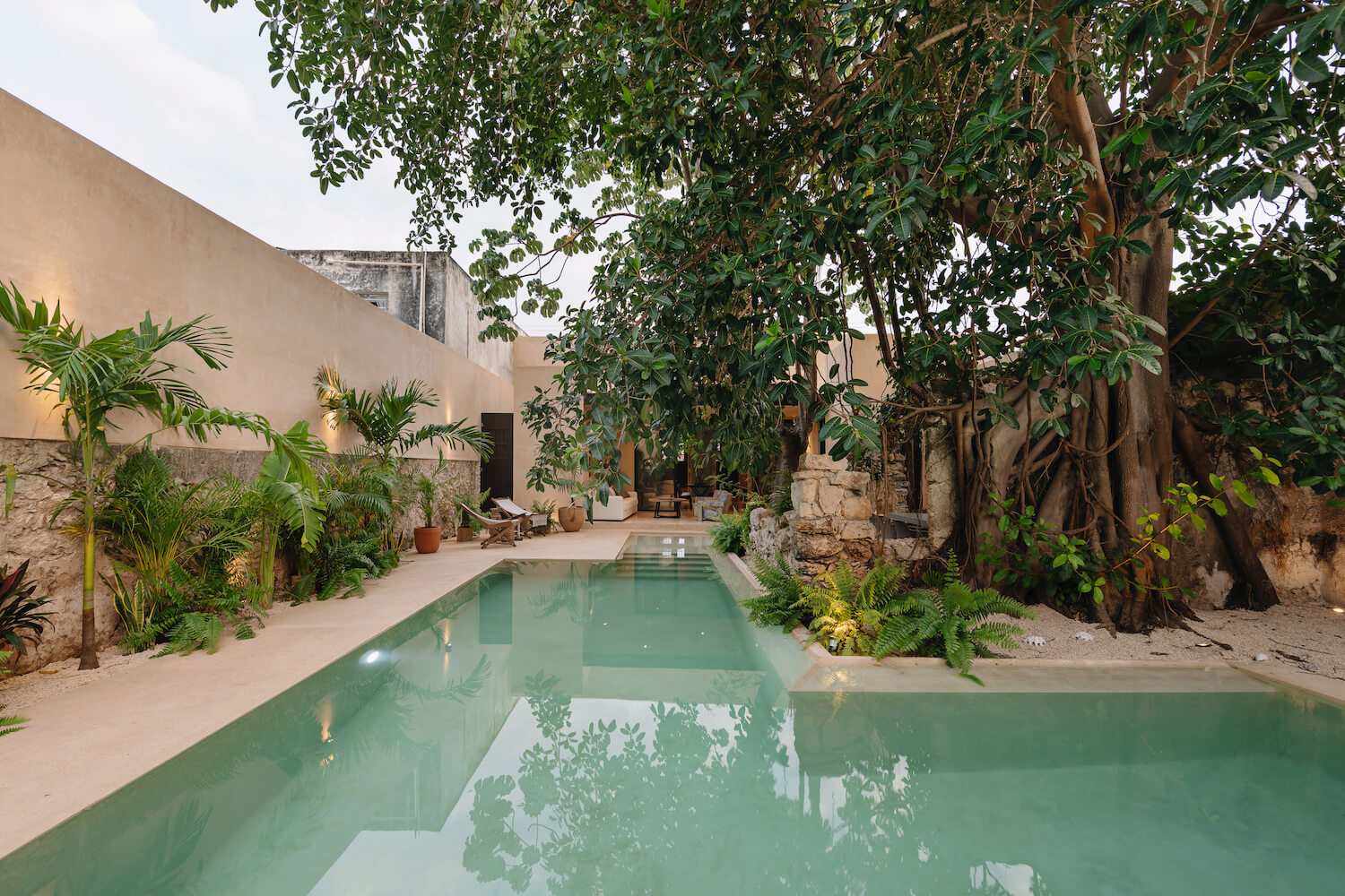 בחצר המרכזית, בריכת שחייה מוקפת שרידי אבן של מבנה קולוניאלי ישן, שבו עץ גדול מחולל משחק מרהיב של אור וצל עם החזית שלו ויוצר את האווירה המושלמת לאירוח במטבח חוץ.