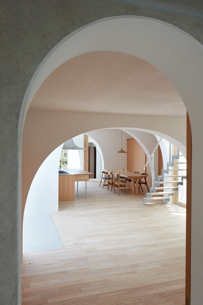 משרד האדריכלים Tomohiro Hata Architect and Associates היה צריך להתמודד עם מדרון, עליו יעמוד הבית. האדריכלים בנו קירות עם קשתות, המארגנות בהצלחה את תוכנית הסבת המבנה בין המפלס העליון והתחתון, על ידי קבלת פירמידה למעלה. בהתאם לכך, הרכב החלל משתנה מהחזית לגב, על ידי חיבור הקירות כחזית רומנסקית.