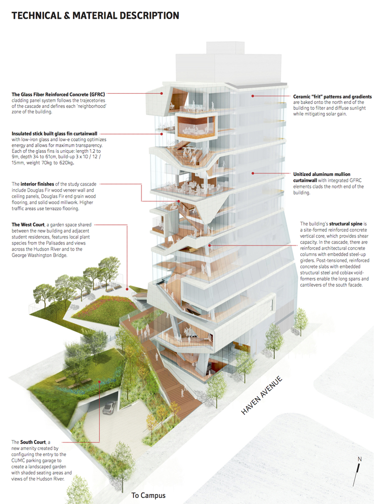 המבנה מעוגן ברשת מרחבים חברתיים ולימודים, המפוזרים לאורך גרם מדרגות אנכי חשוף, המחובר זה לזה, המשתרע לאורך גובה הבניין וכולל מתקנים רפואיים ומדעיים מתקדמים.