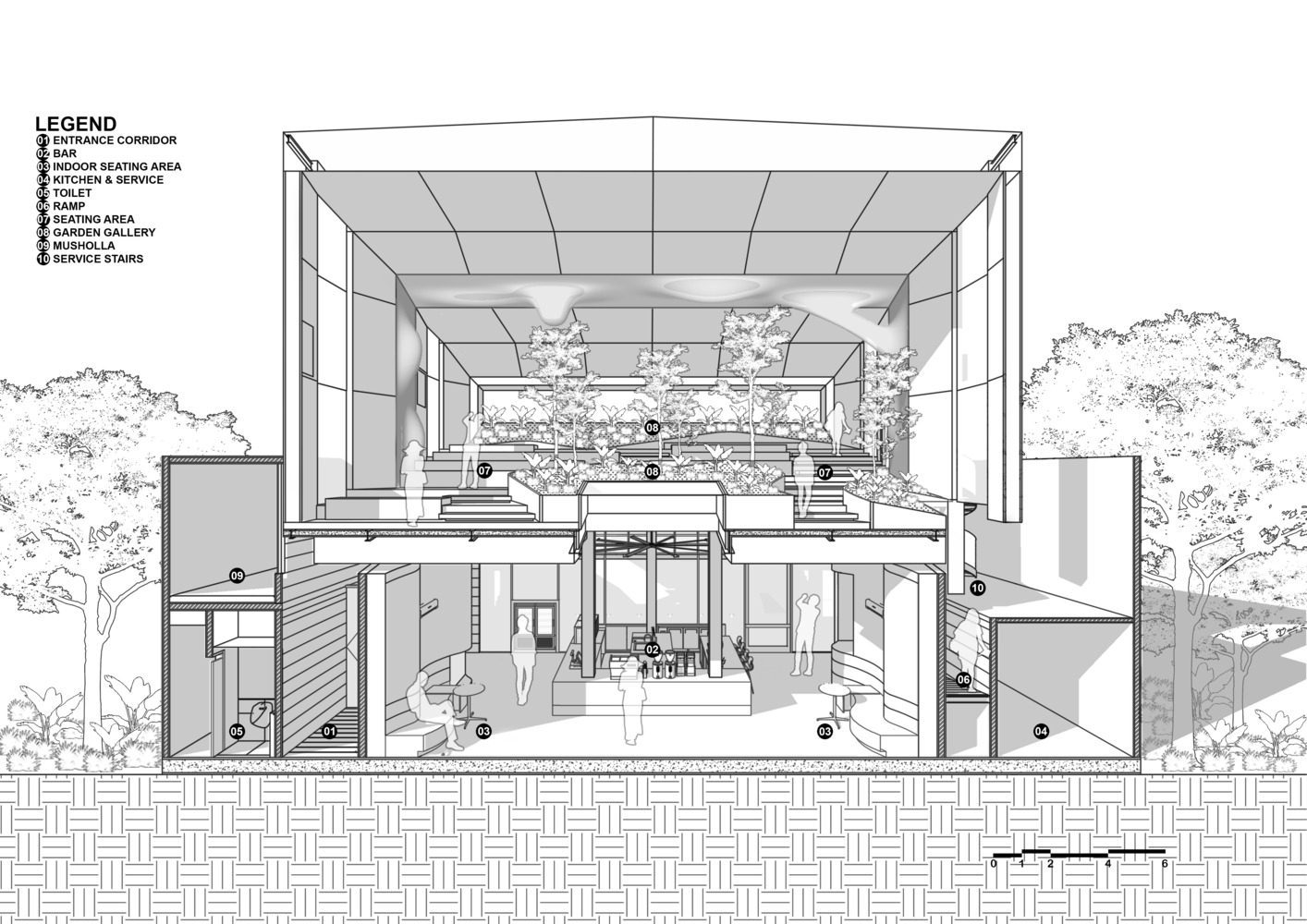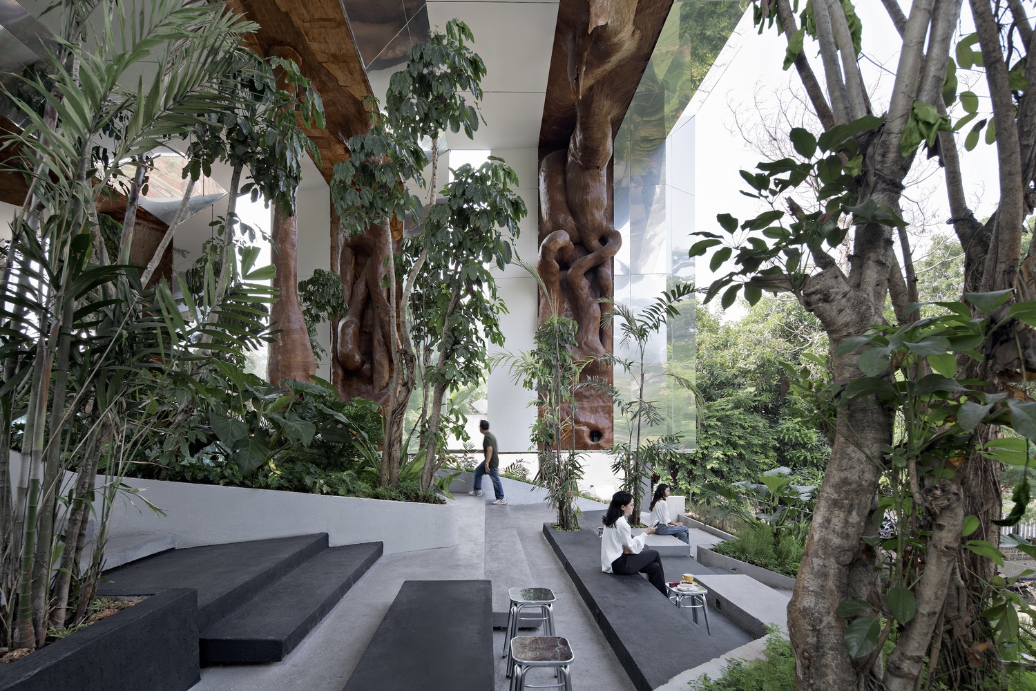 מסגרות גדולות ממסגרות את המרחב ויוצרות אפקט של פרספקטיבה וגם ממסגרות את המקום כיצירת אמנות. סקיילייט דמוי נווה מדבר באמצע הגן, מאפשר לקרני השקיעה לחדור ישר לאמצע בית הקפה המקורה. רוב הרהיטים בבית הקפה הזה אינם מוגדרים, מעורבבים עם הנוף ומאפייניו ומגדירים מחדש את מושג הרהיטים.
