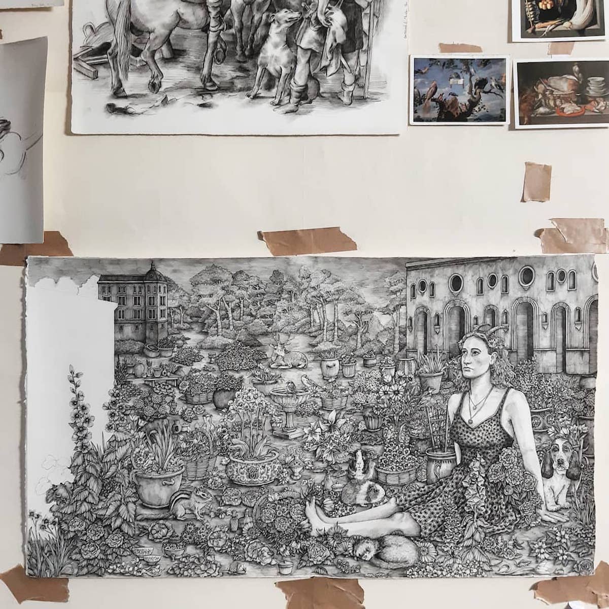 הציורים של האמנית הבריטית olivia kemp, מפורטים למילימטרים ומשתרעים בקנה מידה מונומנטלי, על קירות הסטודיו שלה.
