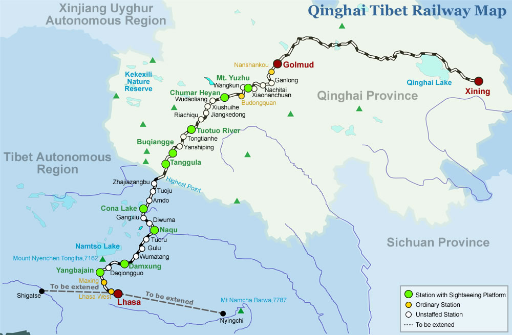 הרכבת עוברת גם את המנהרה הגבוהה בעולם (מנהרת Fenghuoshan) ותחנת הרכבת הגבוהה בעולם (תחנת טאנגולה).