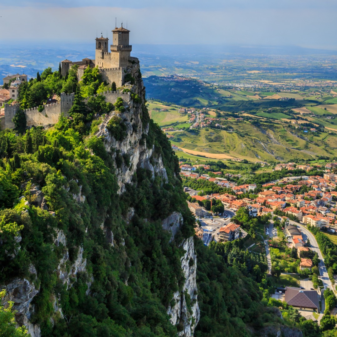 בנוסף, היא הייתה מובלעת של איטליה והגנה על עצמה באמצעות מבצרים הבנויים במרומי הרי האפנינים, עליהם היא יושבת. חלק גדול מהעיר תחום בתוך חומות עתיקות ומתנשא מעל טירה בשם מגדל גואיטה, על ראש הר טיטאנו. מאז איחוד שאר חצי האי האיטלקי במאה ה-19, סן מרינו שמרה על יחסים דיפלומטיים שלווים בדרך כלל עם האומה הגובלת הבודדת שלה.