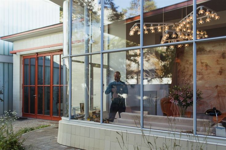 במשך שנים רבות, תלוי היה שלט "למכירה" בחלון בניין תחנת הדלק הנטוש, אשר משכה את תשומת לבו של Juerg. לאחר שתיעד במצלמתו את הדעיכה האיטית שלה באמצעות תצלומים, בעל הגלריה לבסוף נכנע לשירת הסירנה של הבניין והפך אותו למקלט של עולם האמנות שלו. הבניין חי בהרמוניה בין העבר וההווה, החיפוי של התחנה והחזית חהיצונית נמצאות במצב קרוב למקורי. כדי לשמר את החיפוי בצבע קרם-הטיפוסי, בעל הגלריה וצוות הארכיטקטורה שלו החליף את האריחים הדהויים מהקירות החיצוניים עם אלה השתמרו היטב מבפנים. "זו יוקרה אמיתית שיש בית עם גינה באמצע העיר", אומר הדייר "אני גם טבח וגם צפר נלהב. כאן בנכס המיוחד הזה, אני יכול לשלב את האהבות האלה: יש לי הזדמנות נדירה לשמור על קבוצה מעניינת של ציפורים נפלאות ולשתול עגבניות ועשבי תיבול".