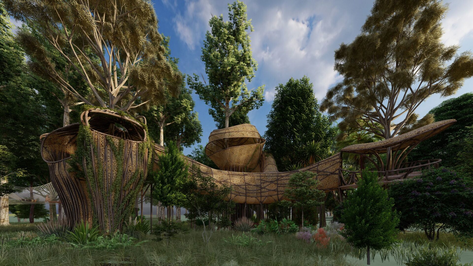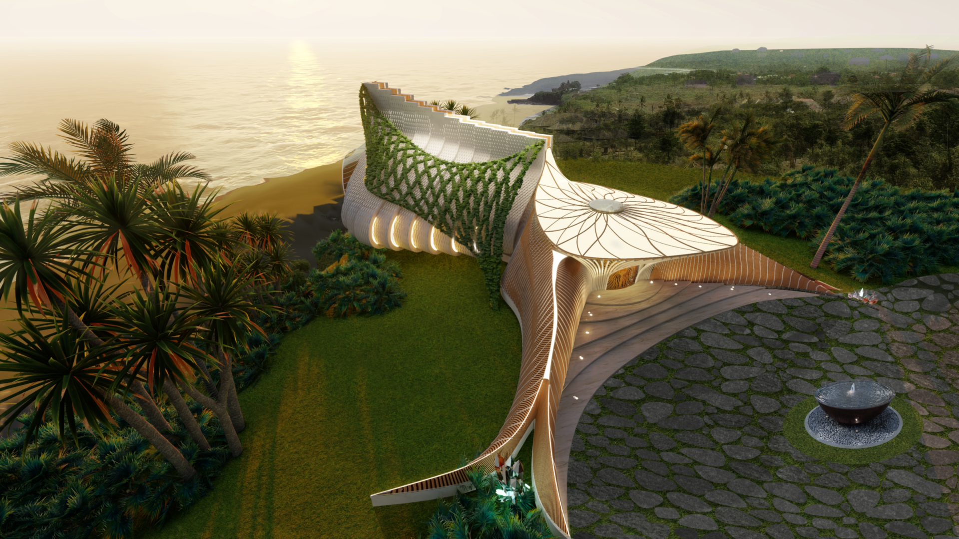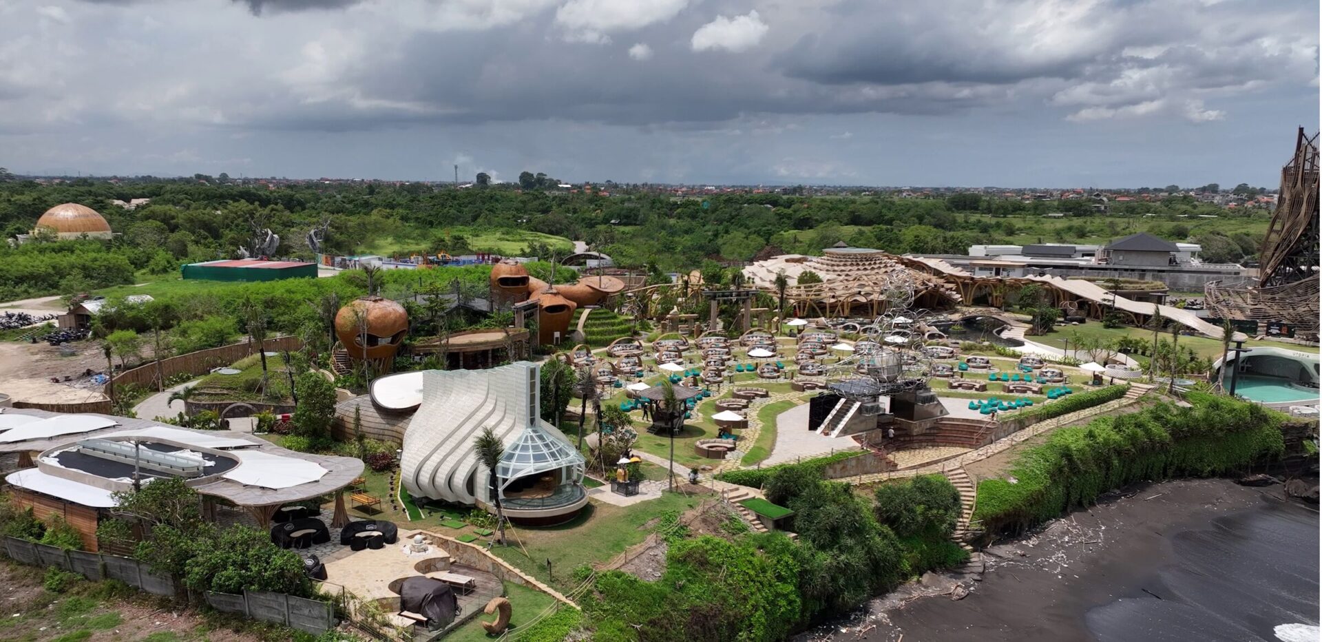 תכנית האב מבוססת על רצפי פיבונאצ’י וחתך הזהב, ומייצרת זרימה מתמשכת בין המבנים והמרחבים. במרכז המתחם ניצב מבנה ה־Beach Club – קומפוזיציה דמוית מערבולת הבנויה מבמבוק ובזלת, עם קירוי שכבות ארוגות המצלילות את הפנים ביום ומוארות בלילה. המבנה, המאופיין בנוכחות “נשית” המאזנת מגדלור סמוך, מתפקד כמסעדה, חלל סדנאות ובמה לאירועים. אליו מחוברת בריכת לגונה הפונה לים, שמובילה אל מתחם תת־קרקעי – Utopia VIP Club – הכולל מגלשת נהר באורך 9 מטרים. פלטפורמות מוגבהות מחומרים ממוחזרים משתלבות ביער ויוצרות רשתות, מנהרות ומסלולי טיפוס המשחקים עם הטופוגרפיה הטבעית.