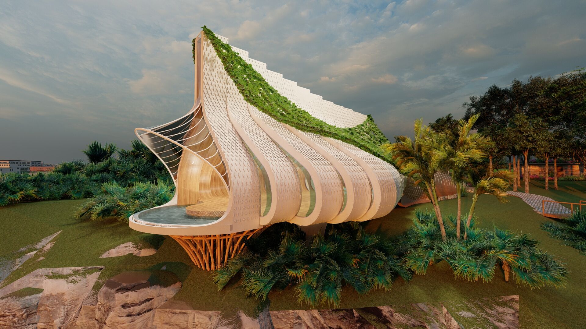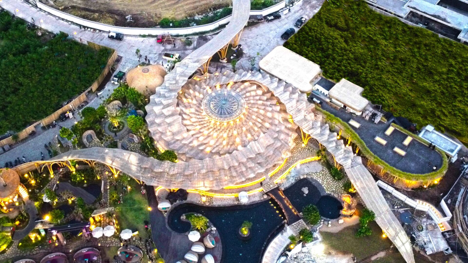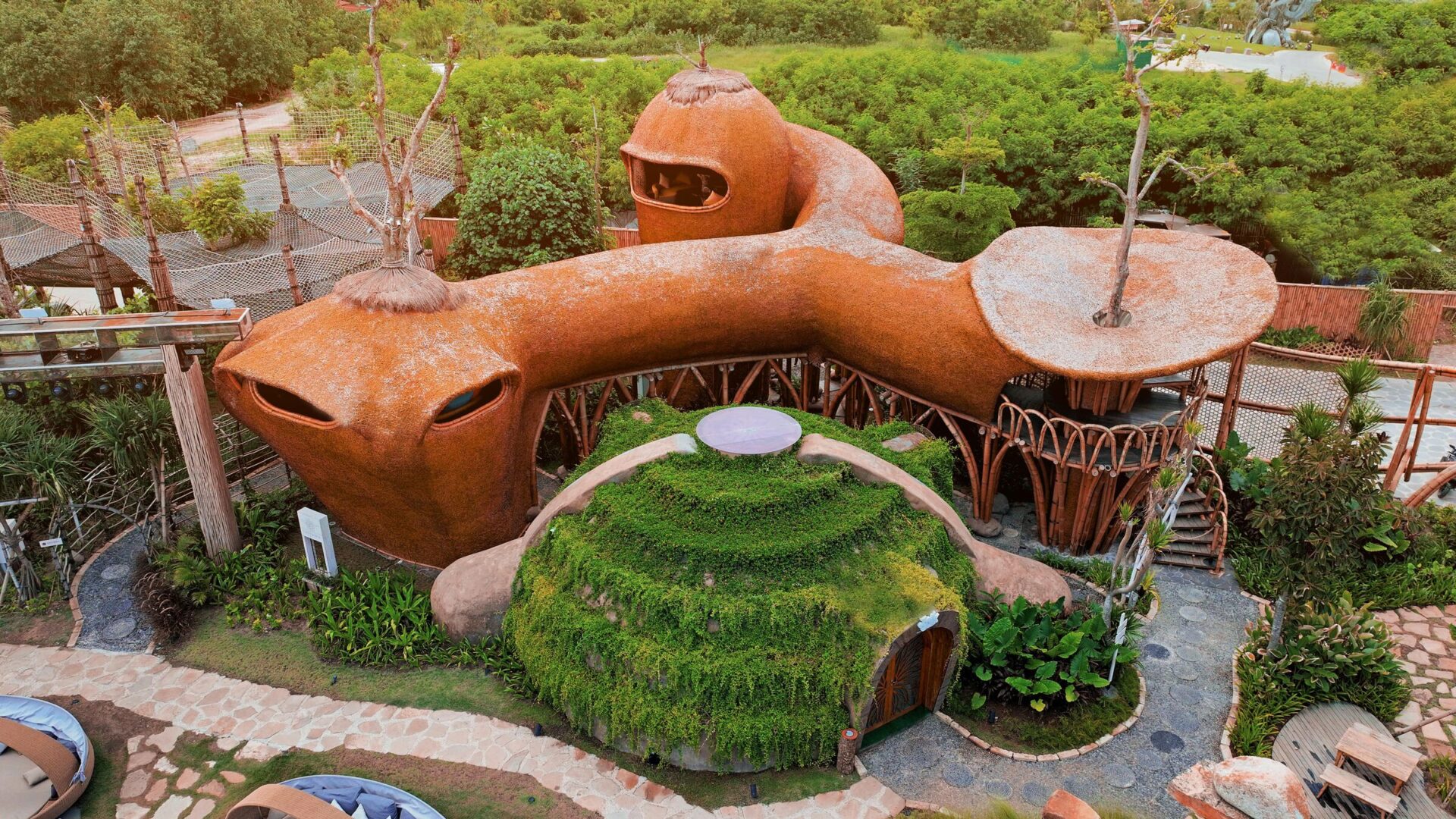 כך נוצר מתחם שמצליח לארח פסטיבלים, הופעות ותערוכות בקנה מידה גדול – תוך שמירה על המיקרו־אקלים, הצמחייה והטופוגרפיה של האתר. אדריכלות אורגנית, ניסיונית ופורצת דרך – שממש צומחת מתוך הקרקע.