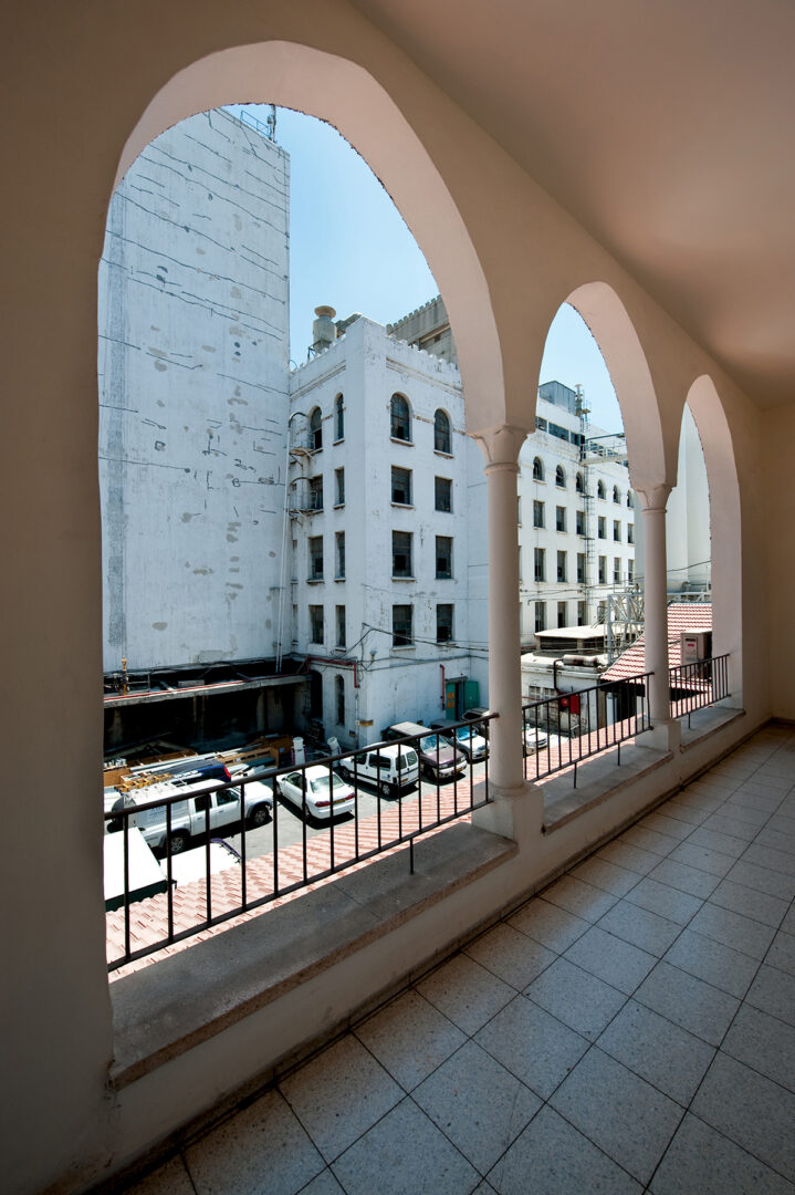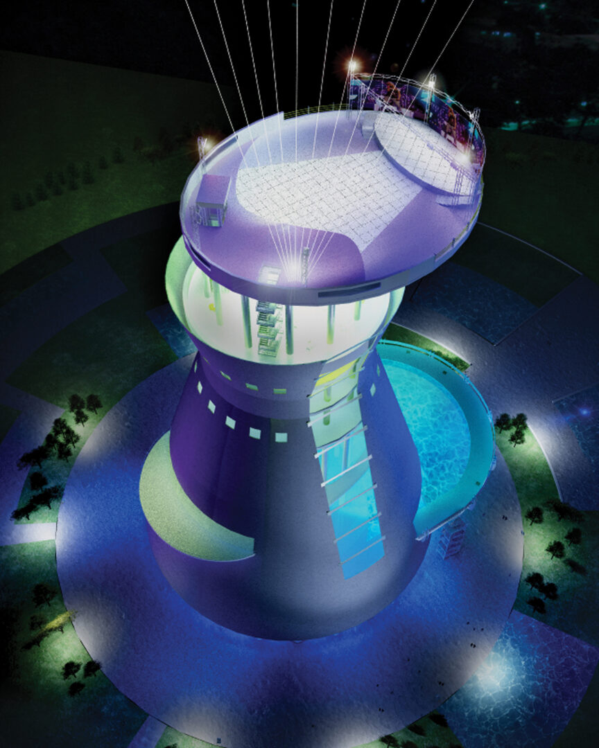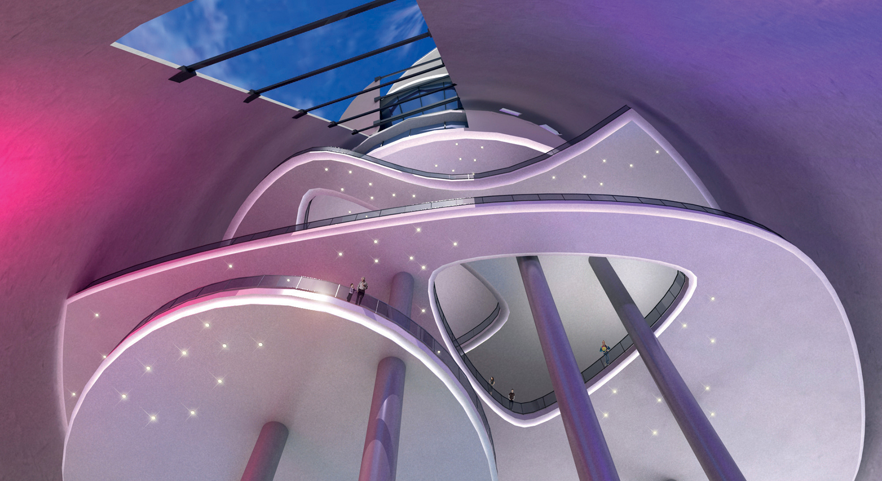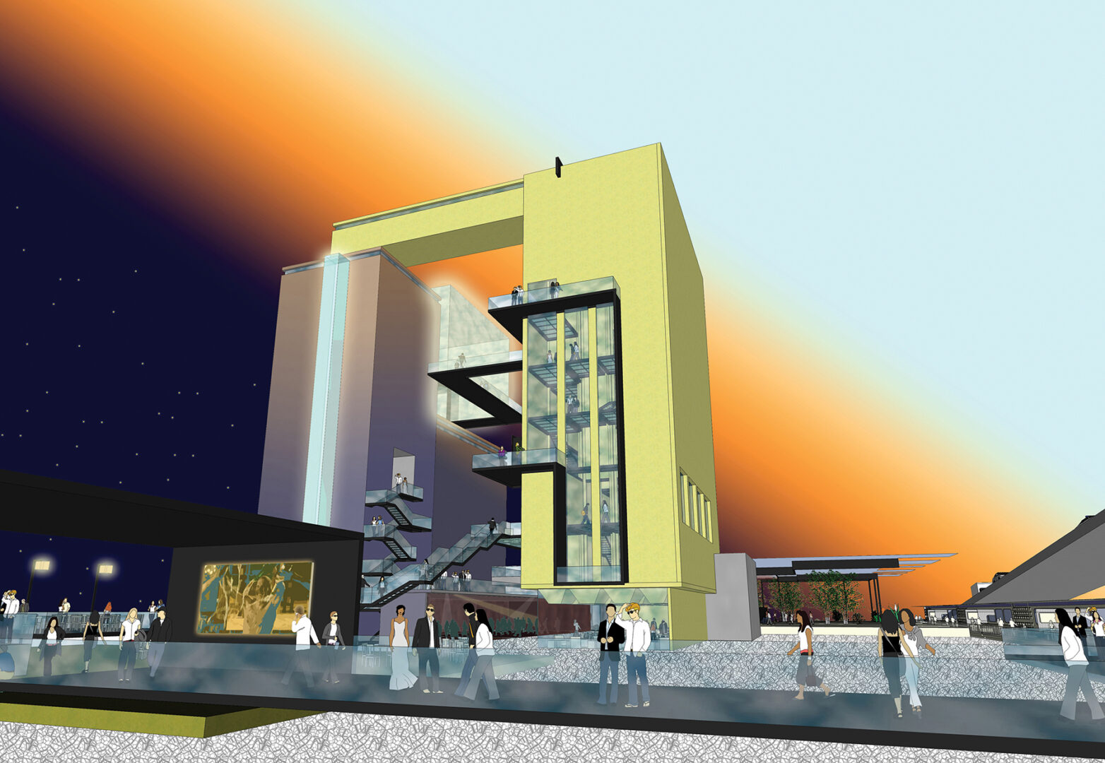 בתמונה: מעל לבניין מרחפת רחבה הצופה אל העיר: כיכר עירונית מזן אחר, מרחב מרהיב להופעות, מסיבות, ערבי גאלה או שיחות רומנטיות. התושבים מעולם לא הורשו להיכנס למקומות האלה שהיו מחוץ לתחום. לפתע מתגלה העיר מזווית אחרת, חדשה ומפתיעה.