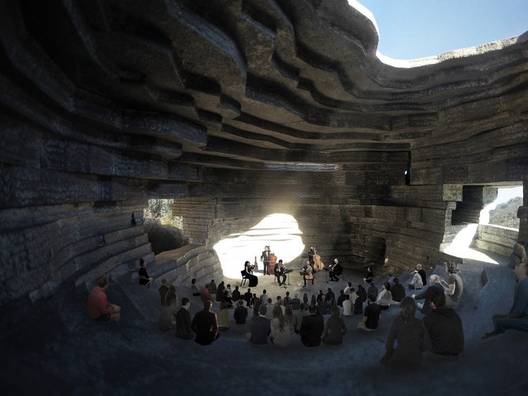 האולם אינו בנוי מערימות סלע, ​​אלא משכבות של סוג בטון ייחודי, משולב עם אגרגט עשוי מאבן מקומית ובמובן זה, המבנה פשוטו כמשמעו נולד מסביבתו, חלק אינהרנטי מהנוף הטבעי הייחודי של האזור. "הסימפוניה של הטבע היא מה שבאמת רצינו שאנשים יחוו כאן", אמרו האדריכלים.