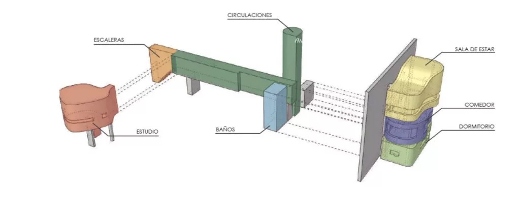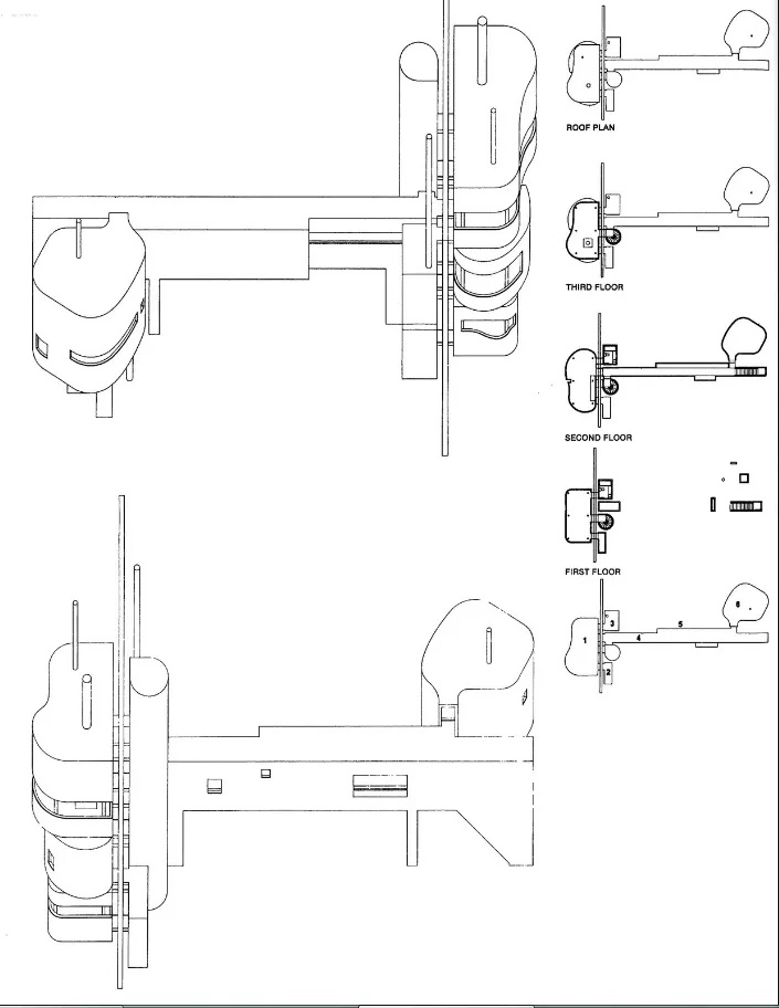 החללים עצמם מפורקים לצורות נפרדות: נפחים מעוגלים המכילים חדר שינה, סלון ופינת אוכל נערמים זה מעל זה לצד הקיר, בעוד מסדרון אופקי מוביל לחלל עבודה נפרד. במקום בית כיחידה אחת, מתקבלת קומפוזיציה של אובייקטים – כמעט ציור תלת־ממדי.