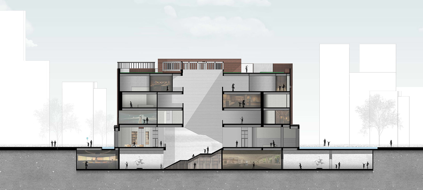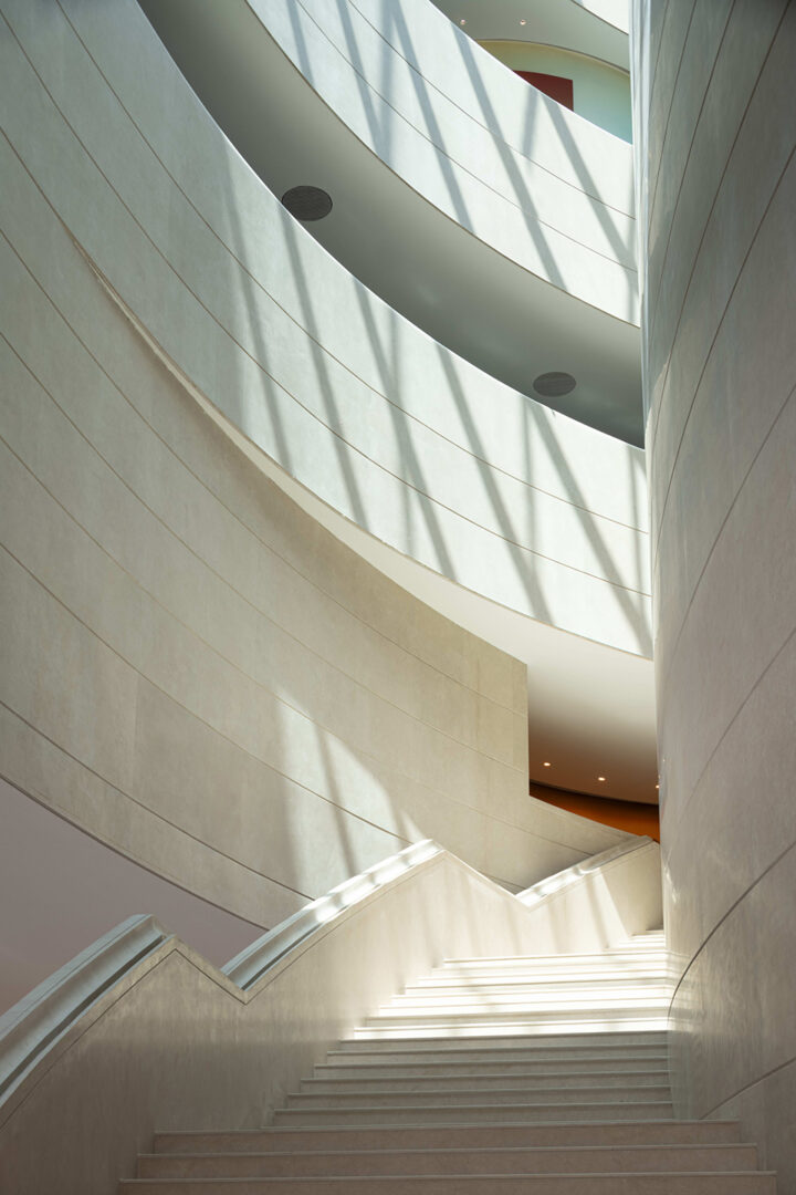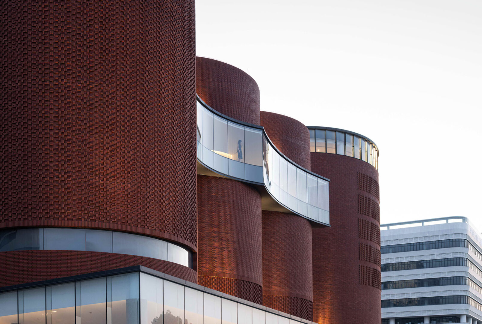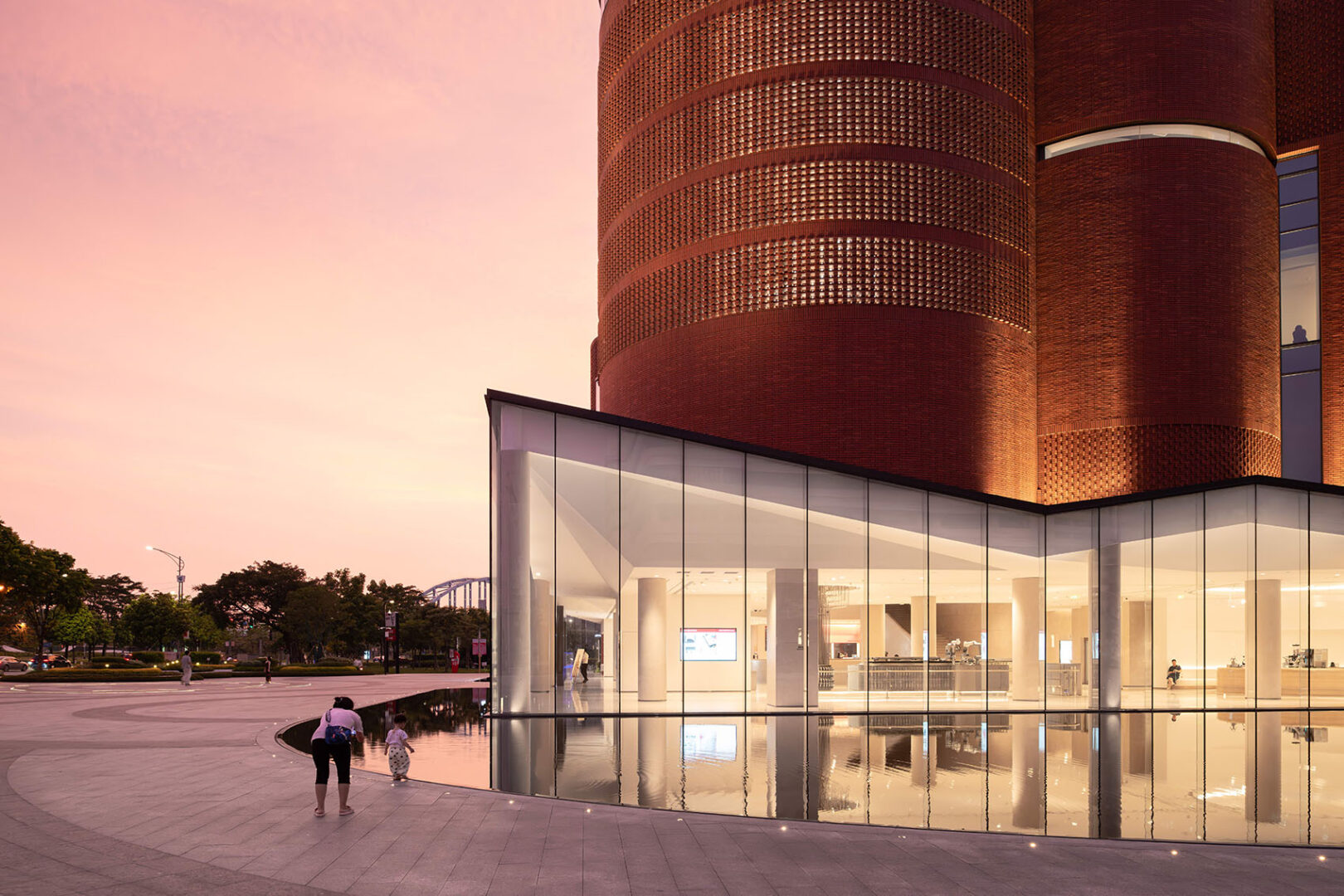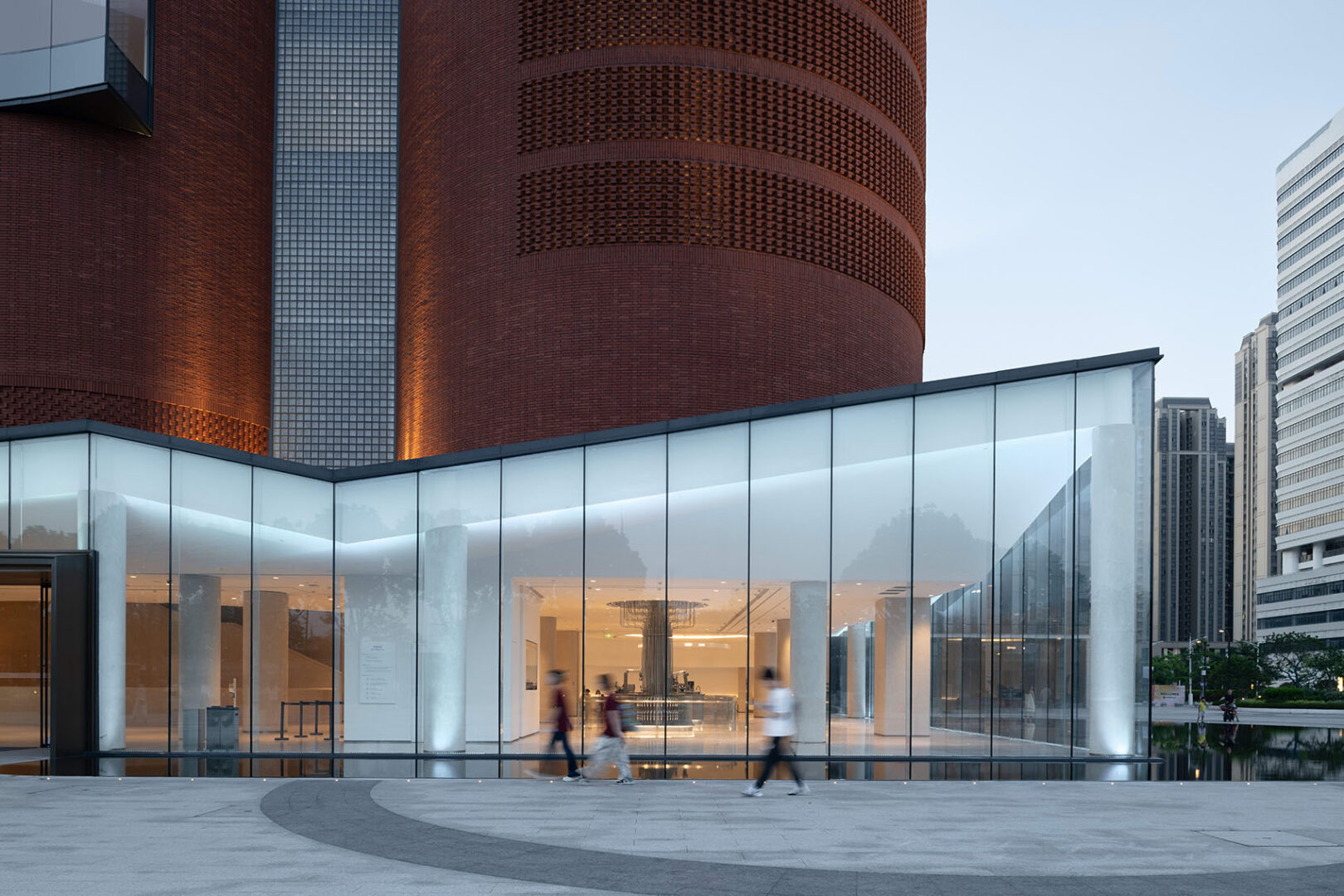 במפלס הקרקע, חזיתות זכוכית שקופות פותחות את המוזיאון אל המרחב העירוני ויוצרות מעין סלון ציבורי מזמין. שימוש בזכוכית צבעונית, משטחים מחזירי אור ובריכות מים מייצר רבדים חזותיים דינמיים, המטשטשים את הגבול בין פנים לחוץ. הדיאלוג בין מוצקות הלבנים לקלילות הזכוכית יוצר איזון מתוחכם בין אטימות לשקיפות. מסדרון זכוכית מעוקלת במפלס העליון משמש הן כפלטפורמת תצפית והן כצוהר ארכיטקטוני אל הנרטיב של המוזיאון.
