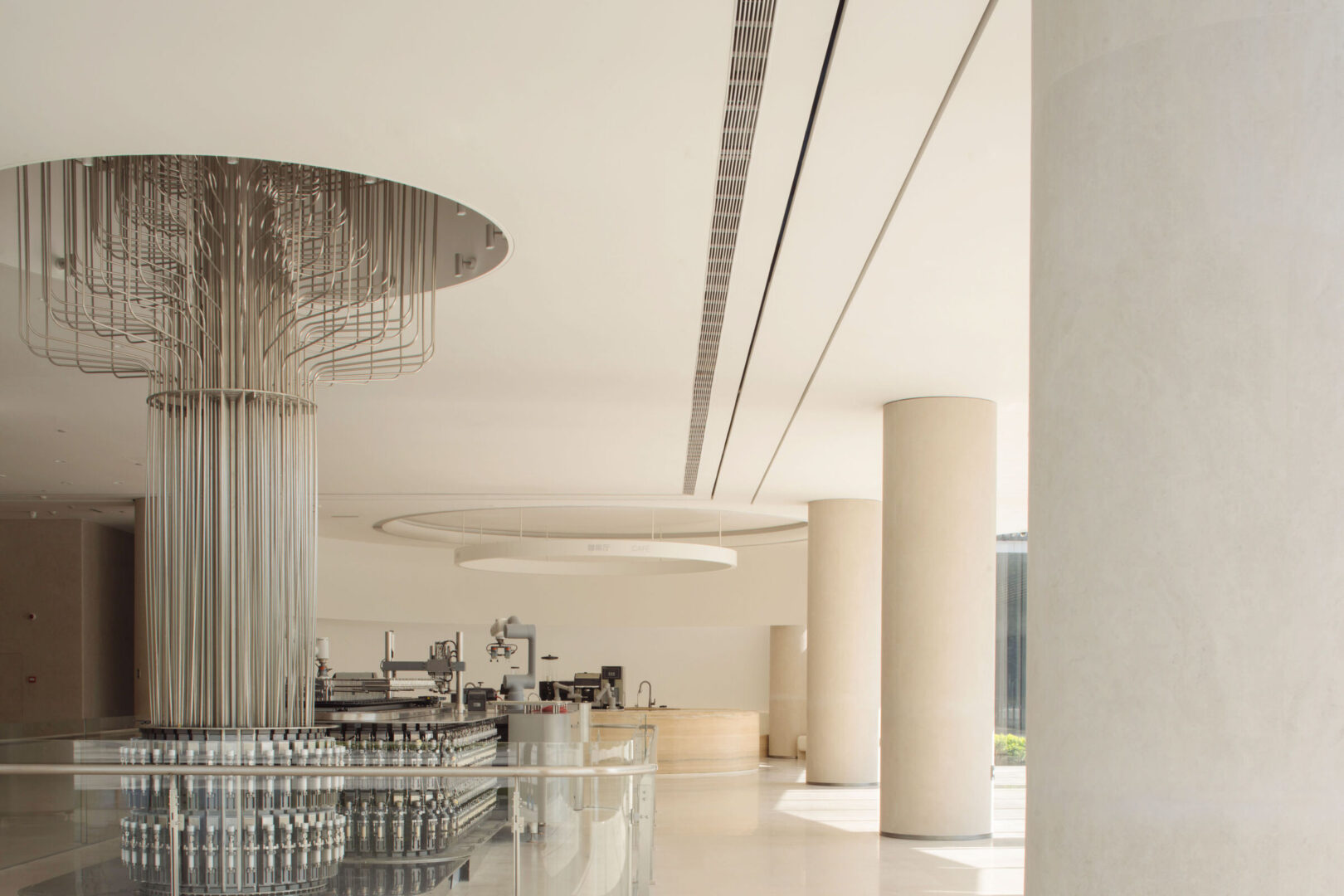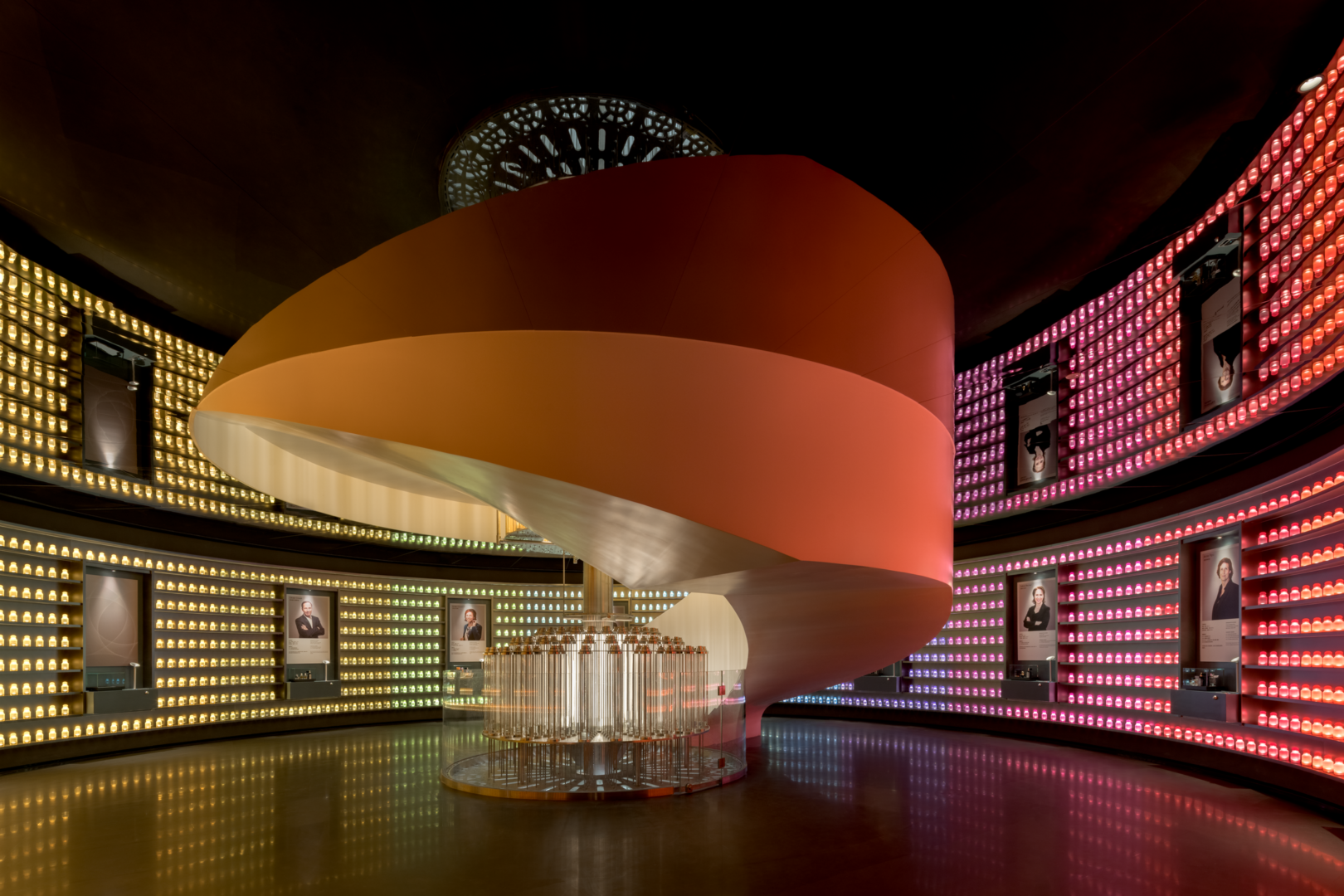 בחללי הפנים נפרשים כ־9,500 מ"ר של תצוגה כמסע חושי מתמשך. אטריום מרכזי, גרמי מדרגות מעוקלים וגלריות מדורגות כוריאוגרפיות את תנועת המבקרים בבניין, ומהדהדים את האופן שבו ריח מתפשט במרחב. גן הבשמים שעל הגג חותם את החוויה: ניחוחות בוטניים ויצירת ניחוחות עכשווית מחברים מחדש בין האדם, הטבע והעיר.
