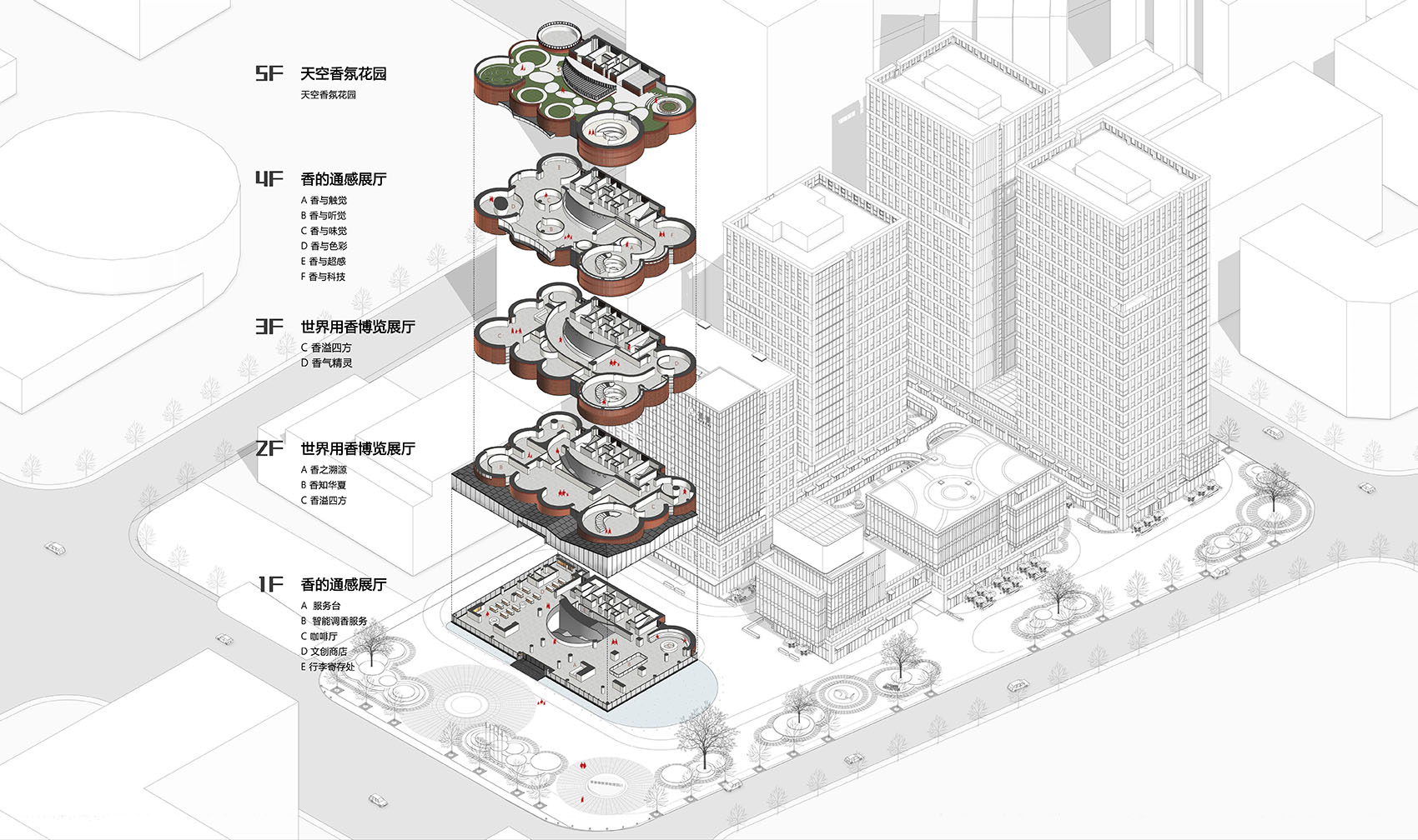 הפרויקט ממוקם בלב Guangzhou MinKe Park, אזור ליבה עירוני בעל אופי תעשייתי וצפיפות גבוהה. תוכנית האב פותחה באמצעות היגיון כפול של "תעשייה ותרבות", וממקמת זה לצד זה את מטה החברה ואת מוזיאון הבשמים. האתר מחולק לשני אזורים ברורים: מצפון, קמפוס משרדים קומפקטי המוגדר על ידי נפחים נמוכים היוצרים חזית עירונית רציפה; מדרום, מתחם מוזיאונים פתוח שבו רחבה ציבורית נדיבה מארחת תערוכות, אירועים וחיי יומיום עירוניים.