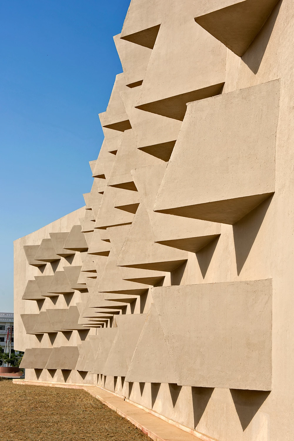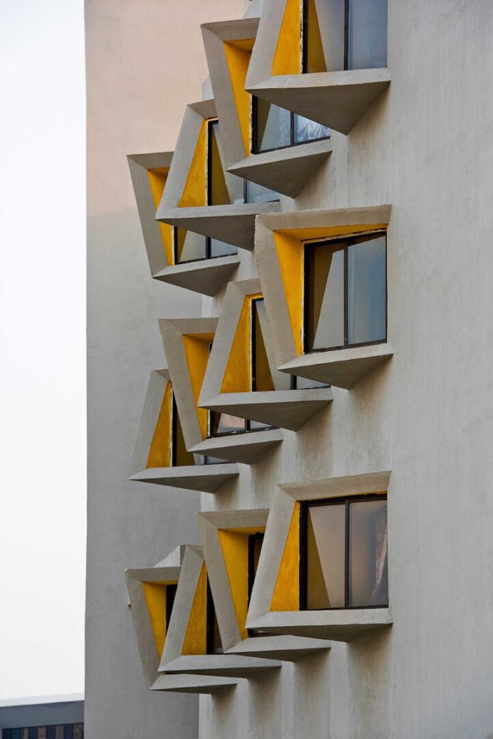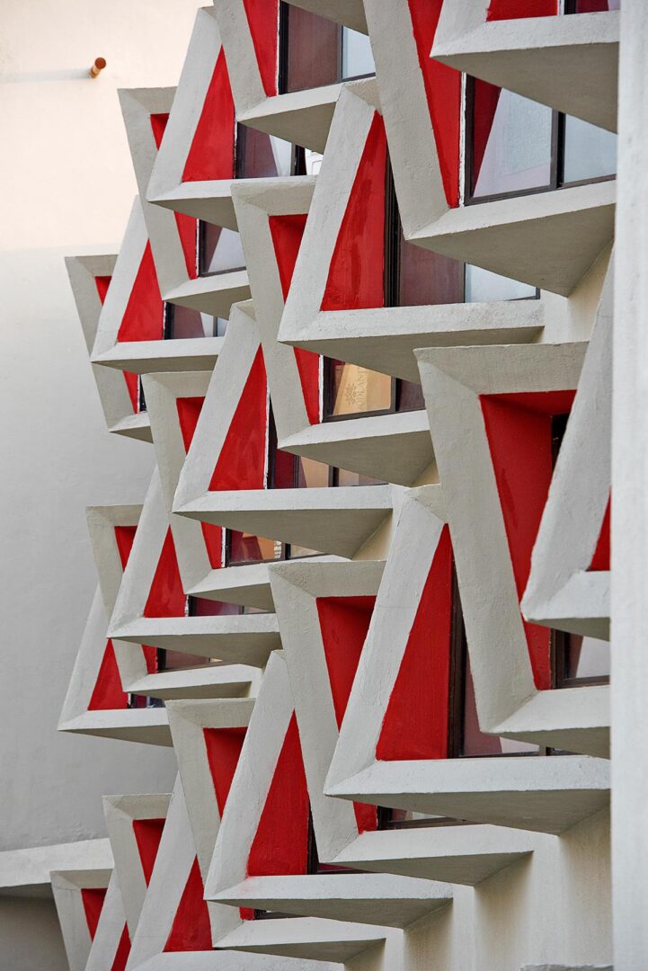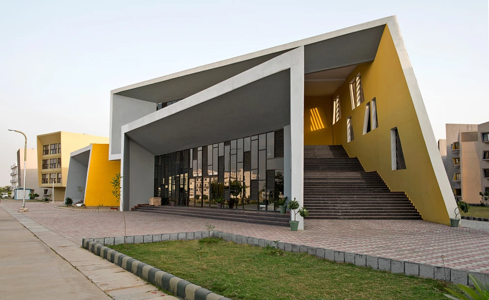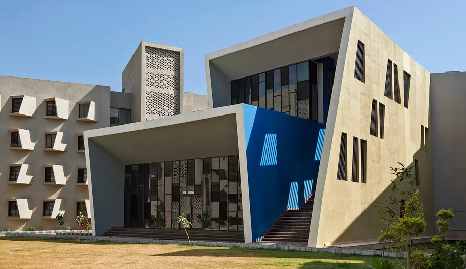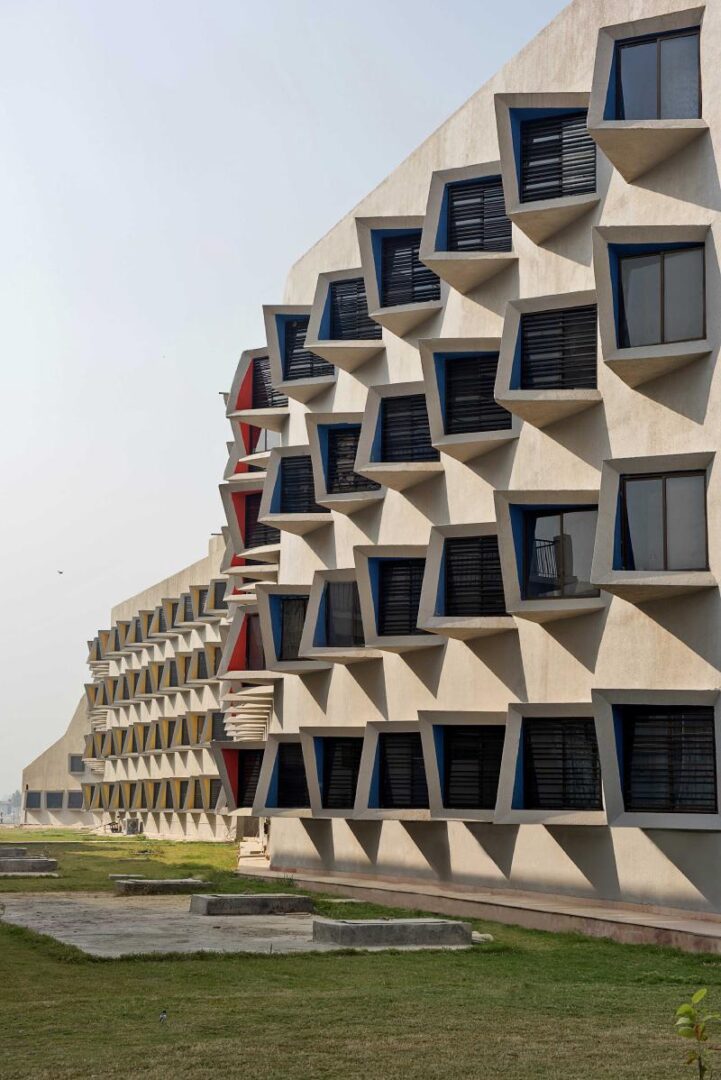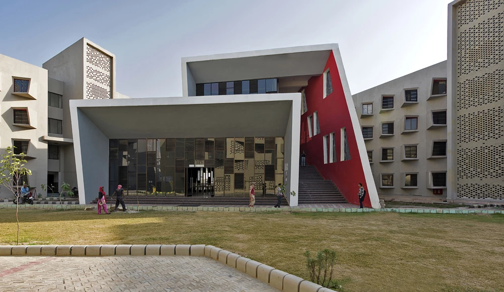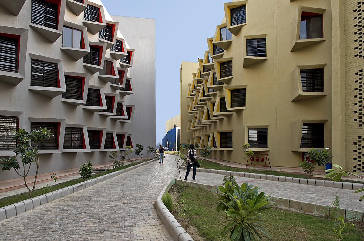 קמפוס Ganeshi Lal Agrawal University in Mathura – עיר במדינת אוטר פרדש ההודית, 150 קילומטרים דרומית לניו דלהי – כולל את אכסניית הסטודנטים הזו שעוצבה על ידי סנג'אי פורי ממומבאי. חמשת הבניינים בני ארבע הקומות, המציעים 800 חדרים, פועלים באופן אורגני, ומתפתלים באופן המבטיח תאורה טבעית ואוורור צולב. החדרים, המחוברים על ידי מסדרון מרכזי בכל קומה, כוללים מיראדורים קטנים בצורת טריז הפונים לאזורי הגן. הבלוקים, המזוהים על ידי קודי צבע, מתחברים בקצוותיהם כדי להתאים לאזורים הציבוריים יותר: קפיטריה, טרקלינים, קבלה וחדר כושר. מבחינת יעילות אנרגטית, פאנלים סולאריים על הגג ומתקני איסוף מי גשמים משלימים מערכות אקלים טבעיות.