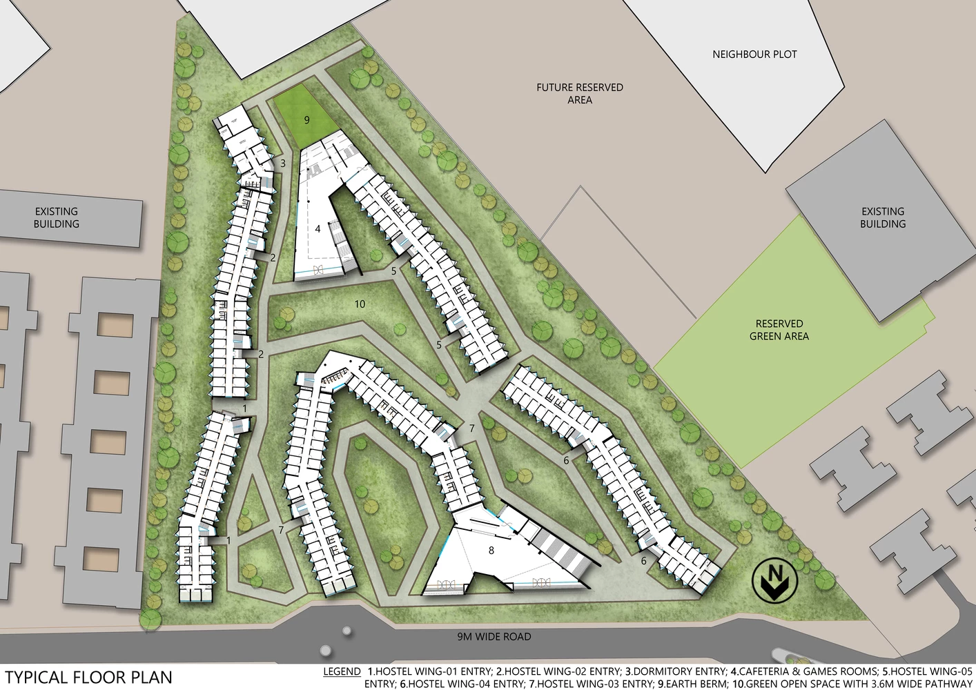 ברחובות העיר העתיקה של מטורה בהודו, ממוקמת אכסניית סטודנטים בת 800 החדרים, עם חללים אורגניים. האכסניה בגובה 4 קומות ו-5 בלוקים ליניאריים, מתפתלת על פני אתר בצורת טריז, יוצרת חללים אינדיבידואליים עם זהות ניכרת בכל חלק של הפריסה.