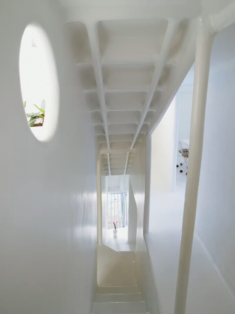 הבית נבנה בעבודת יד מטכניקת פרוצמנט (ferrocement) על גבי שלד מצינורות פלדה ממוחזרים. ייחודו טמון בכך שכל האלמנטים – קירות, ריהוט, תאורה ואף מערכות – משולבים במעטפת אורגנית אחת רציפה. המבנה עצמו מרחף מעל גג בניין בעיר, ומייצר ניגוד חד לאדריכלות המודרניסטית הרציונלית שסביבו.