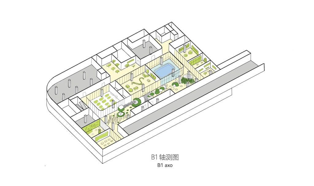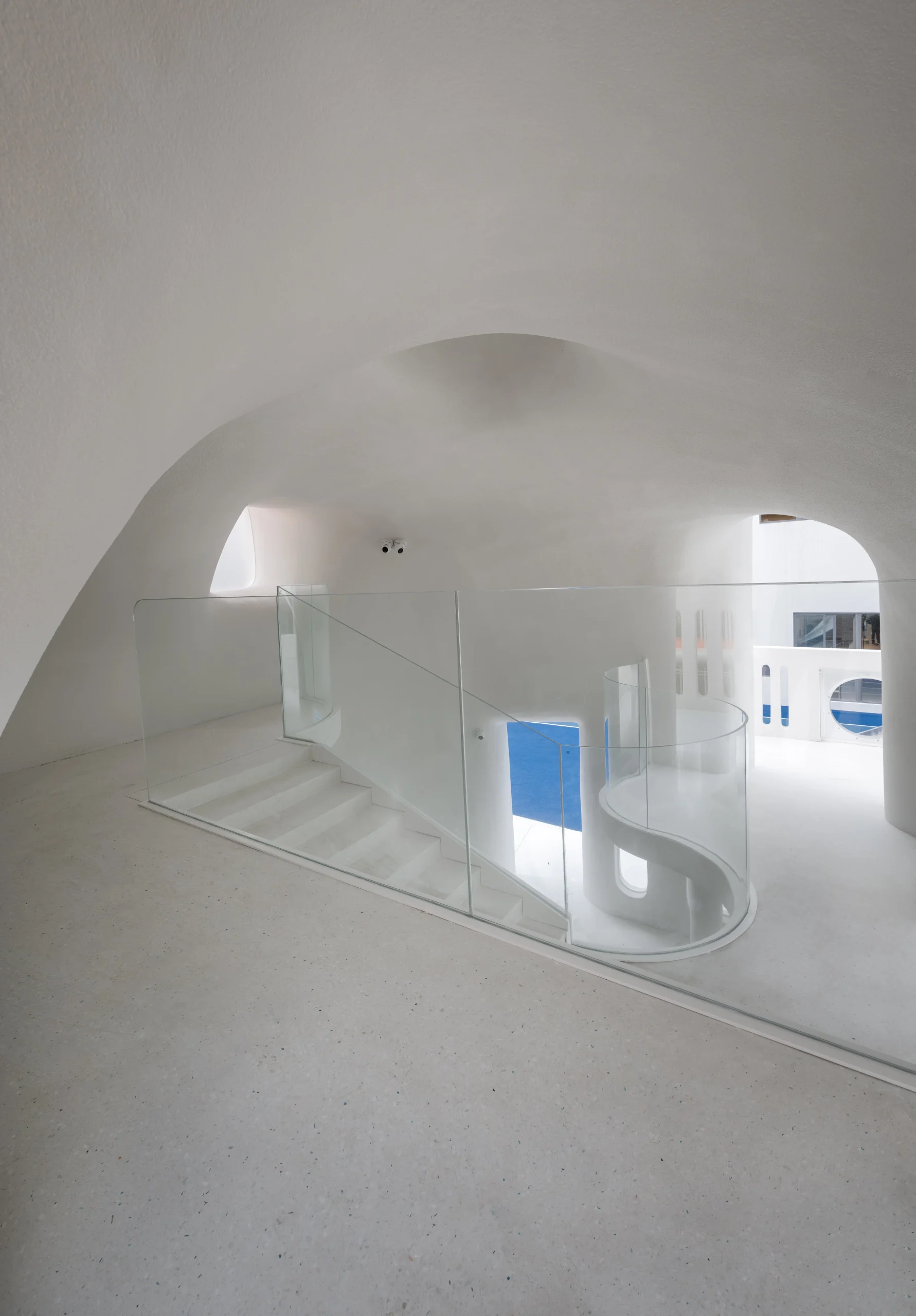 למעלה, מסדרון מתפתל זורם בין גנים, ומנחה את הדיירים דרך נקודות מבט משתנות