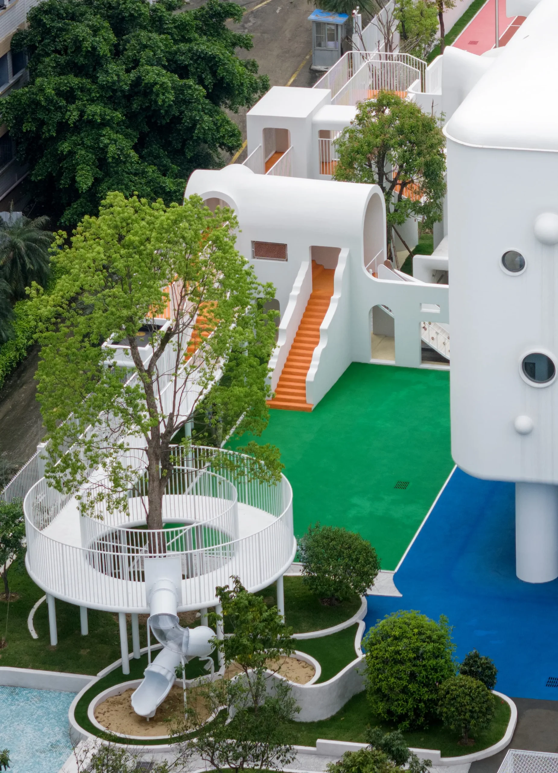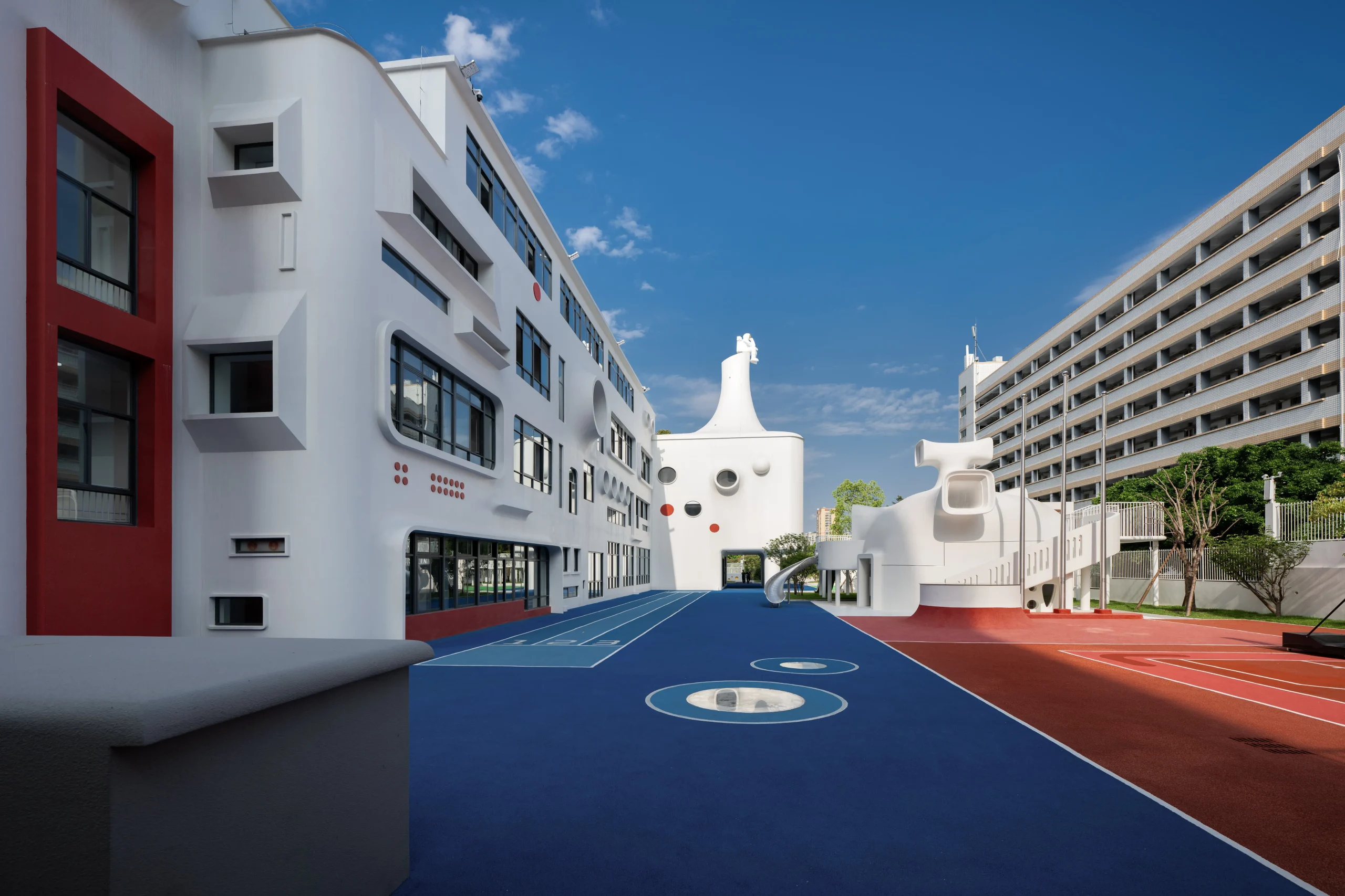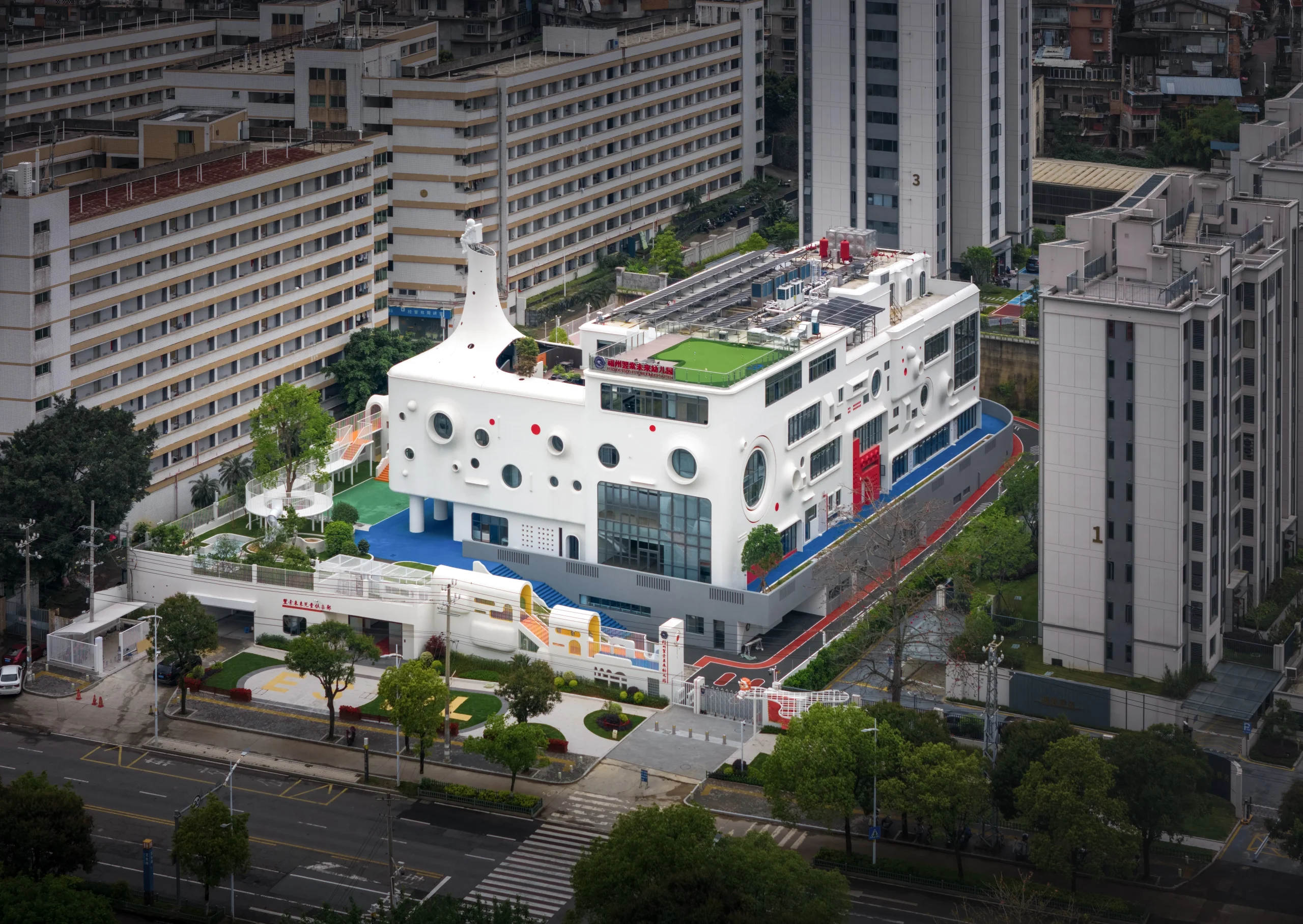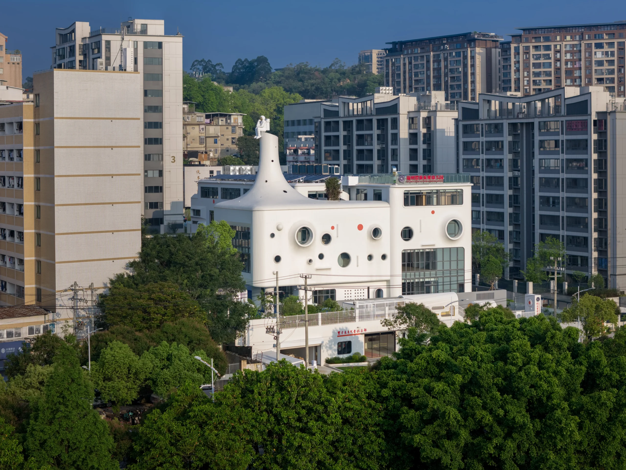 בעיר פוג’ואו שבסין, בלב מרקם עירוני צפוף, מתרומם גן ילדים יוצא דופן שתוכנן על ידי מרכז העיצוב האדריכלי Dika. בניגוד לקופסאות הגנריות המאפיינות מוסדות חינוך לגיל הרך, המבנה הלבן והפיסולי מדמה מבצר עתידני המרחף מעל הקרקע – הצהרה אדריכלית ברורה על חינוך הצופה קדימה.