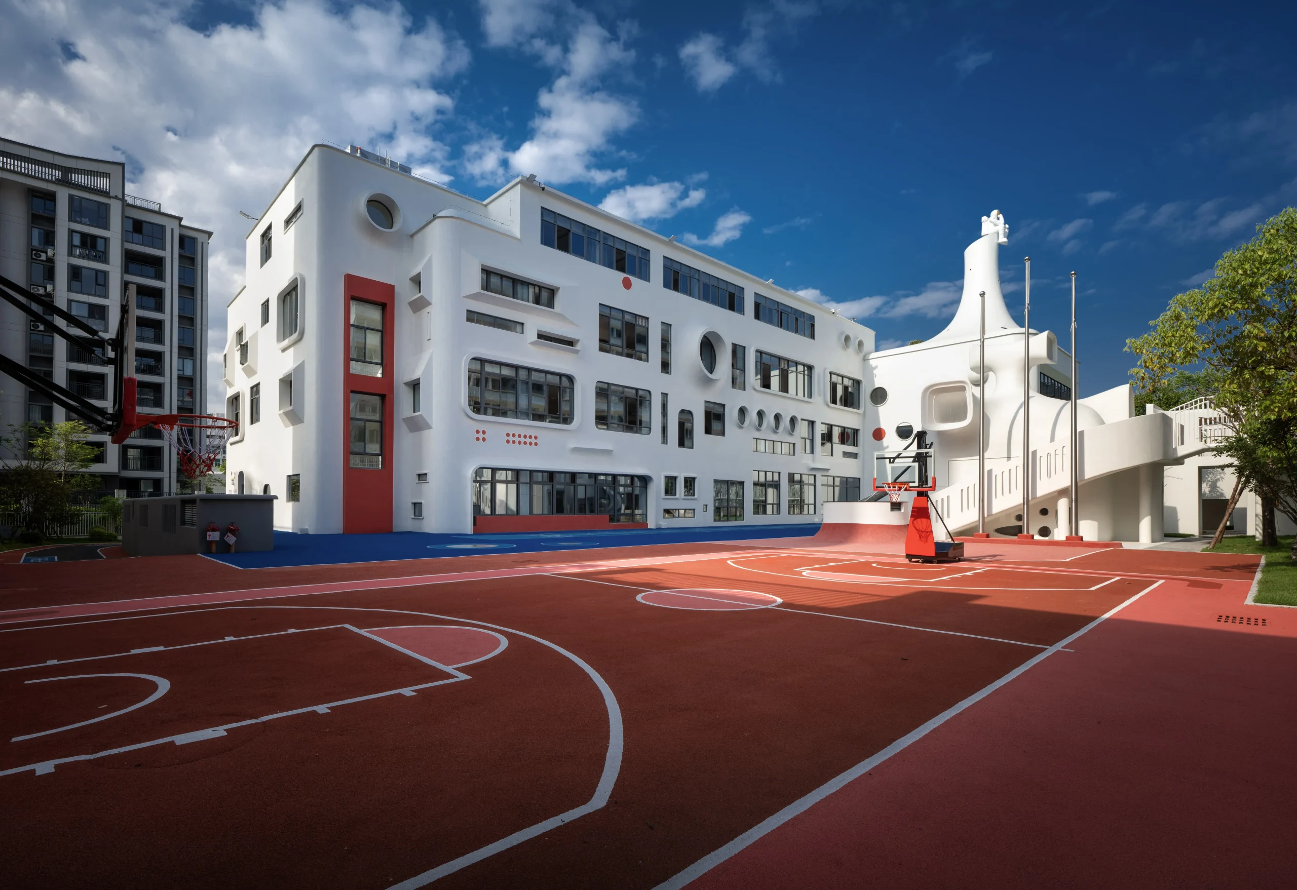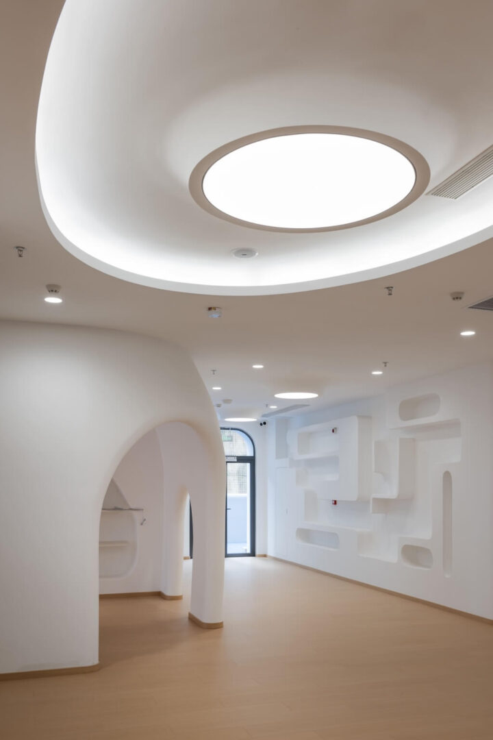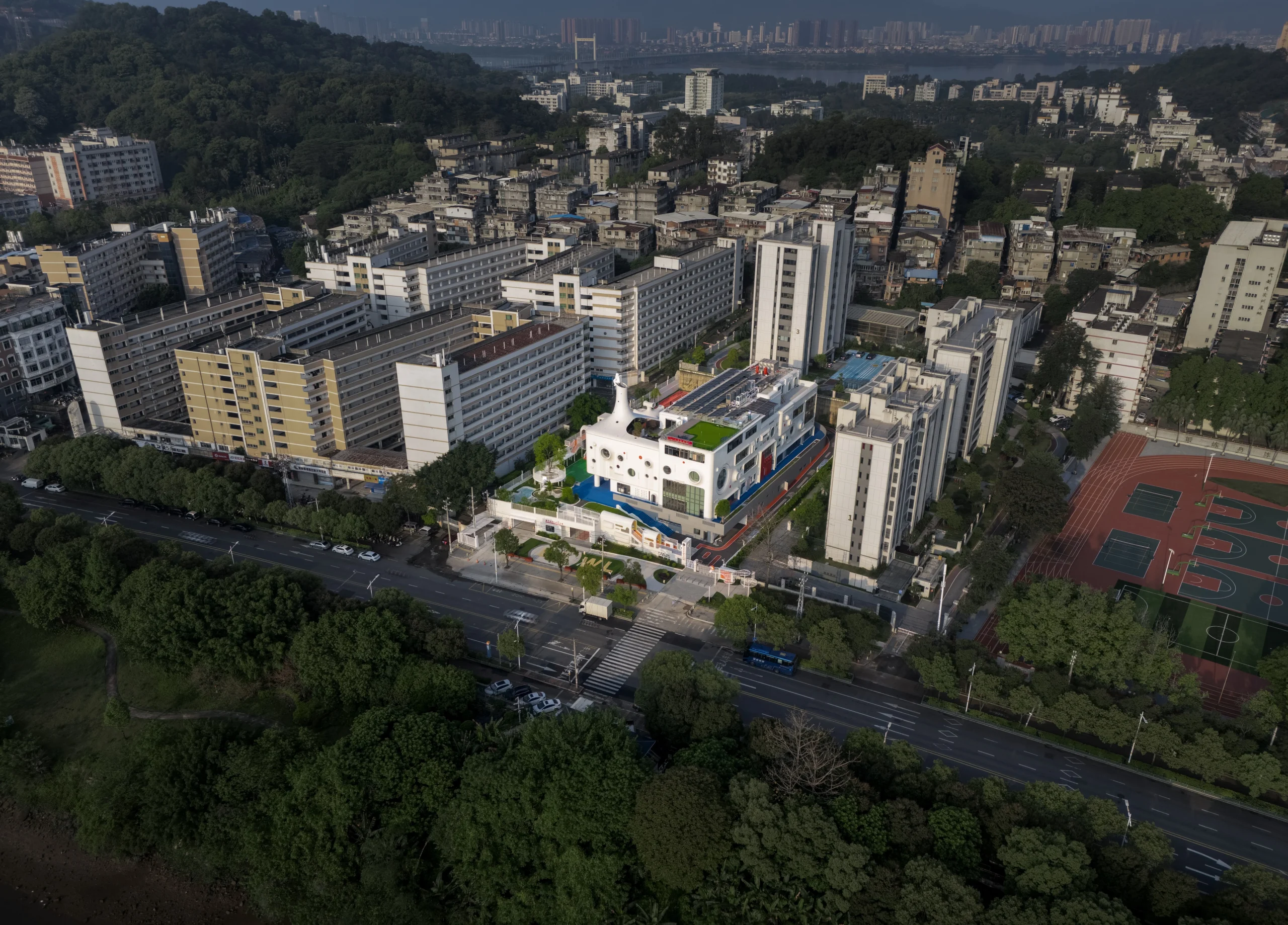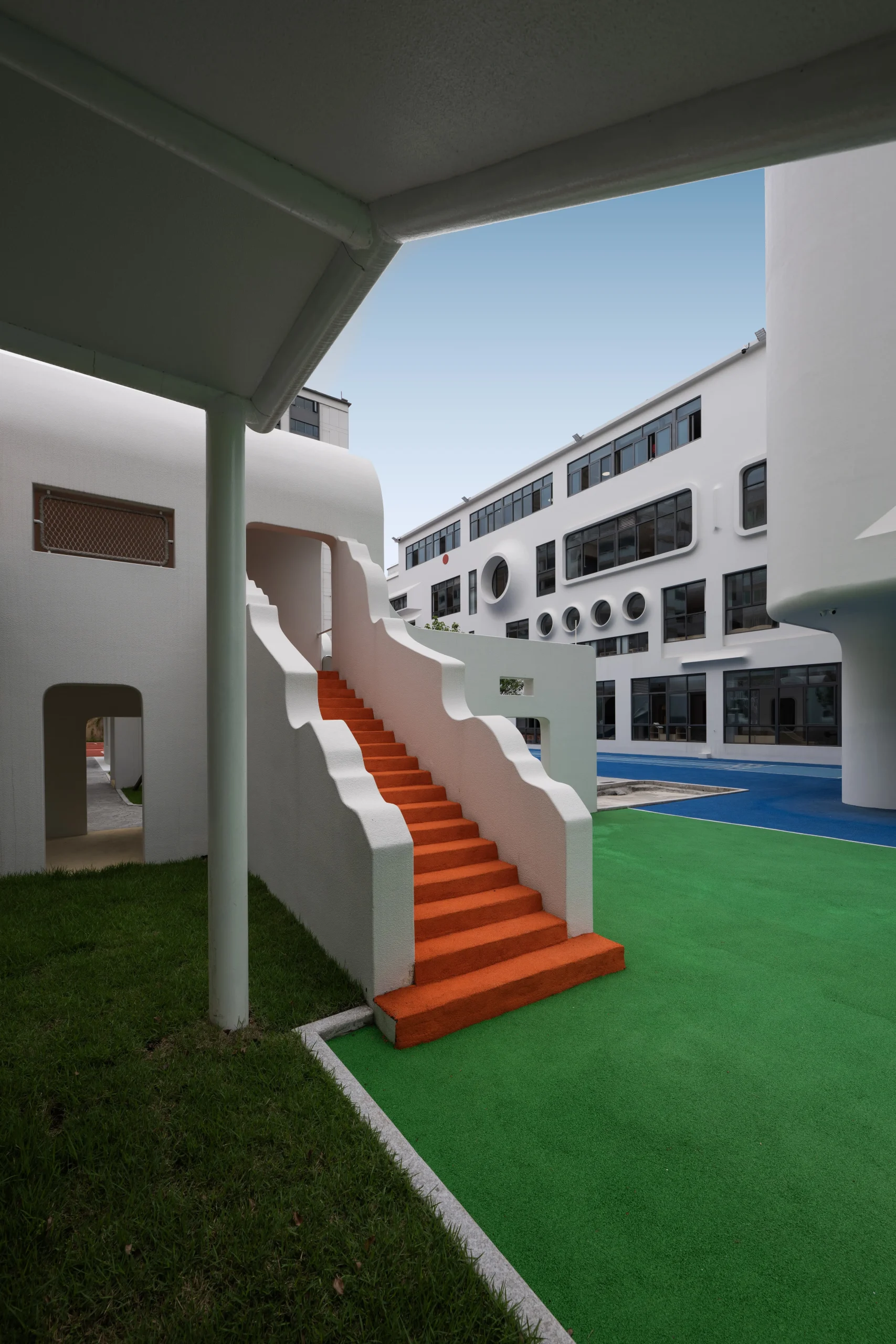 בעיר פוג’ואו שבסין, בלב מרקם עירוני צפוף, מתרומם גן ילדים יוצא דופן שתוכנן על ידי מרכז העיצוב האדריכלי Dika. בניגוד לקופסאות הגנריות המאפיינות מוסדות חינוך לגיל הרך, המבנה הלבן והפיסולי מדמה מבצר עתידני המרחף מעל הקרקע – הצהרה אדריכלית ברורה על חינוך הצופה קדימה.