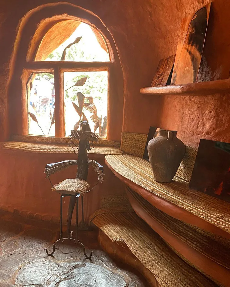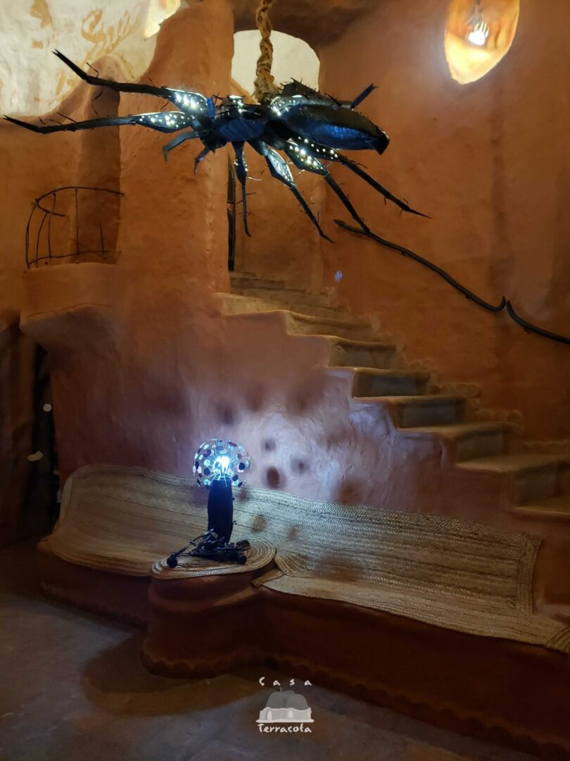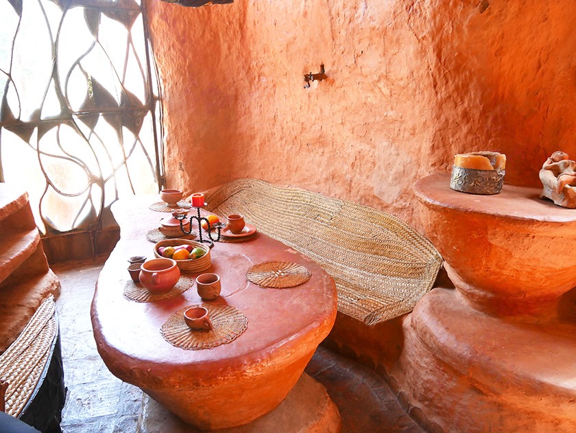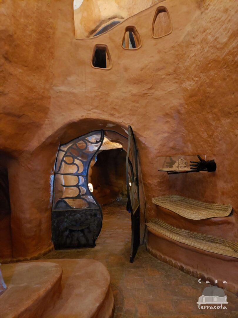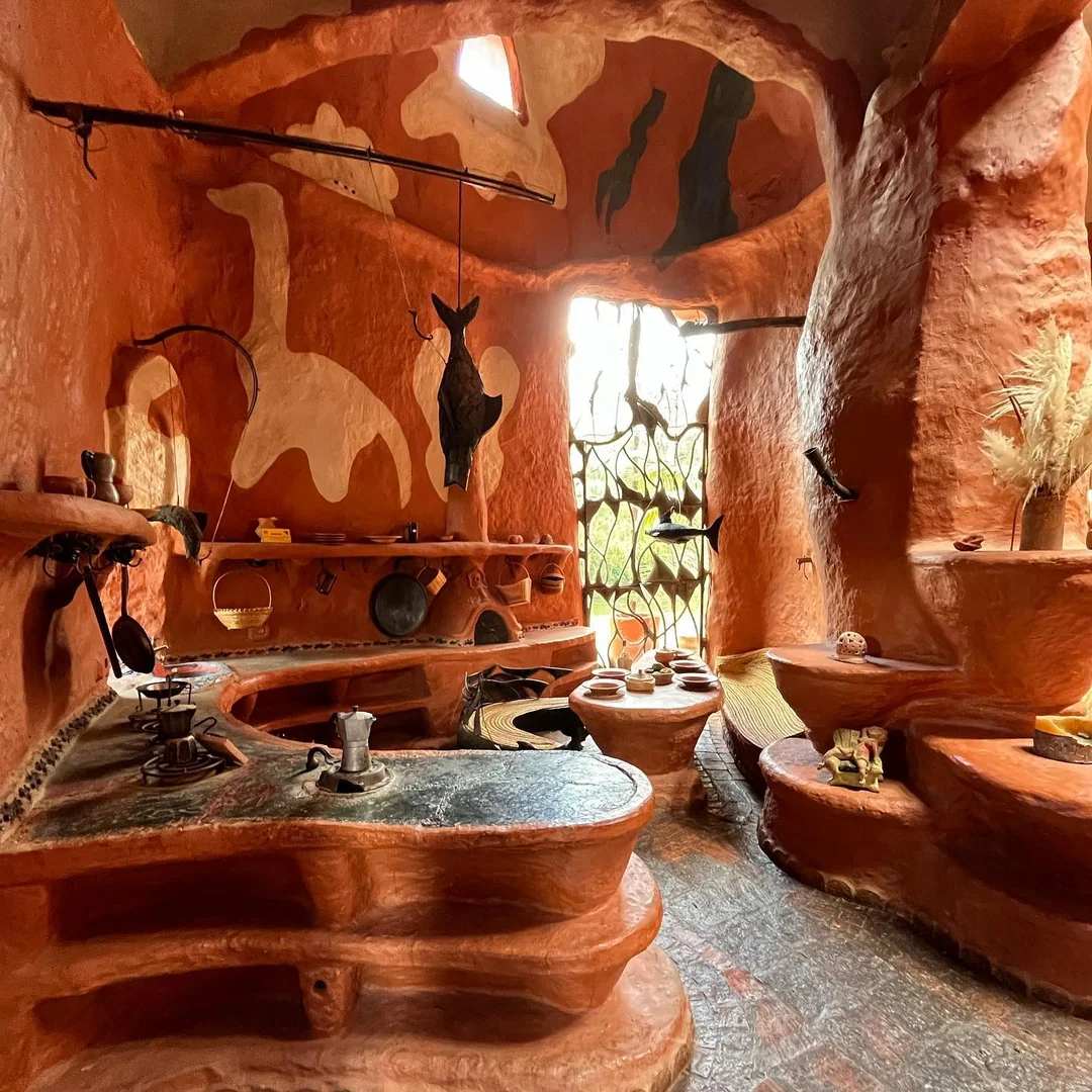 המבנה כולל שתי קומות עם חללי מגורים, חדרי שינה ופינות ישיבה, כאשר גם הריהוט – שולחנות, כיסאות ואפילו אלמנטים דקורטיביים – עשוי מאותו חימר מקומי. המטבח מתפקד באופן מלא עם כלים, פכים ואגרטלים שיוצרו בעבודת יד מאותו חומר, והבית כולו משדר אחידות חומרית יוצאת דופן.