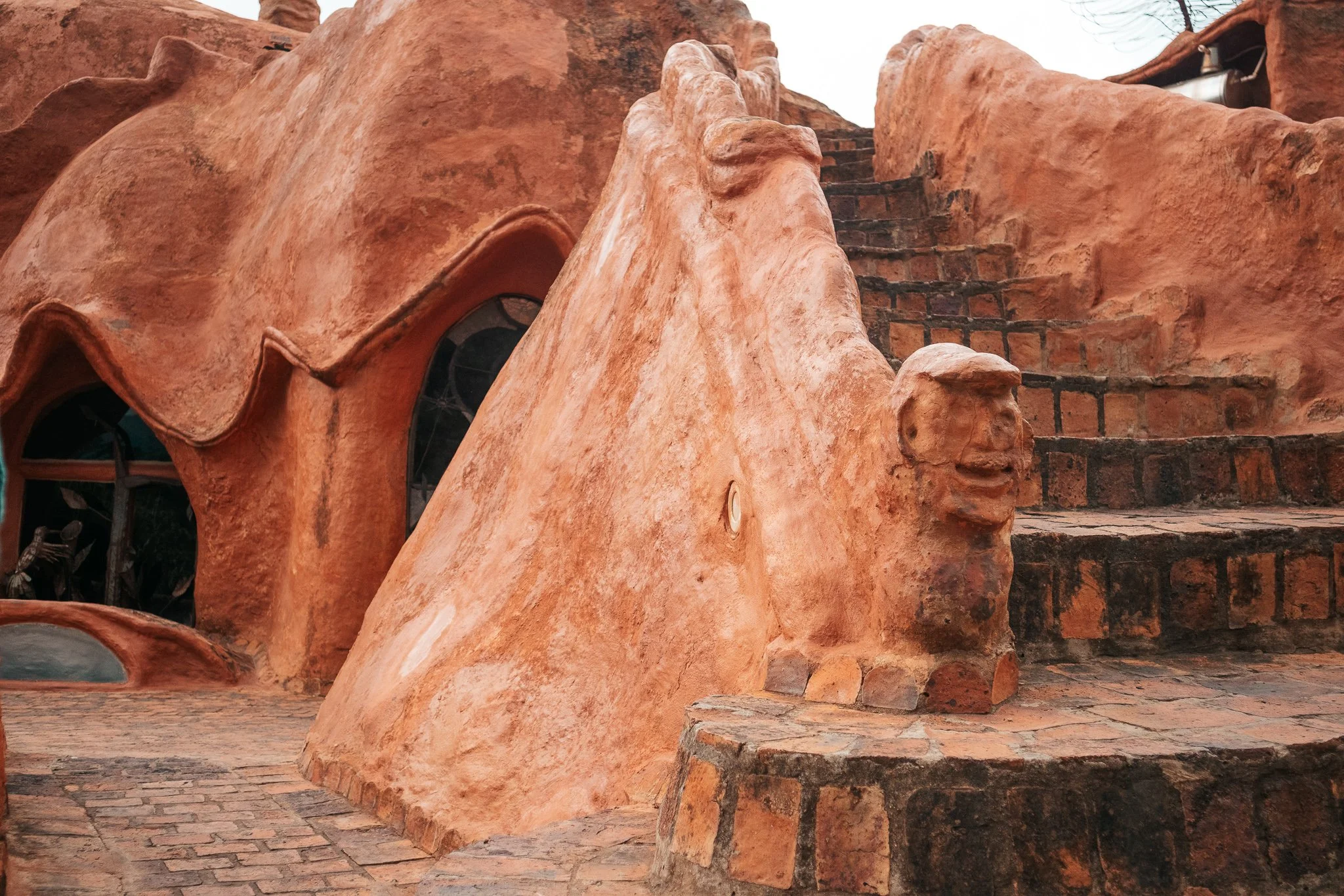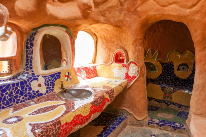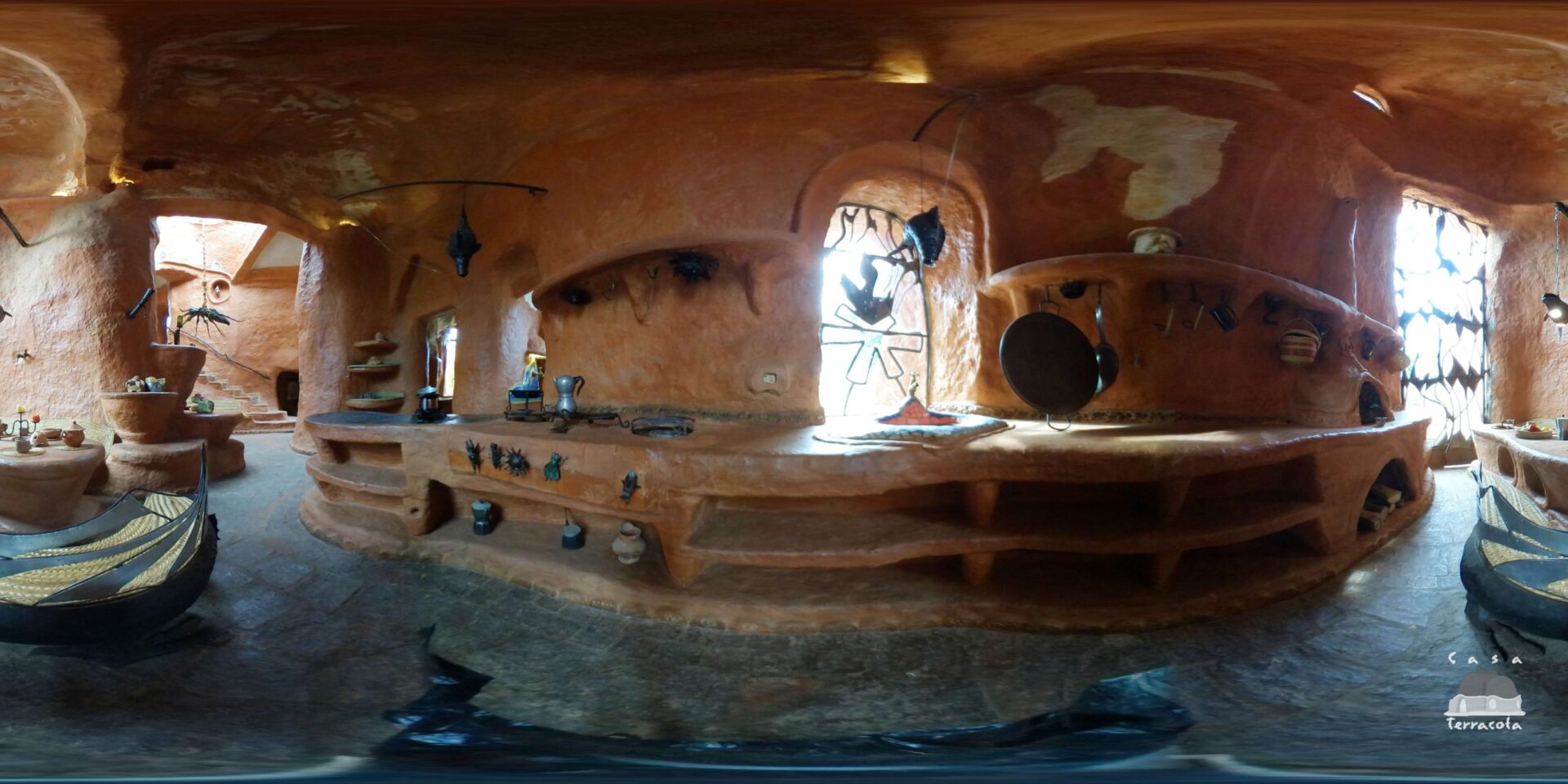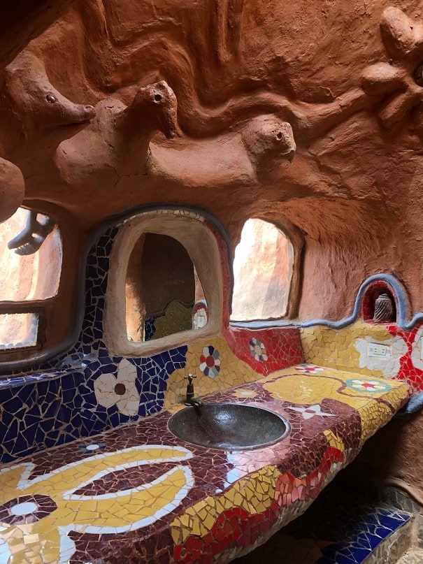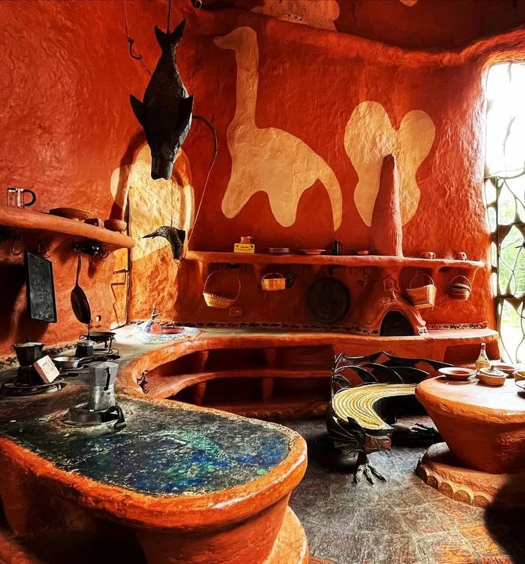 המבנה כולל שתי קומות עם חללי מגורים, חדרי שינה ופינות ישיבה, כאשר גם הריהוט – שולחנות, כיסאות ואפילו אלמנטים דקורטיביים – עשוי מאותו חימר מקומי. המטבח מתפקד באופן מלא עם כלים, פכים ואגרטלים שיוצרו בעבודת יד מאותו חומר, והבית כולו משדר אחידות חומרית יוצאת דופן.
