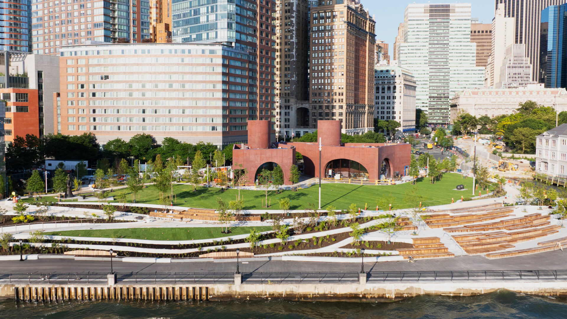 ביתן Wagner Park Pavilion שתכנן Thomas Phifer בניו יורק, נוצק מבטון אדום כאילו מגולף על ידי רוח הבאה מהחוף. עולים אליו דרך שני גנים משופעים, שסמטאות העצים שלהם מכינות את העין בקצב לפתחים הדחוסים ולקשתות המונומנטליות של האדריכלות. הביתן נושא את זיכרון הביצורים ההיסטוריים של נמל ניו יורק, סופג את המסה והחמימות בגוון הלבנים שלהם מבלי לצטט אותם ישירות.