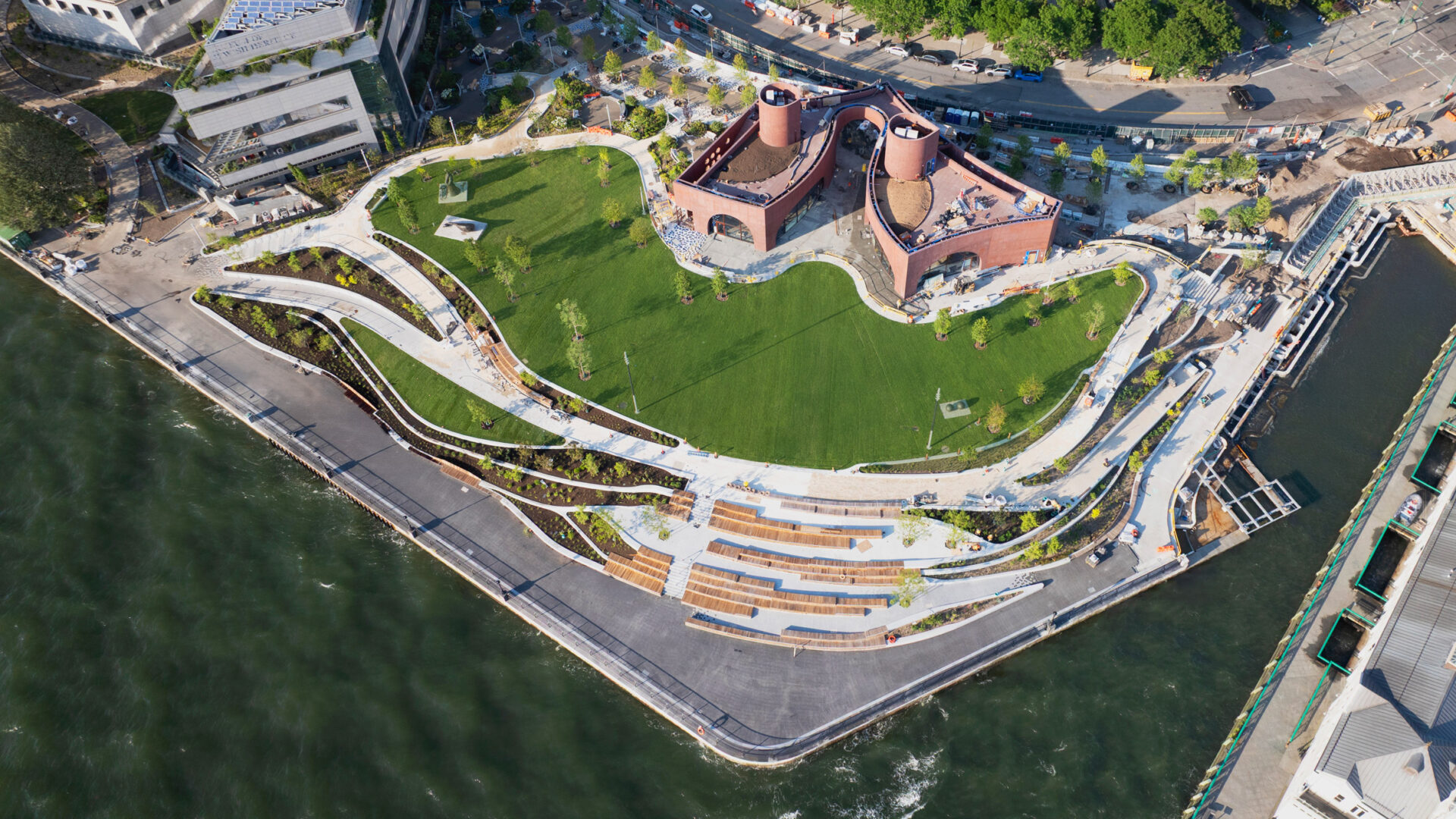 מבחינה תוכניתית, הביתן מעוגן על ידי מסעדה וכיתת לימוד, שניהם נפתחים החוצה אל פיאצה תוססת הנשפכת אל הגנים הסובבים. סף נקבובי זה מטשטש את החיים הפנימיים והחיצוניים, מעודד התעכבות ומאפשר לקנה המידה המונומנטלי של הבניין להתקיים יחד עם אינטימיות אנושית. מעל, מרפסת תצפית מעניקה פנורמה של 360 מעלות: סטטן איילנד נסחפת במרחק, מרכז העיר מתנשא פנימה, פלטת הצבעים המשתנה של הנמל נפרשת בגובה העיניים. נטיעות העוטפות את קצה הגג ממיסות את הקו בין אדריכלות לנוף, מהדהדות גנים סמוכים ומרככות את צללית הביתן.