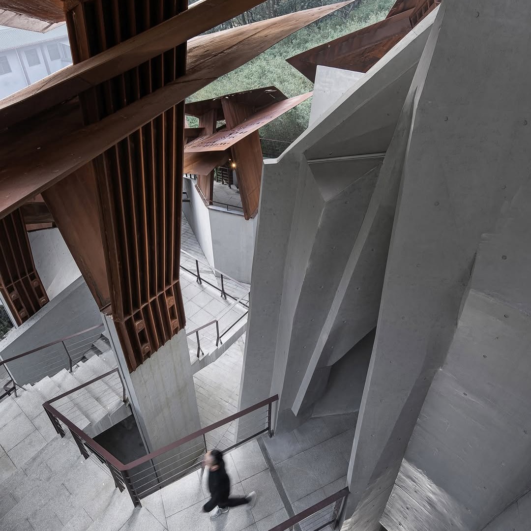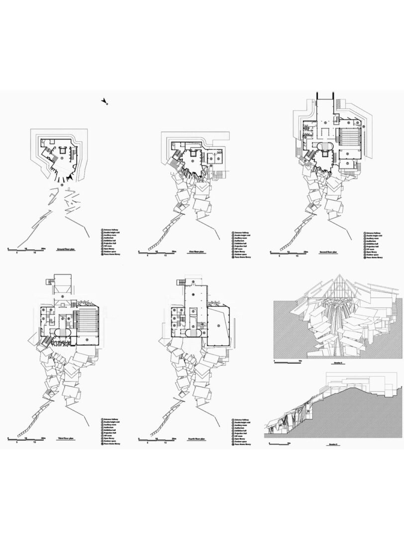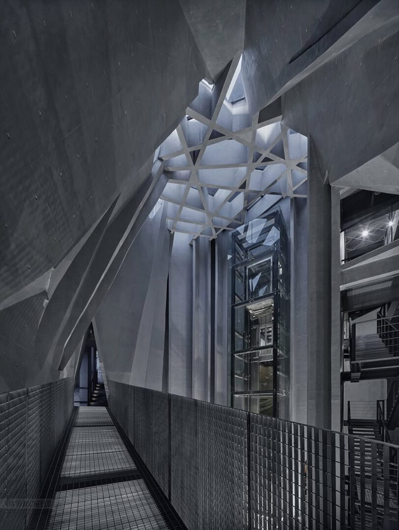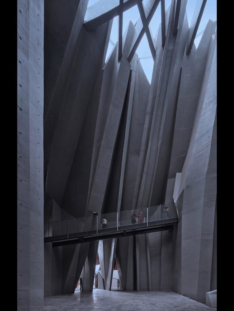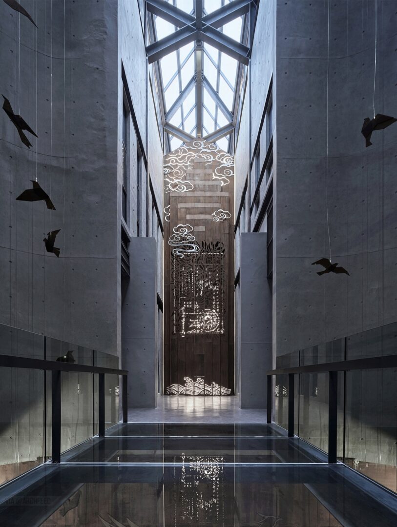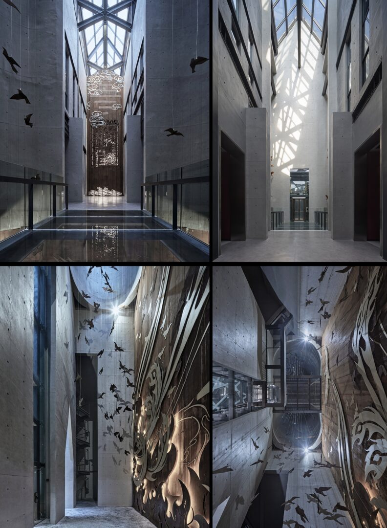 לאולם הכניסה יש צורת A, היוצרת תחושת לחץ כאשר החלל נדחס. אור השמש נשאר נוכח בחלק העליון של כניסה צרה ומוארכת זו, מפעיל ומעצב מחדש את החוויה המרחבית. בשילוב עם ליבות תנועה עומדות, לובי תאורה עילי, גלריית נושא, חדר הקרנה ולובי יציאה מחוברים לסדרה של חללים עצמאיים. כאשר הנוסעים עוברים במעלית לקומות העליונות, מתעוררת בהדרגה תחושת חופש – כמו מסע טרנספורמטיבי מדיכוי לשחרור.