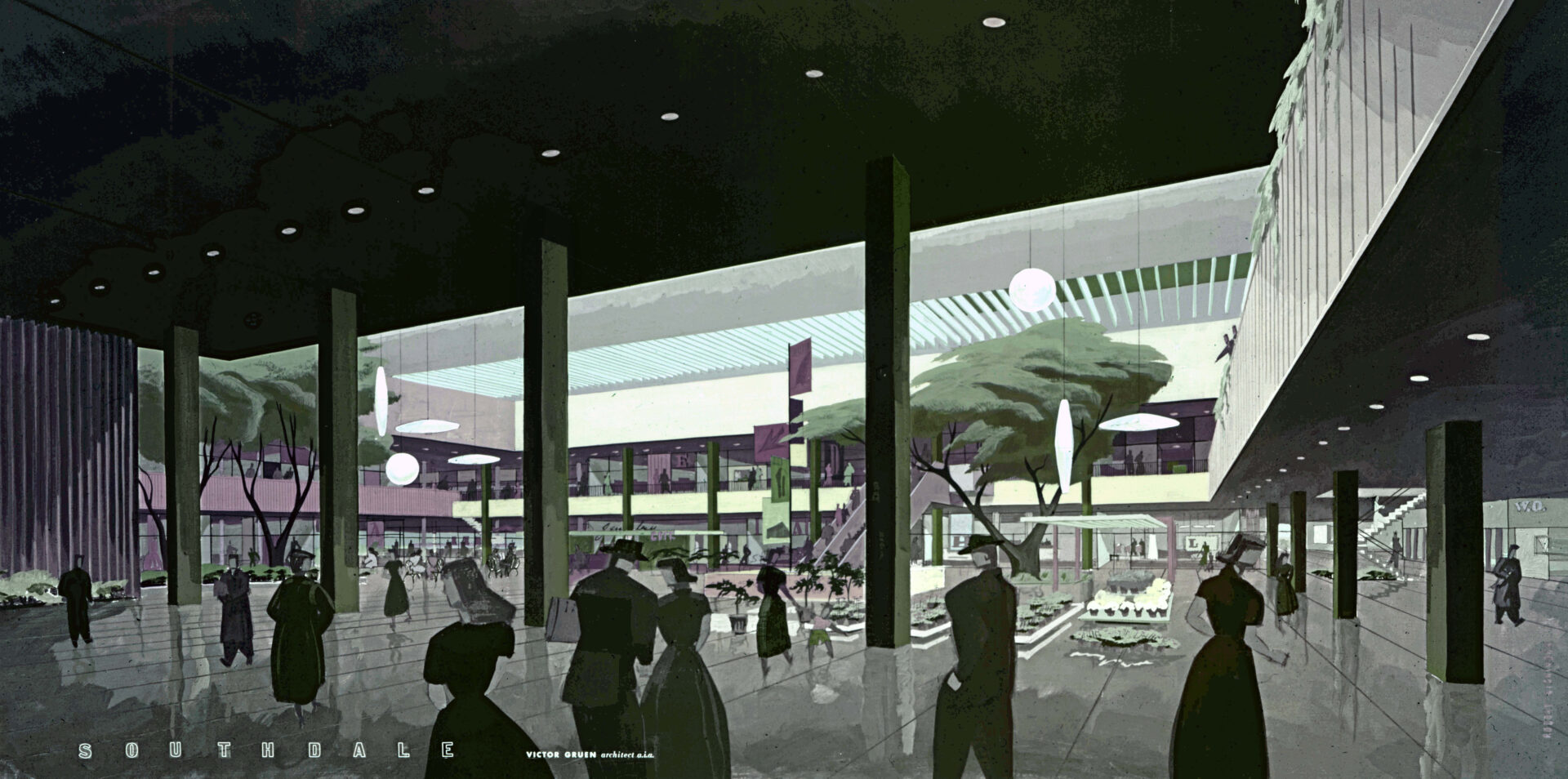 בסוף שנות ה-40 ובתחילת שנות ה-50, החל גרין לפתח עיצובים שאפתניים יותר וב-1956, חודשים ספורים לאחר שדיסנילנד פתחה את שעריה בקליפורניה, השלים גרין את עבודתו במרכז Southdale. הוא תכנן את סאות'דייל כמבנה דו-קומתי, המקושר בין מדרגות נעות מנוגדות, שמציעות כמה עשרות חנויות סביב חצר משותפת, מוגנות מפני מזג האוויר על ידי קורת גג. חיקוי לאולמות האירופיים שגשגו בווינה ובערים אחרות בתחילת המאה ה-19. אבל בעין המודרנית, מרכז סאותדייל הוא ללא ספק קניון.
