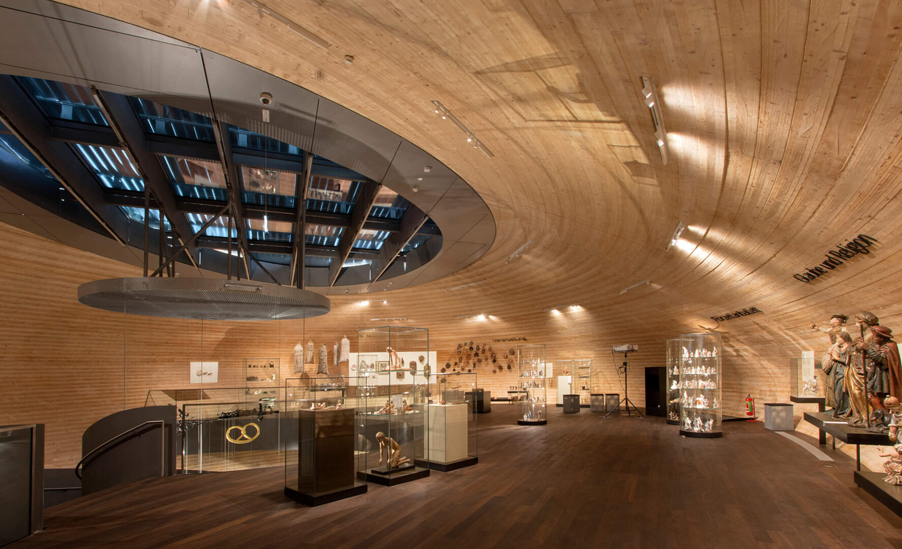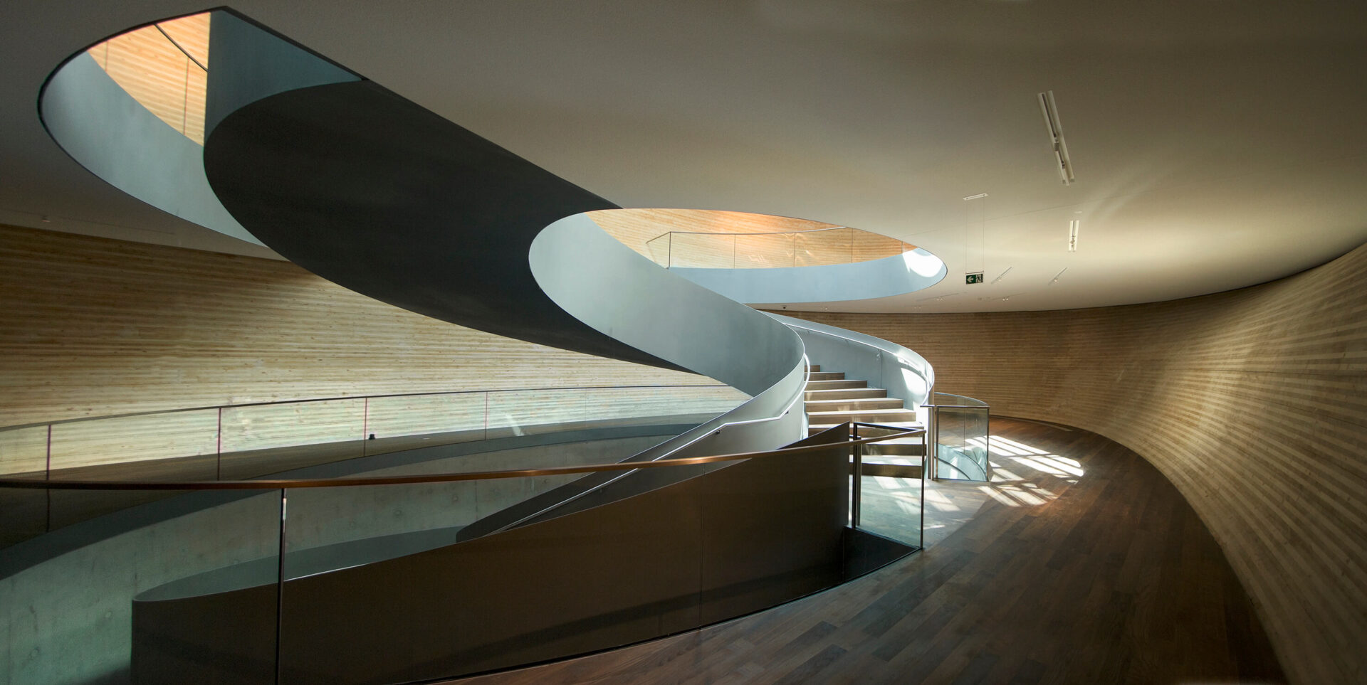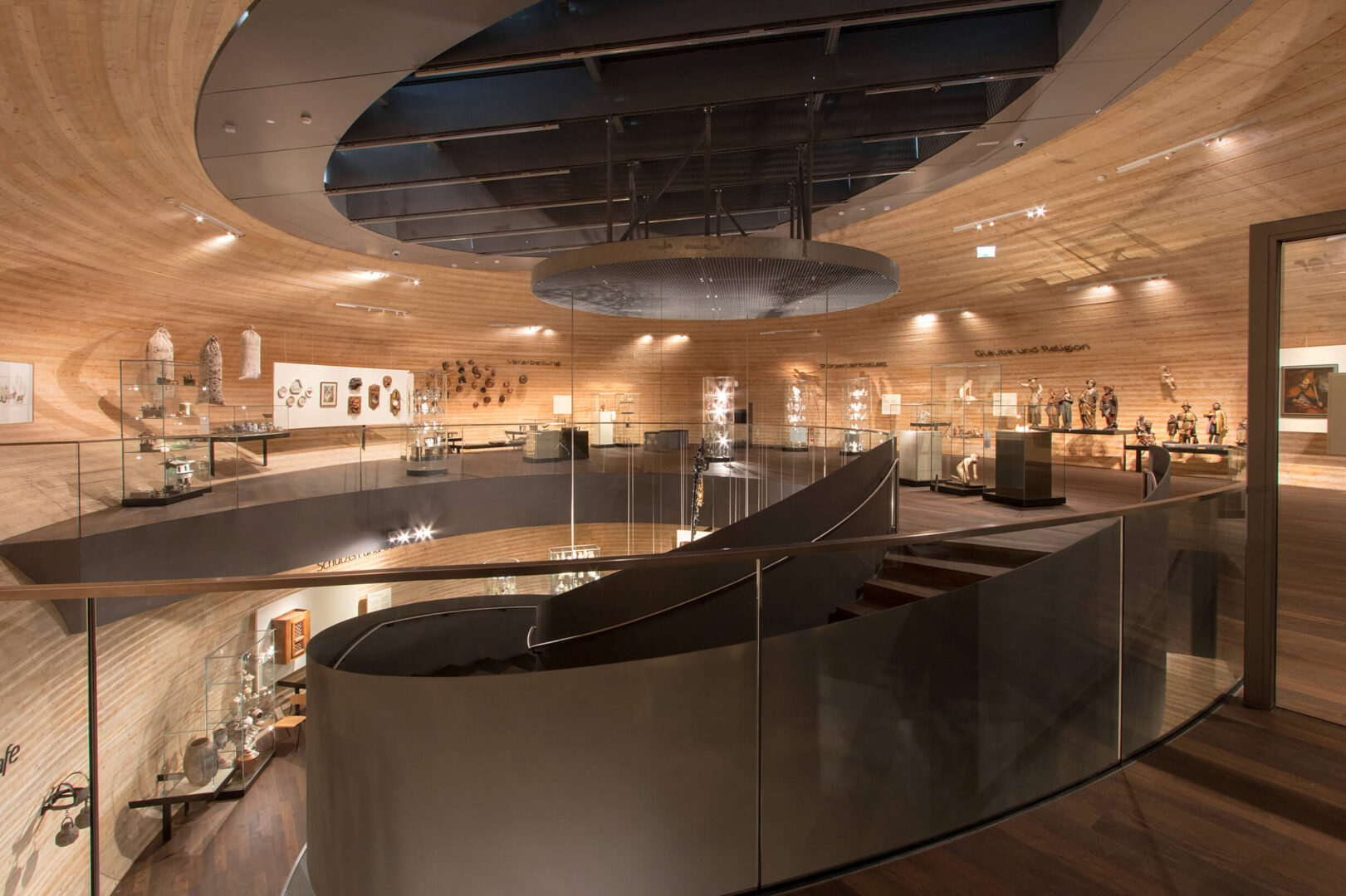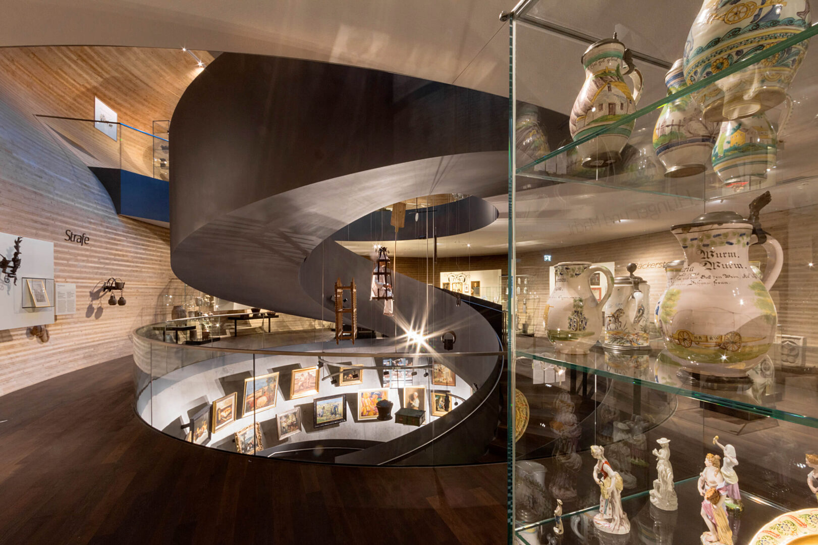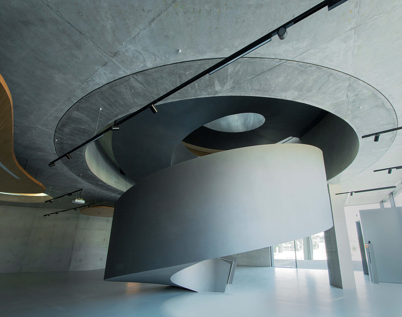 בלב החלל העליון נוצר אטריום עגול דרמטי, שבו פריטי האוסף תלויים מהתקרה כמו נברשת מפורקת. גרם מדרגות ספירלי עוטף את החלל ומאפשר מבט משתנה על האובייקטים מכל זווית, תוך תנועה רציפה בין הקומות.