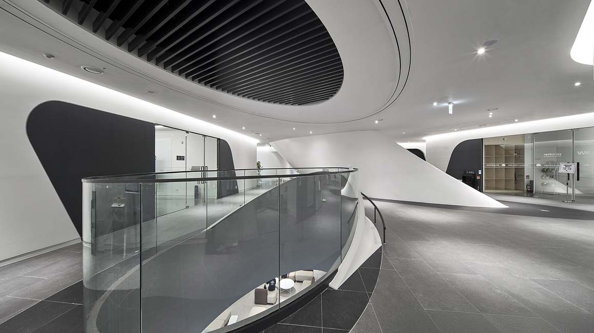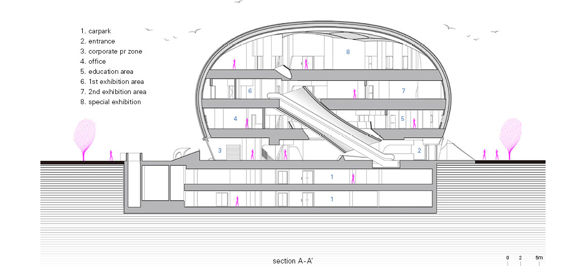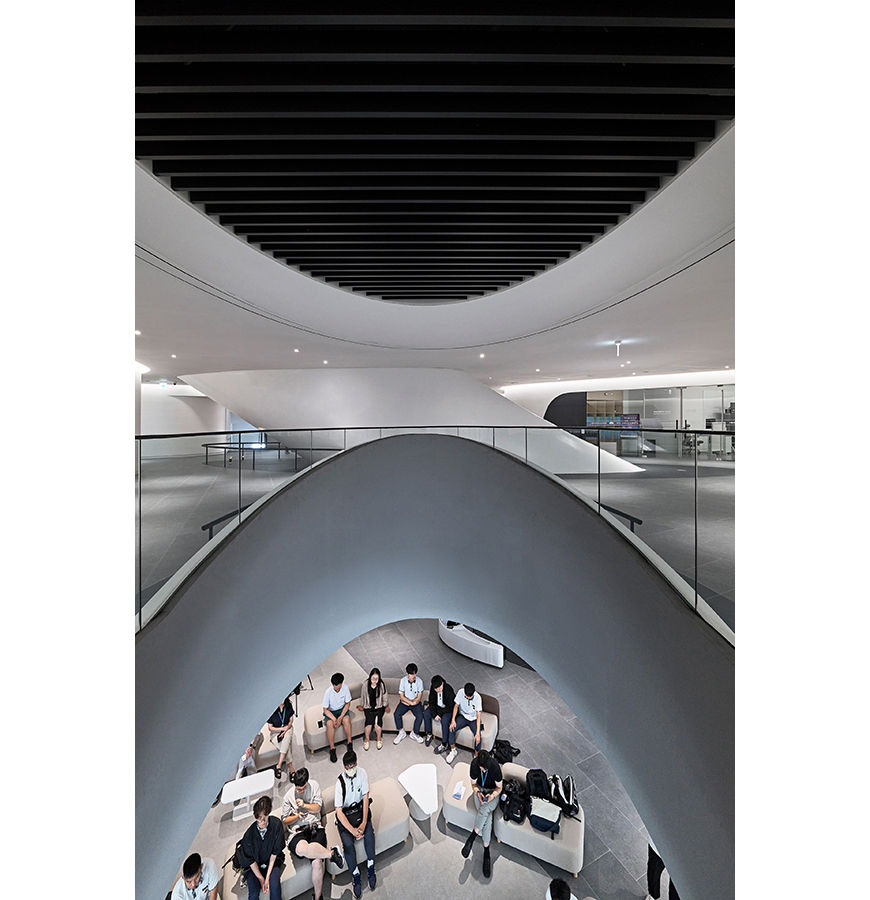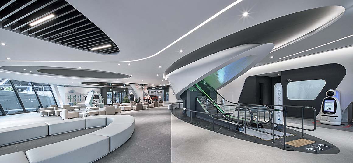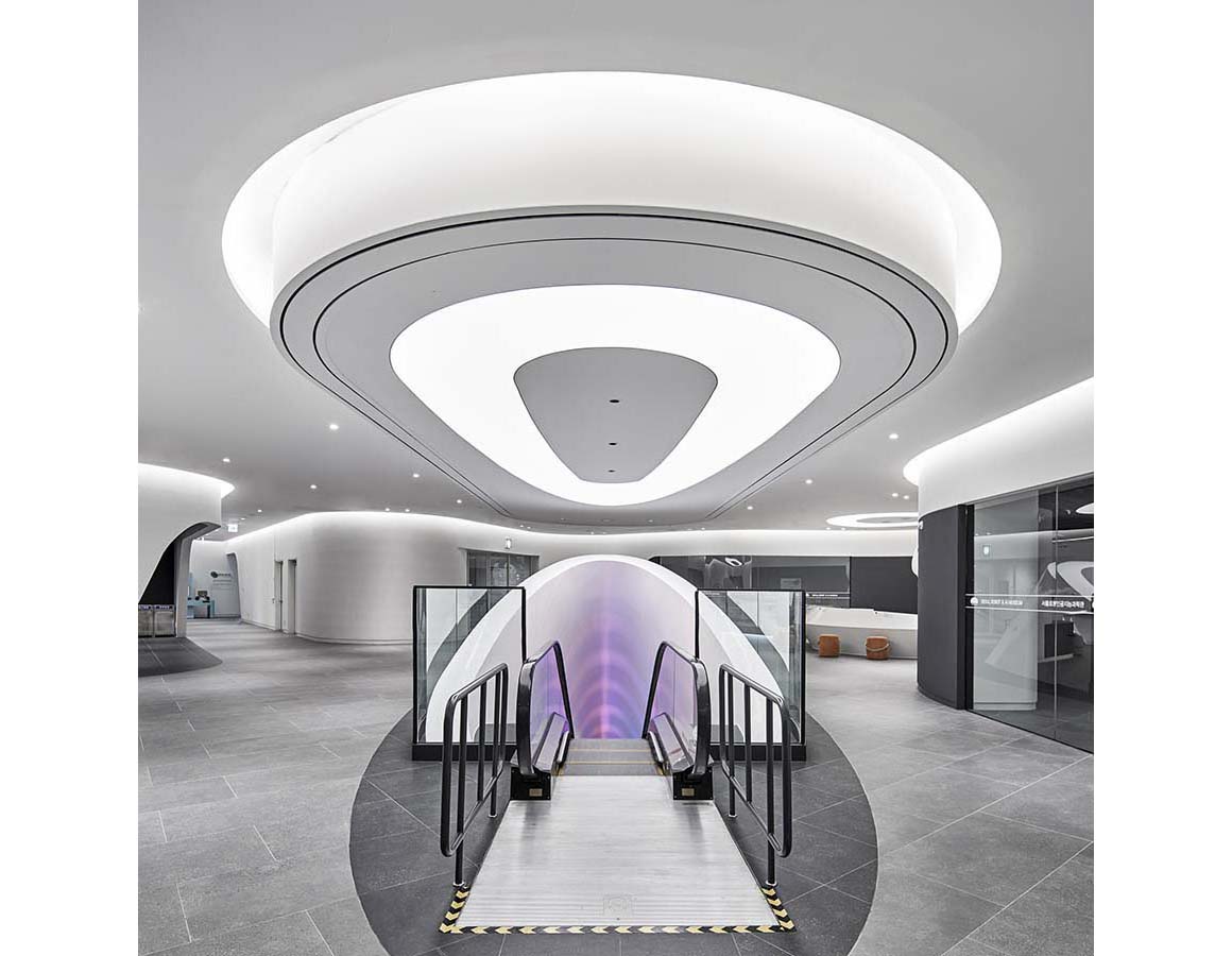 גם הפנים לא פחות מרשים: חללים זורמים ומעוגלים ממשיכים את השפה החיצונית, עם חלוקה פונקציונלית הכוללת אזורי תצוגה, חללי לימוד ומרחבים ציבוריים. אחד המאפיינים הייחודיים הוא דרגנוע צינורי, שמחבר בין הקומות ומזכיר טכנולוגיות מעולם התעופה והספנות.