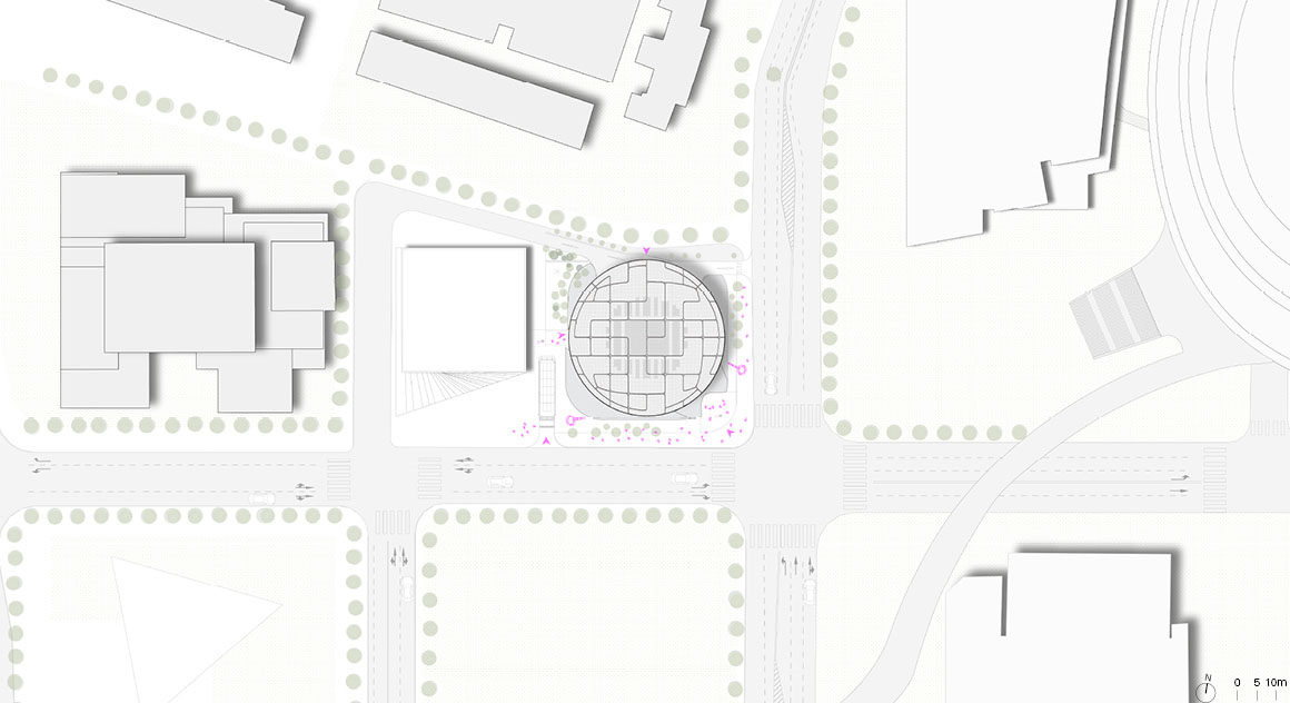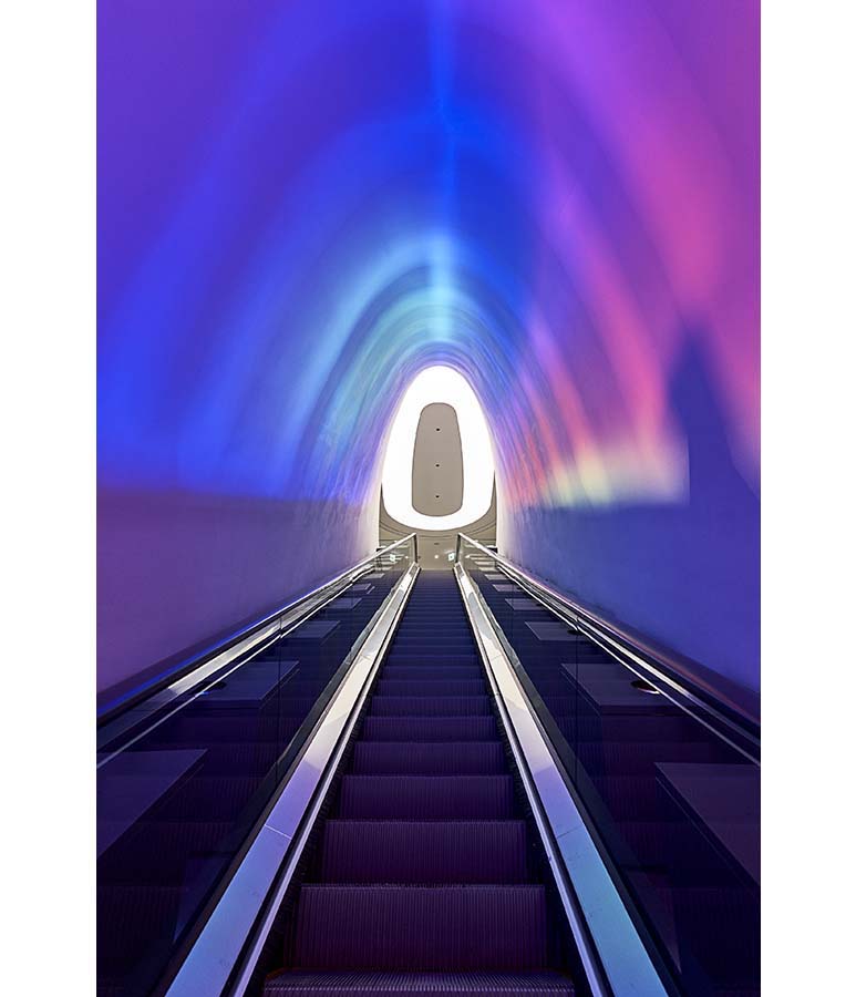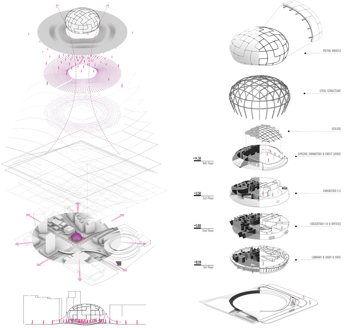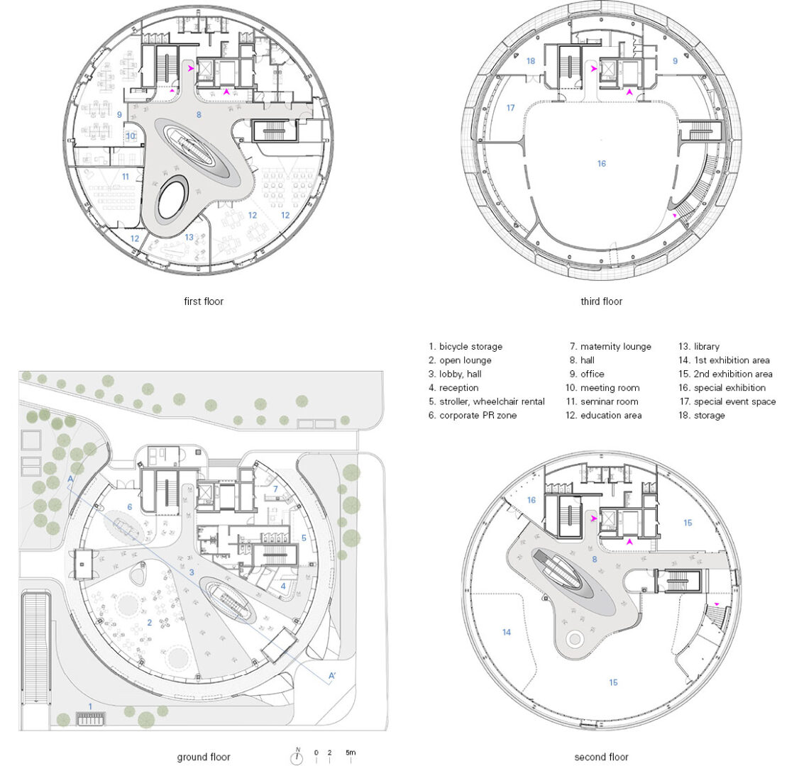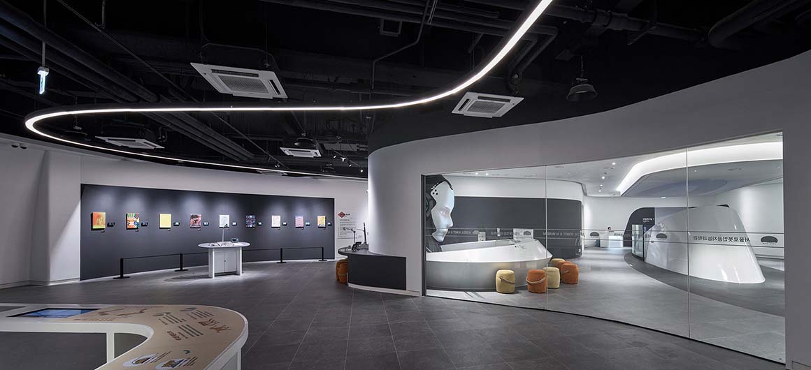 גם הפנים לא פחות מרשים: חללים זורמים ומעוגלים ממשיכים את השפה החיצונית, עם חלוקה פונקציונלית הכוללת אזורי תצוגה, חללי לימוד ומרחבים ציבוריים. אחד המאפיינים הייחודיים הוא דרגנוע צינורי, שמחבר בין הקומות ומזכיר טכנולוגיות מעולם התעופה והספנות.