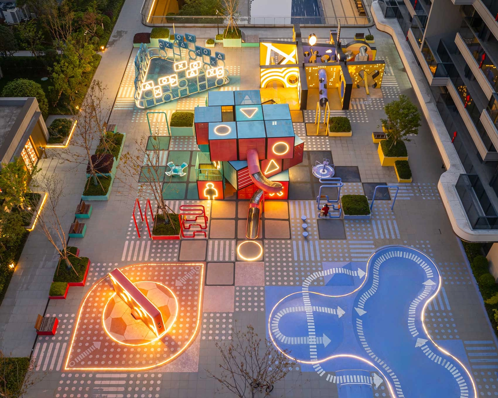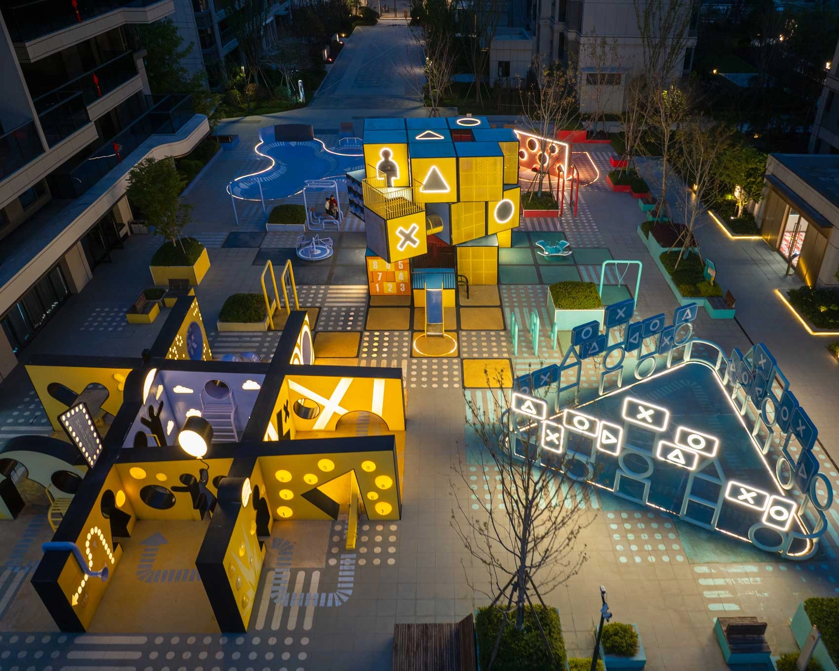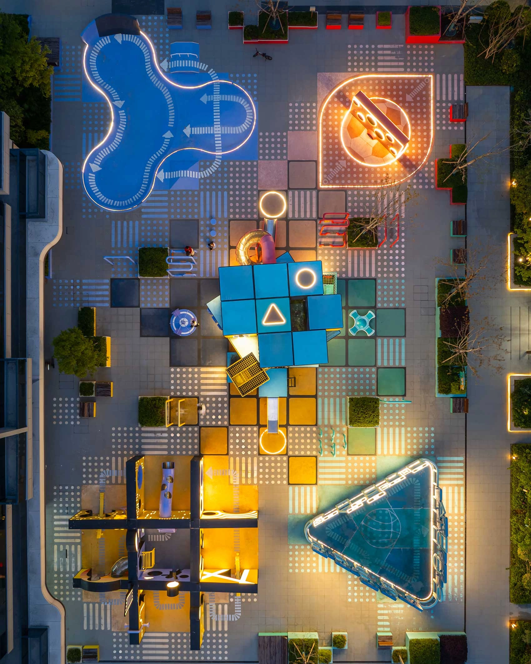 כיכר "הקוביה ההונגרית" (רוביקס) שתכננו 100architects, נוף עירוני אינטראקטיבי של משחק ואור, הממוקם ברובע מגורים בפוג'ואו, סין. הפרויקט משלב מבנים גיאומטריים, מתקני ספורט ועיצוב תאורה כדי ליצור חוויית משתמש רציפה הנעה בין פעילות בשעות היום לתאורת הלילה. במרכז החלל נמצא מבנה בן שלוש קומות בדומה לקוביית רוביק. אלמנט זה מתפרש מחדש כנפח הניתן לתפוס, המאפשר תנועה דרך מדרגות, פלטפורמות ומשטחים התומכים בטיפוס ובתנועה. המבנה מספק נקודת מוקד מרחבית ומשמש כמתקן משחק אנכי.