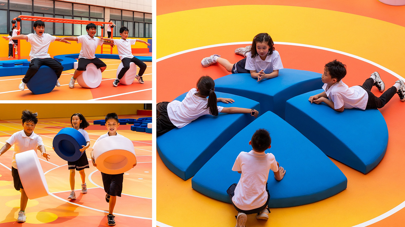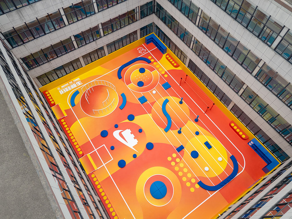 LEGO ו-NIKE משתפות פעולה כדי לעצב את בית הספר היסודי בשנחאי כמגרש משחקים ספורטיבי מודולרי. העיצוב שואב השראה מהצורה וההיגיון של לבני LEGO פשוטות בגודל 2×3, ומתרגם את המודולריות שלה לפונקציות מרחביות ואתלטיות. עיצוב: Build the Change by LEGO China