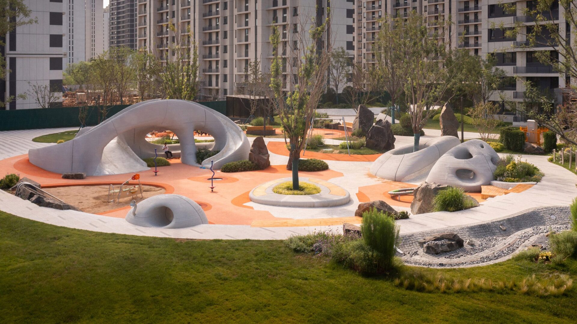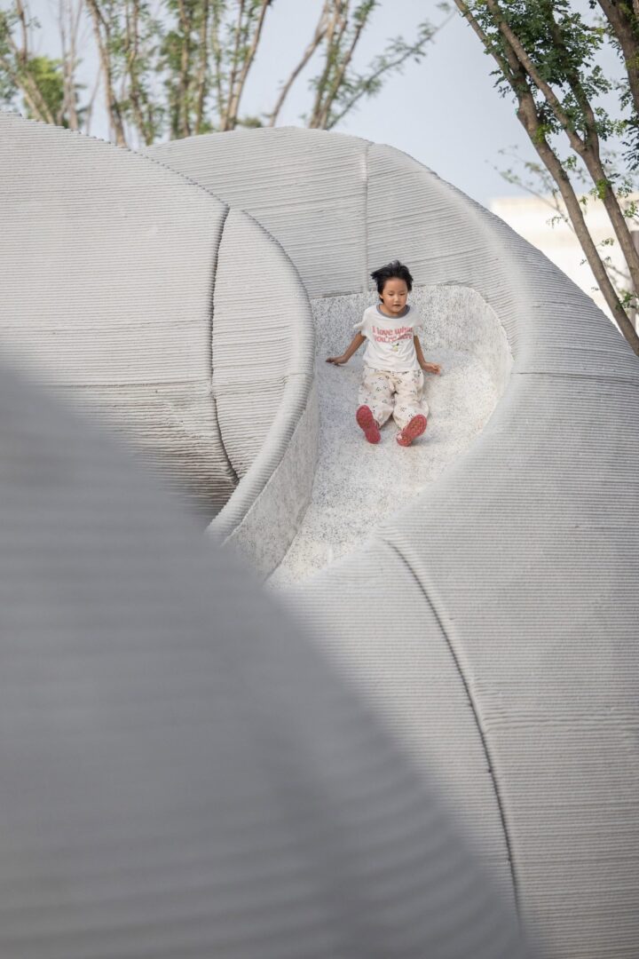 מערות בטון מודפסות בתלת-ממד דומות לתצורות אבן בגן שעשועים סיני מאת XISUI design. פארק הסלעים, גן שעשועים המשתרע על פני 4,000 מטרים רבועים ובמרכזו דמות הסלע כמוטיב מרחבי חוזר. צורות אלו, הפזורות ברחבי האתר, מתפקדות כמתקני משחק ואלמנטים נופיים. המבנה הבולט ביותר הוא מיצב דמוי מערה עם משטחים שכבתיים וגיאומטריה חופשית הדומות לתצורות אבן שחוקות, שנוצרו באמצעות הדפסת בטון תלת-ממדית בקנה מידה גדול. סלעים מסיביים מסודרים מעל ארגז חול ליצירת מבני טיפוס, הזזה וישיבה. מאפיינים סלעיים אלה, בין אם אמיתיים או דיגיטליים, יוצרים את המסגרת לנדנדות, טרמפולינות, נדנדות, מנהרות טיפוס וצינורות דיבור. גן היער הסמוך משלב צמחייה מקומית עם שבילים מתפתלים ומתקני משחק טבעיים, שבהם ילדים מקיימים אינטראקציה עם הסביבה, מפתחים מיומנויות מוטוריות ומודעות קוגניטיבית לאיזון, קצב והתמצאות מרחבית.
