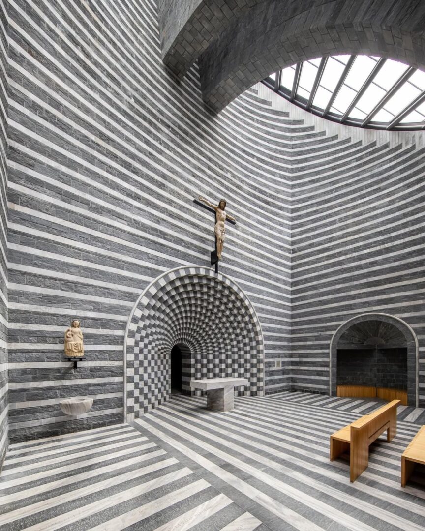 למרות שההיכל החדש שומר על ממדים הצנועים יחסית, הוא מציג חזות ושפה חדשות: ממד עכשווי המקבל משמעות ארכאית בזכות יחסי הגומלין של צורות – מלבן בתוך אליפסה חיצונית, המשתנה למעגל כשהיא מגיעה לגג. קיר האבן העבה וגג הזכוכית הבהירה, מעניקים למבנה תחושה של הגנה מפני אסון עתידי אפשרי. ככלל, המבנה ניראה כמו פרשנות מודרנית למצודות שישבו איתנות על פסגות הרים. הכנסייה נבנתה באבנים מקומיות כדי לבטא תכונות מונומנטליות. האבן אינה משמשת כחיפוי חיצוני אלא כחומר מבני. הכנסייה נבנתה באבנים מקומיות מעמק מגיה: הגניס (סוג של סלע הדומה לגרניט, נקרא גם beola) וגם השיש. חומרים אלה שימשו גם בכמה קתדרלות רומנסקיות טוסקניות.