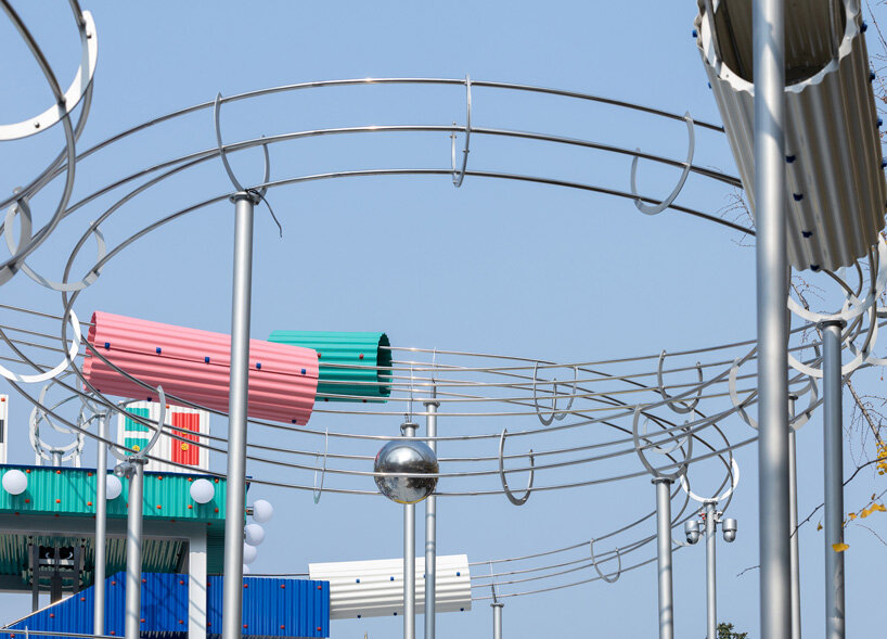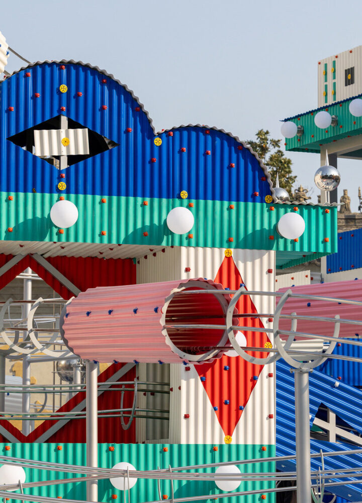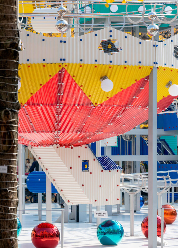 חמש הצורות הפיסוליות מפרשות מחדש פעילויות מקומיות מוכרות, אכילת נקניקייה חמה, ביקור בבתי תה, משחק מה-ג'ונג, צפייה באופרה סצ'ואן וסקי בהרים הסמוכים, ל"פסלים אדריכליים" בדיוניים. זיכרונות אלה מעצבים הן את מראה המבנים והן את המסלולים הספציפיים של הכדורים המתגלגלים, והופכים התייחסויות תרבותיות לחוויות מרחביות וקינטיות. המיצב, הבנוי מלוחות PVC גליים רגילים, שומר על שפה חומרית יומיומית תוך השגת גימור מדויק ומעוצב בקפידה. "פאן פאלאס" מציע בסופו של דבר תפקיד קליל ושובב יותר לאדריכלות במרחב הציבורי, כזה שמזמין סקרנות וחוויה משותפת בתוך המרקם העירוני העכשווי.