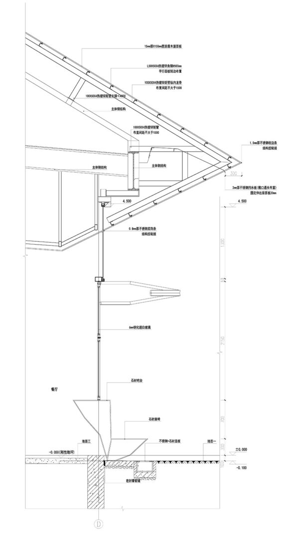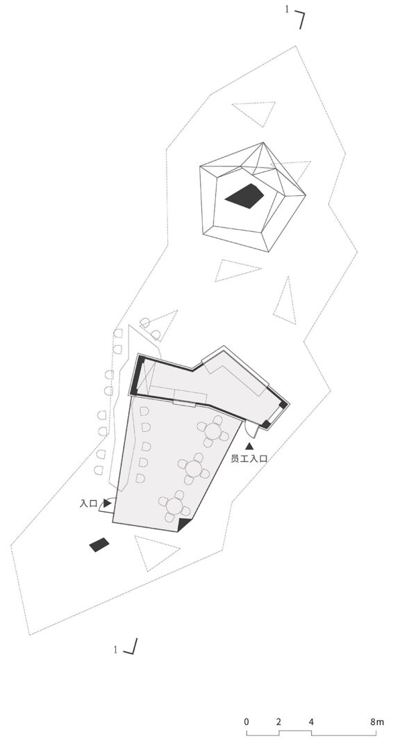 כדי לגרום לגג השכבתי, דמוי ההר, להיראות כאילו הוא קופץ מהקרקע, המבנה הראשי של הבניין נתמך על ידי ארבעה אשכולות של עמודי פלדה מרוכבים. עמודים אלה מצופים פאנלים של אבן שחורה, כאשר חלקים מהחיפוי מורחבים ליצירת מאפיינים פונקציונליים כגון מקומות ישיבה בחוץ, דלפקי טייק אווי ותחנות רחצה. הגג מאמץ מבנה שלד פלדה כדי להשיג פתחים ארוכים וקנטיליברים. כל החלק החיצוני שלו מצופה ברצועות עץ מלא, המשולבות בפתחים משולשים המכילים גם תאורה פנימית ופתחי מיזוג אוויר. ציוד גדול, כגון מערכות מטבח ומערכות מיזוג אוויר, מוסתר לחלוטין בתוך מבנה הגג.