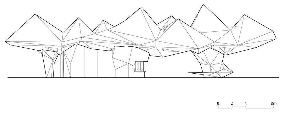 כאשר המבקרים הולכים על פני מדרון מכוסה עשב, המבנה נפרש לפתע לפניהם – כרכים עצומים מעץ מלא צפים מעל הקרקע, עם פירמידות משולשות המחברות ידיים, מתנדנדות ורוקדות. ילדים יתלהבו ממראה הצורה העצומה הזו, הממהרת לעבר הגג הקנטיליברי המשתרע על פני יותר מעשרה מטרים. הבניין, המזכיר חללית מוכנה להמראה, מעלה שוב את מצב הרוח והתחושות של המבקרים לשיא. ההורים שעוקבים אחר ילדיהם נהנים מזמן פנוי, משוחחים מתחת לגג, המשתרע כמו עץ ענק. כשילדיהם רצים ומשחקים לפניהם, ההורים קוראים להם מדי פעם לנוח ולשתות. מאחורי הזכוכית השקופה לחלוטין, המסעדה ובר המים שוקקים גם הם פעילות.
