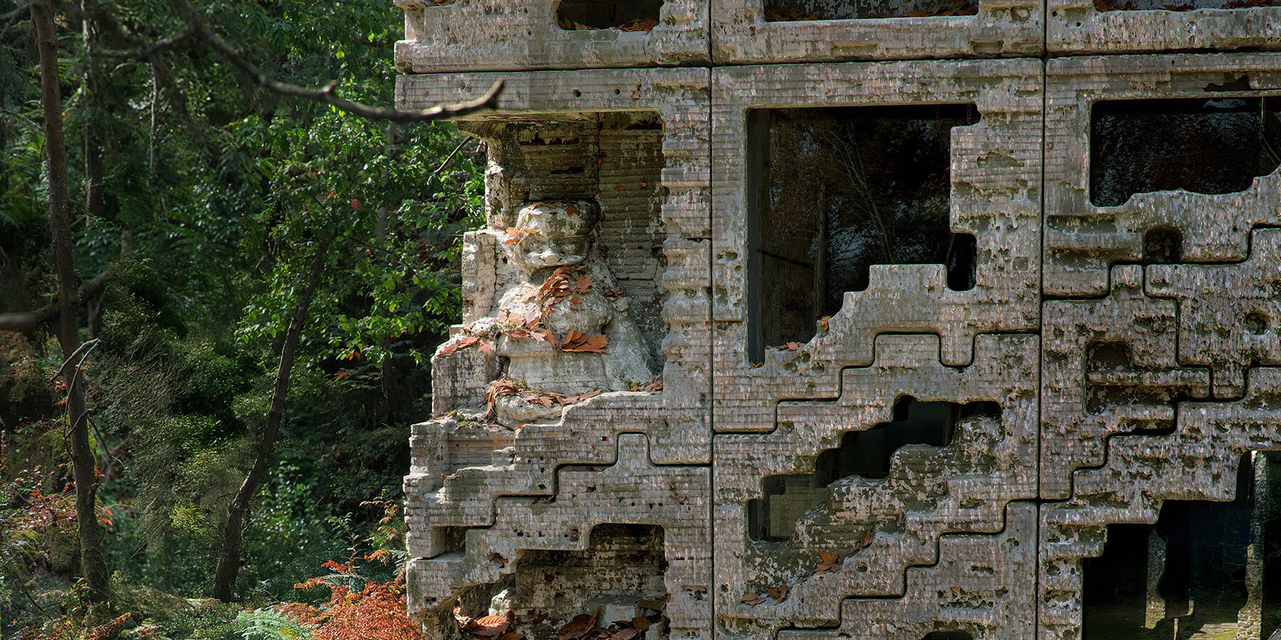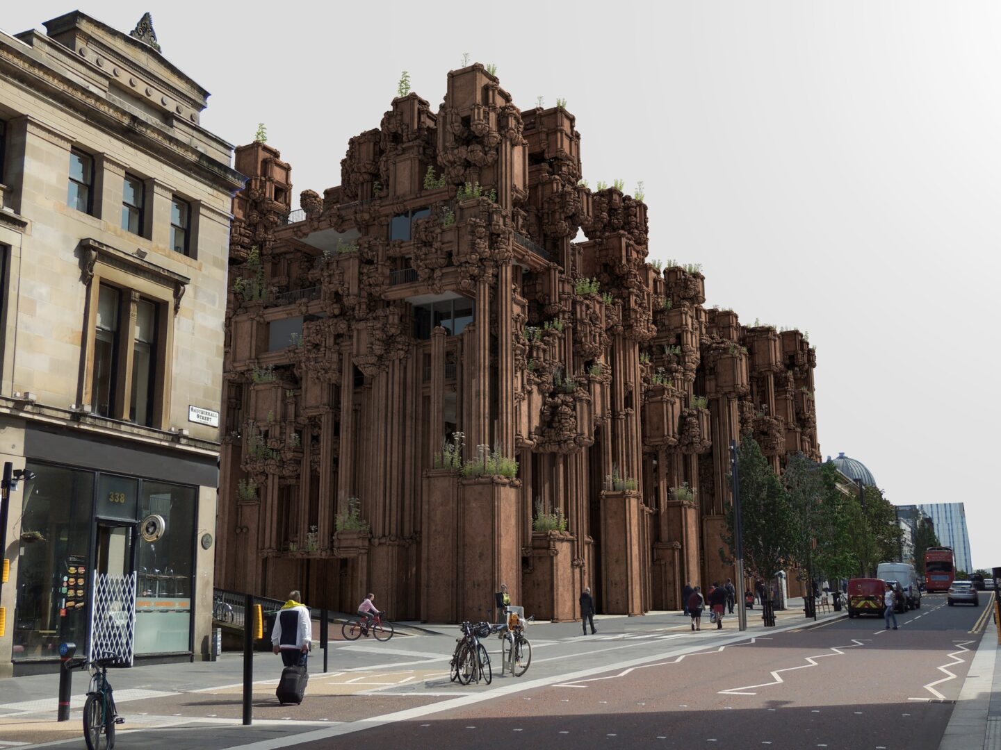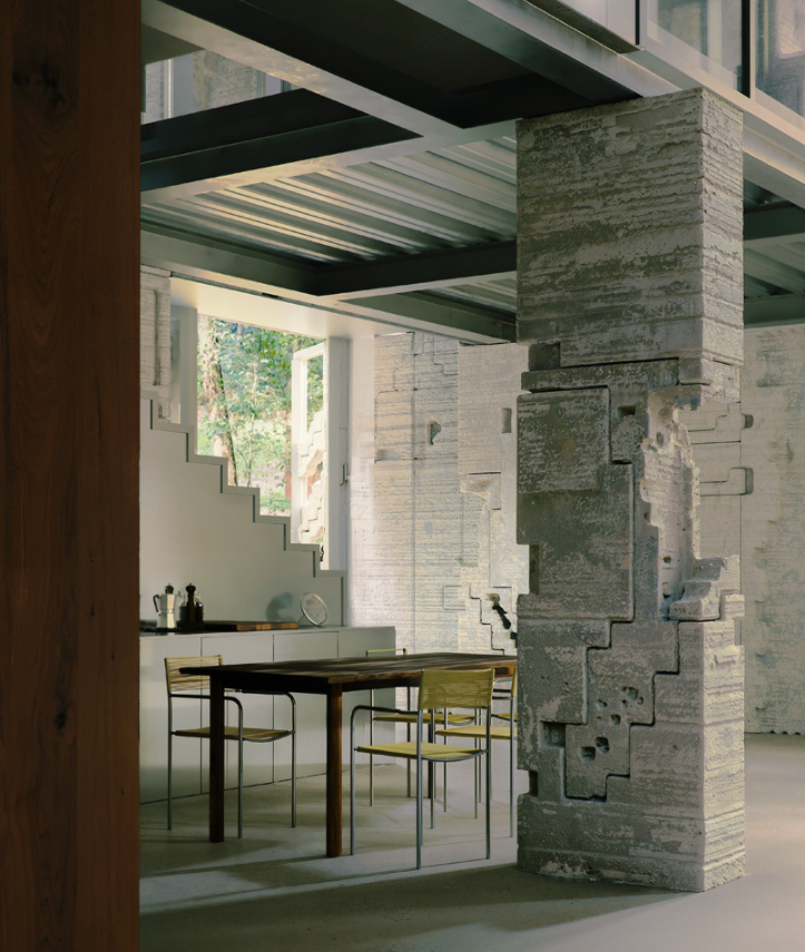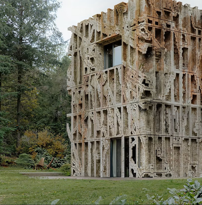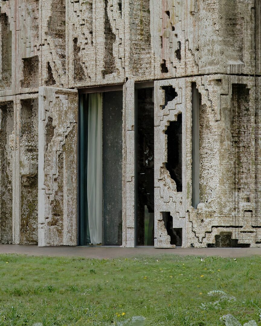 מעטפת מבני המגורים אצלו עשויים מחומר יחיד של גושי חול מודפסים בתלת-ממד בקנה מידה גדול. חזית זו פועלת כשכבה חיצונית עצמאית, מופרדת מהמסגרת המבנית ומהחללים הפנימיים. העיצוב מציע גישת בנייה פשוטה שבה ניתן להסיר, לעשות שימוש חוזר או להחליף חומרים במינימום פסולת. כל גוש חול מודפס בקנה מידה מספיק כדי ליצור חזית עבה ונושאת עומס, המתפקדת גם כמחסום התרמי של הבניין. פתחים חקוקים ישירות באלמנטים המונוליטיים, עם זיגוג שקוע השומר על המשכיות תרמית תוך כניסת אור יום. הגיאומטריה השבורה של החזיתות מאפשרת להוסיף או להסיר רכיבים בודדים של החזית לאורך זמן מבלי לשבש את הקוהרנטיות האדריכלית הכוללת.