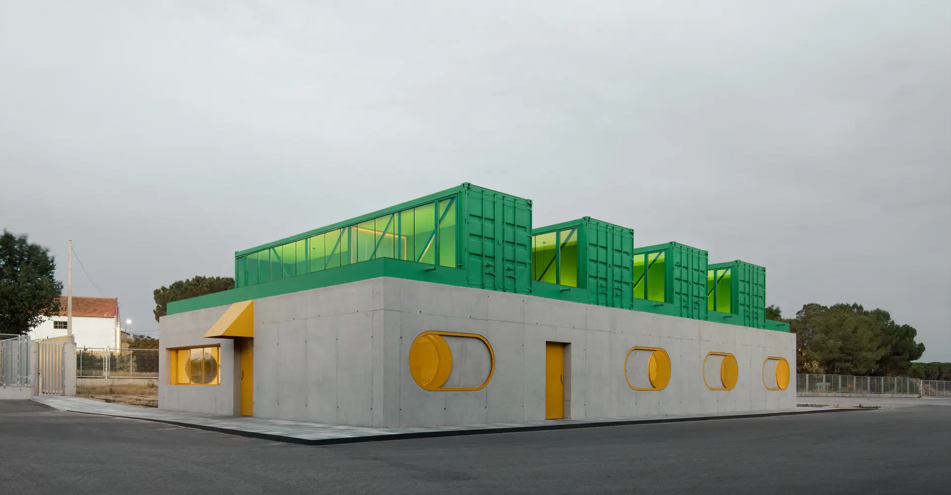 הבניין נשען על מערכת בנייה פשוטה ומקומית, תוך שימוש בבעלי מקצוע מהאזור וחומרים זמינים, מה שמחזק את האופי הצנוע והמדויק של הפרויקט. ארבעה מכולות משומשות, שנחתכו ונפתחו, הונחו על בסיס בטון משותף ויוצרות חתך גג משונן הכולל סקיילייטים. אלו מאפשרים חדירה מבוקרת של אור טבעי רך לחללים הפנימיים, תוך שמירה על תנאי עבודה נעימים.
