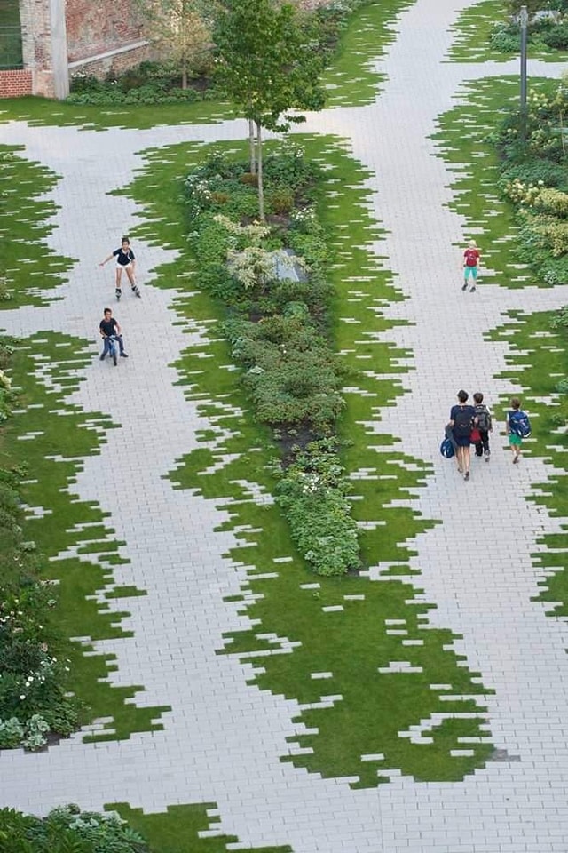 דפוס הריצוף פותח באמצעות אלגוריתמים שהתבססו על תחזיות תנועת הולכי רגל, אזורי ישיבה ומיקום העצים. התוכנה ליצירת הדפוס פותחה במיוחד עבור הפרויקט, והתבניות ליציקת אבני הבטון יוצרו באמצעות מכונות CNC. הפרויקט מציג יישום מתקדם של תכנון פרמטרי בתחום אדריכלות הנוף.