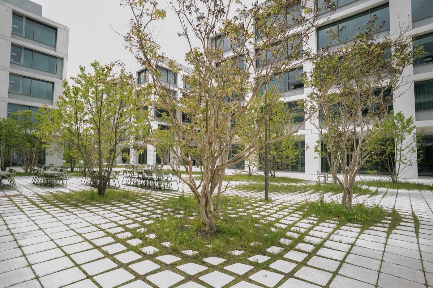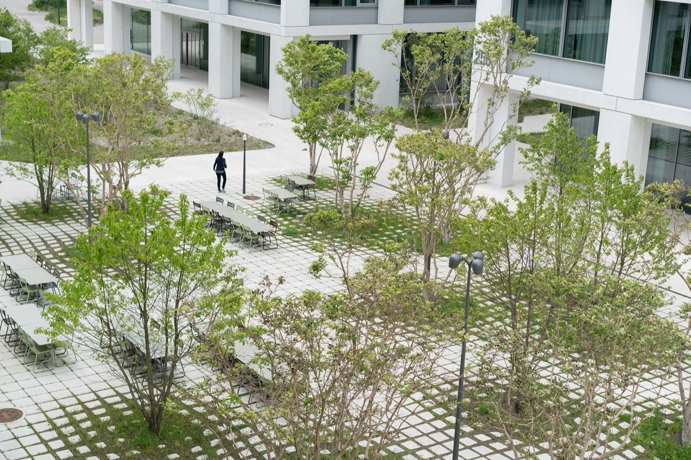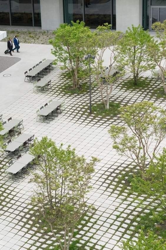 ריצוף הבטון של הכיכר תוכנן באופן פרמטרי: דפוס הריצוף מתפזר בהדרגה מאזורי התנועה המרכזיים לעבר העצים והצמחייה, ויוצר מעבר רך בין משטחים קשיחים לשטחים ירוקים. כך מתקבלת היררכיה של תנועה ומרחב, תוך יצירת כיכר פתוחה המאפשרת שהייה, מפגש ואירועים. עם השנים, המרחב שהתאפיין בתחילה בגוונים אפורים מתפתח בהדרגה לנווה ירוק בלב הקמפוס.