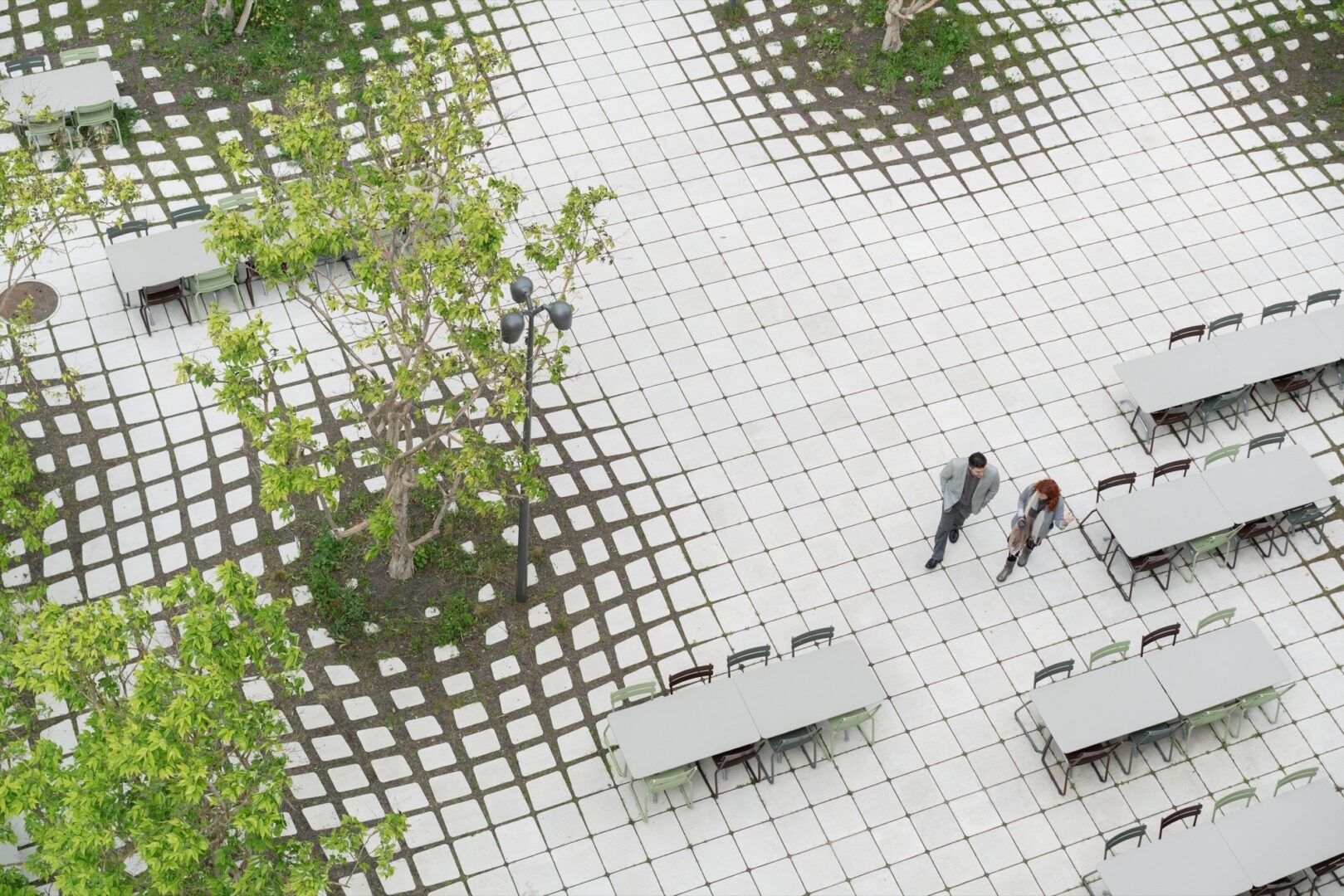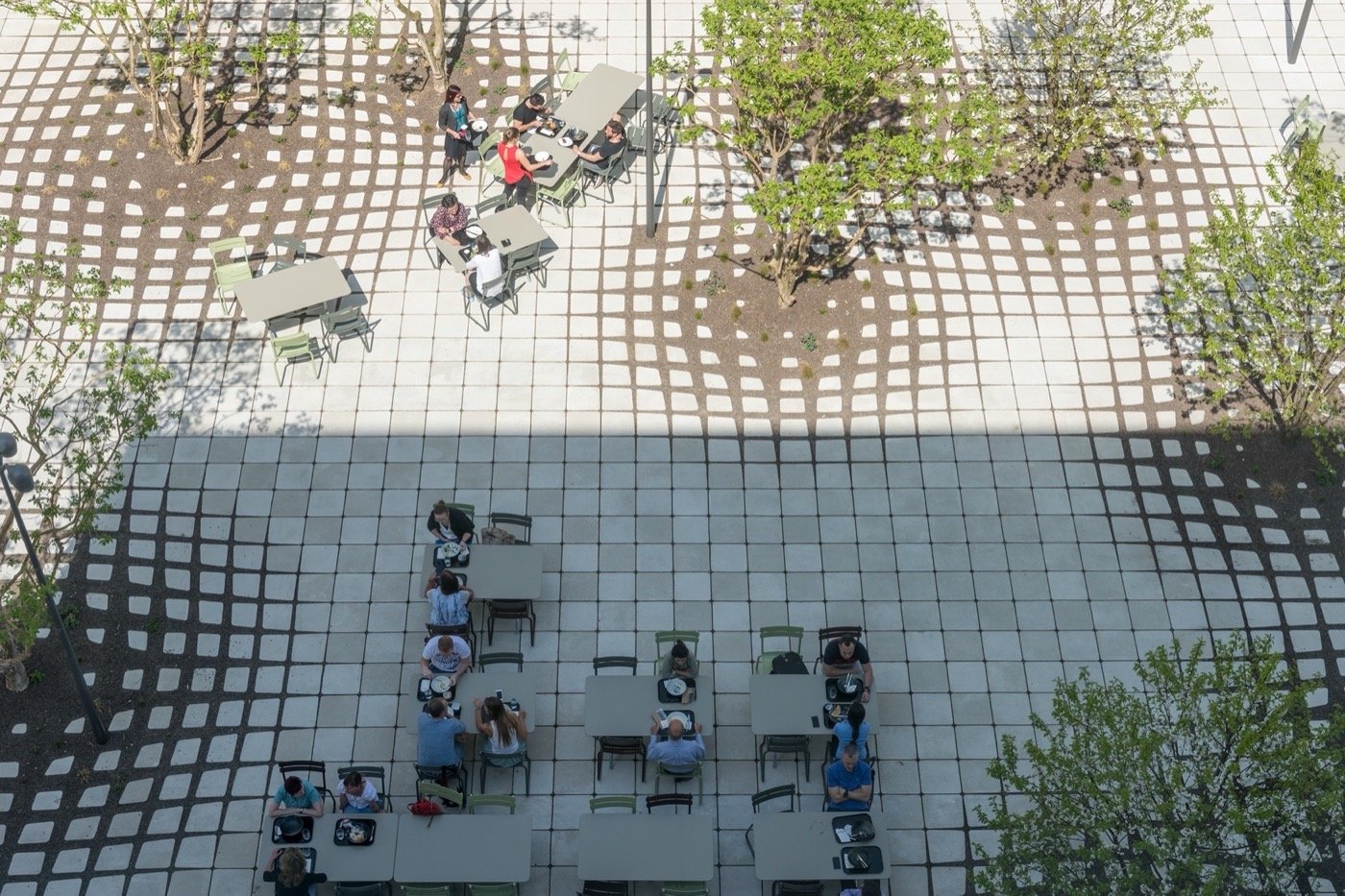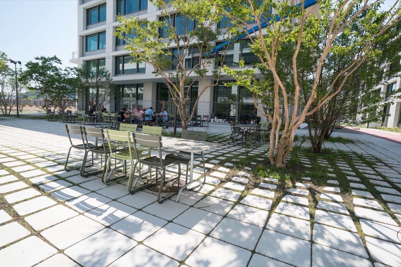 ריצוף הבטון של הכיכר תוכנן באופן פרמטרי: דפוס הריצוף מתפזר בהדרגה מאזורי התנועה המרכזיים לעבר העצים והצמחייה, ויוצר מעבר רך בין משטחים קשיחים לשטחים ירוקים. כך מתקבלת היררכיה של תנועה ומרחב, תוך יצירת כיכר פתוחה המאפשרת שהייה, מפגש ואירועים. עם השנים, המרחב שהתאפיין בתחילה בגוונים אפורים מתפתח בהדרגה לנווה ירוק בלב הקמפוס.