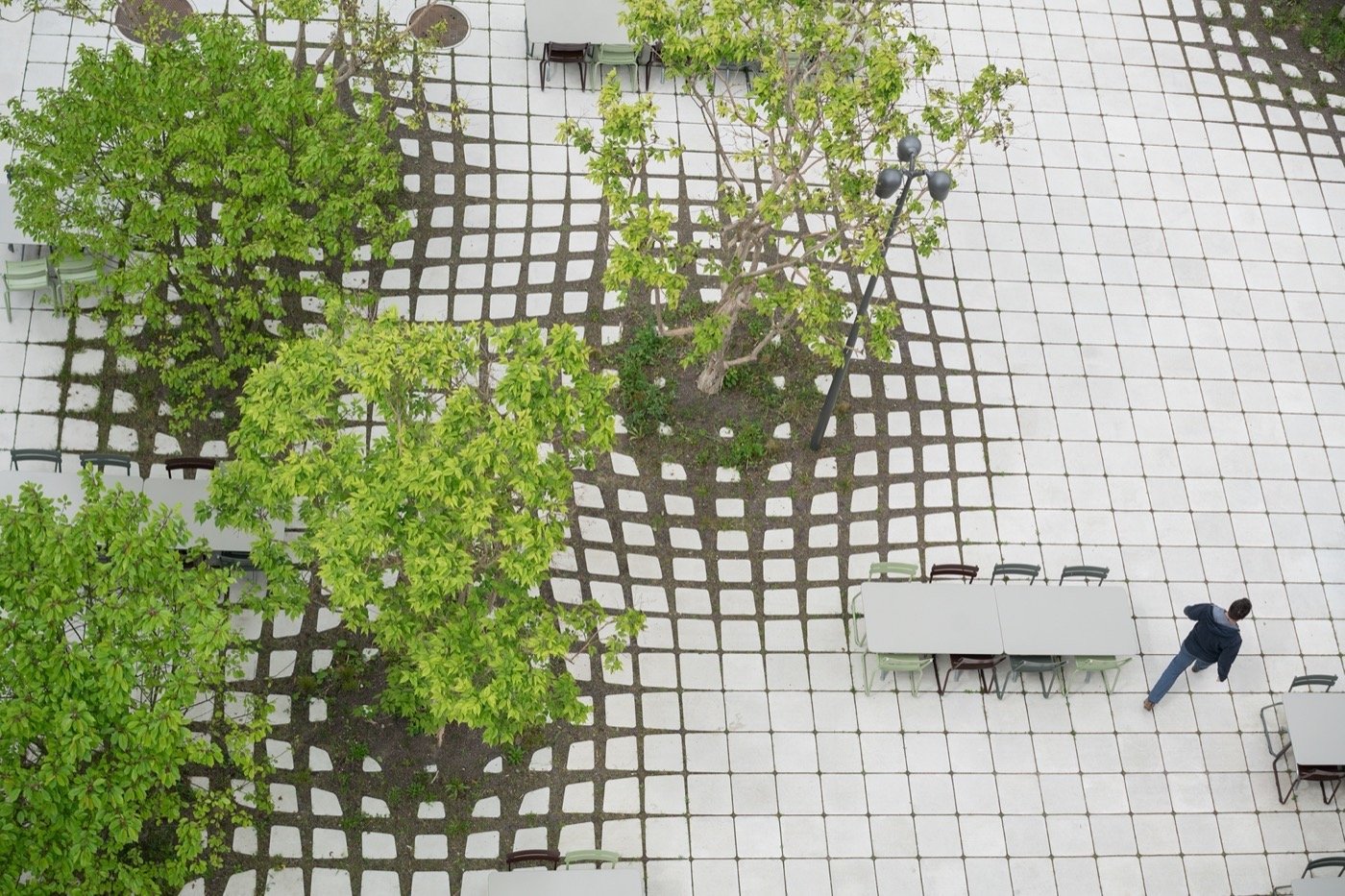 העיצוב יוצר מעבר אורגני בין משטחים קשיחים לבין אזורי שתילה ועצים.