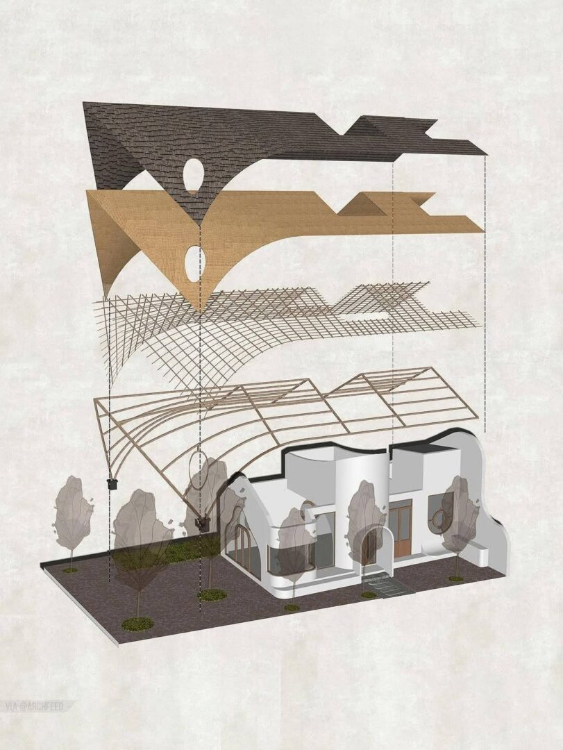 גג כאלמנט מרכזי – אלמנט בולט בפרויקט הוא גג משופע המתמשך מערבה: משמש כהצללה מפני השמש החזקה של אחר הצהריים, מגדיר את הצללית האדריכלית של המבנה. הגג מחופה בלוחות מתכת קטנים בצבעים, צורות וגדלים שונים, המסודרים כמו קשקשים ויוצרים טקסטורה דינמית המשתנה עם האור.