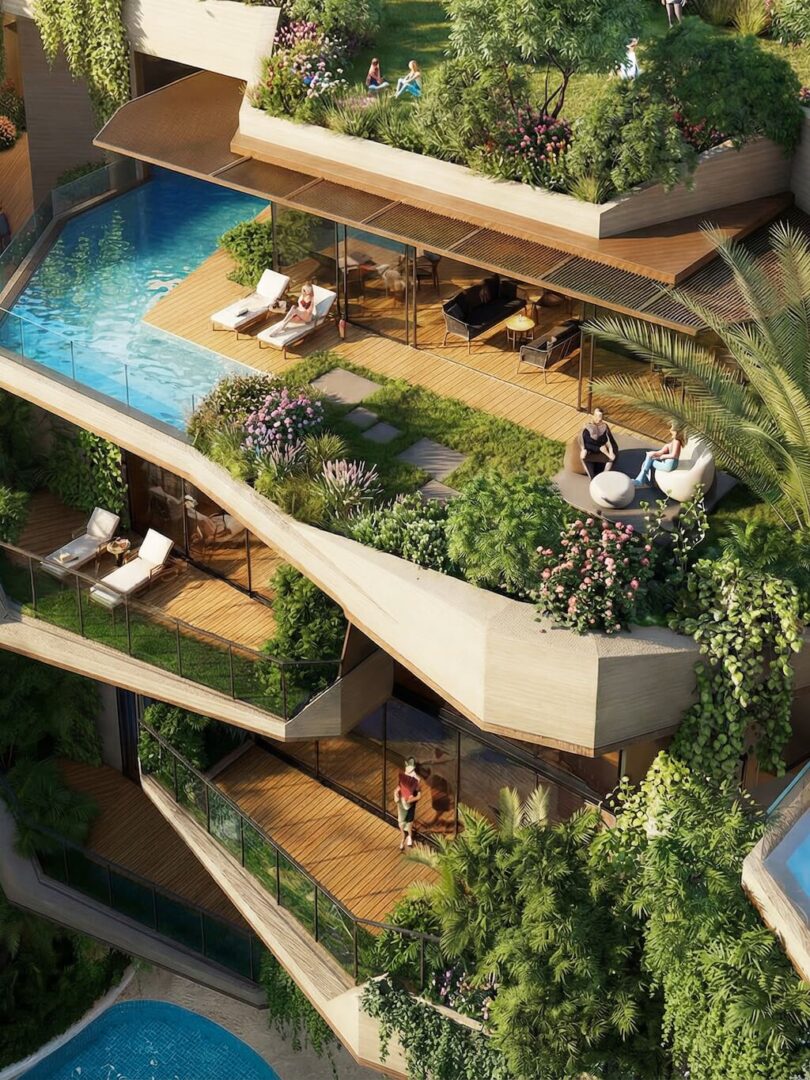 האסטרטגיה האקולוגית רואה במבנה מצע לצמיחה ביולוגית: חזיתות מותאמות לצמחייה מטפסת ומרפסות ירוקות יאפשרו התפתחות של מעטפת חיה. מערכת מיקרו־אקלים משלבת אוורור טבעי באמצעות “עמק הבריזה”, קירות מים ומפלים לקירור אידוי, גגות ירוקים, ריצוף מחלחל ואיסוף מי גשמים – ליצירת סביבה עמידה ובת־קיימא בהתערבות מינימלית.