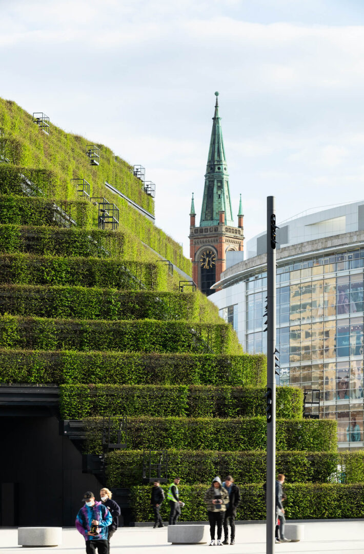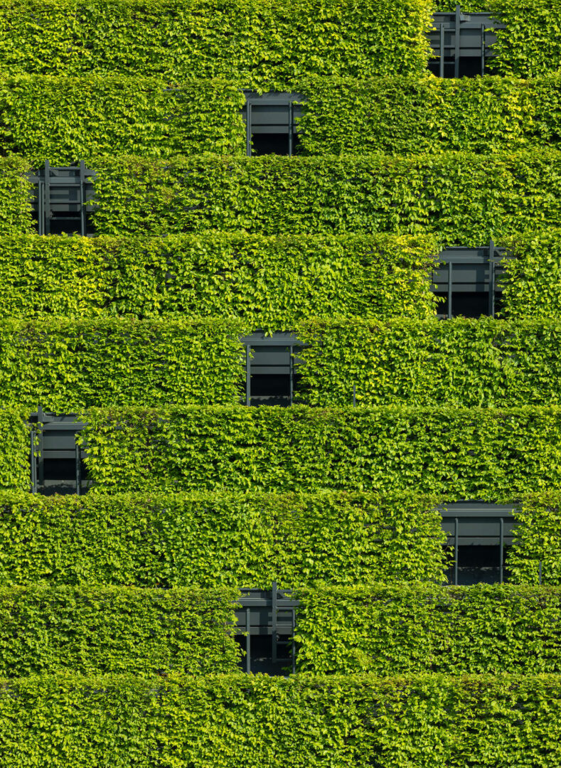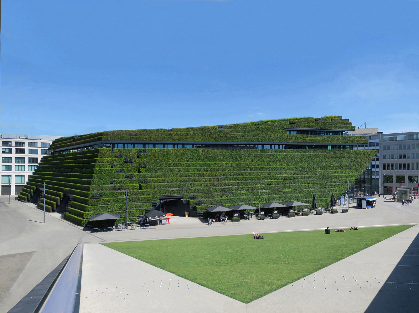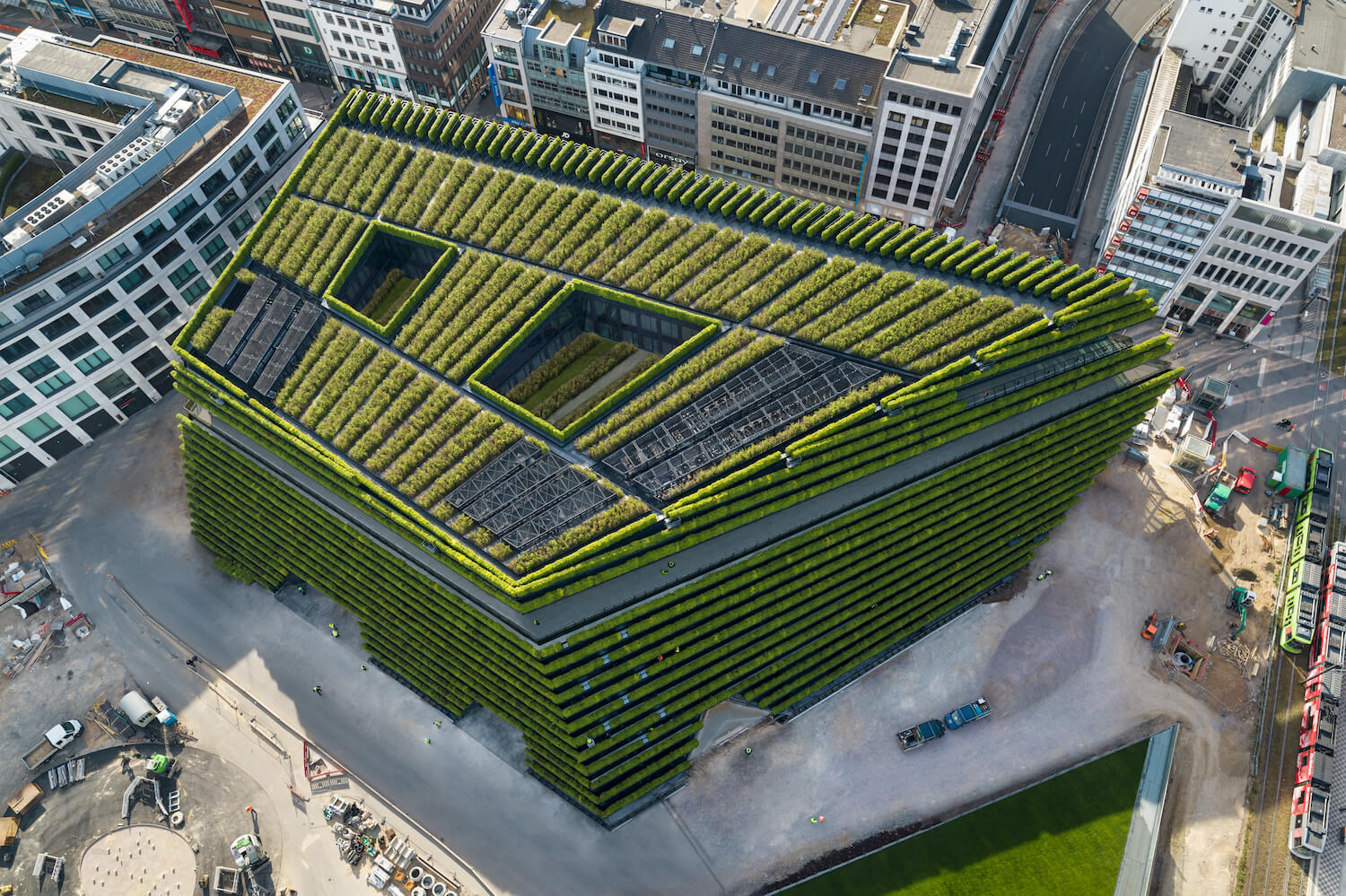 עיצוב הבניין סוטה מהטיפוסולוגיה הקונבנציונלית של גושי בניינים ולובש צורה טרפזית, עם משטחים משופעים הפונים לכיכר ולפארק הסמוכים. מישורים משופעים אלה, מכוסים כולם בגדר חיה של קרן ויוצרים חזית צמחית מדורגת, המשתרעת על פני יותר מ-8 קילומטרים במדידה שטוחה. משטח חי זה לא רק מגדיר את מראה הבניין, אלא גם נחשב כמשרת פונקציות סביבתיות: שיפור איכות האוויר, הפחתת אפקט אי החום העירוני, מתן בידוד קול וטיפוח מגוון ביולוגי עירוני. מערכת השקיה וגיזום מותאמת אישית מבטיחה שהצמחייה תישאר שופעת ומתוחזקת היטב לאורך כל השנה.