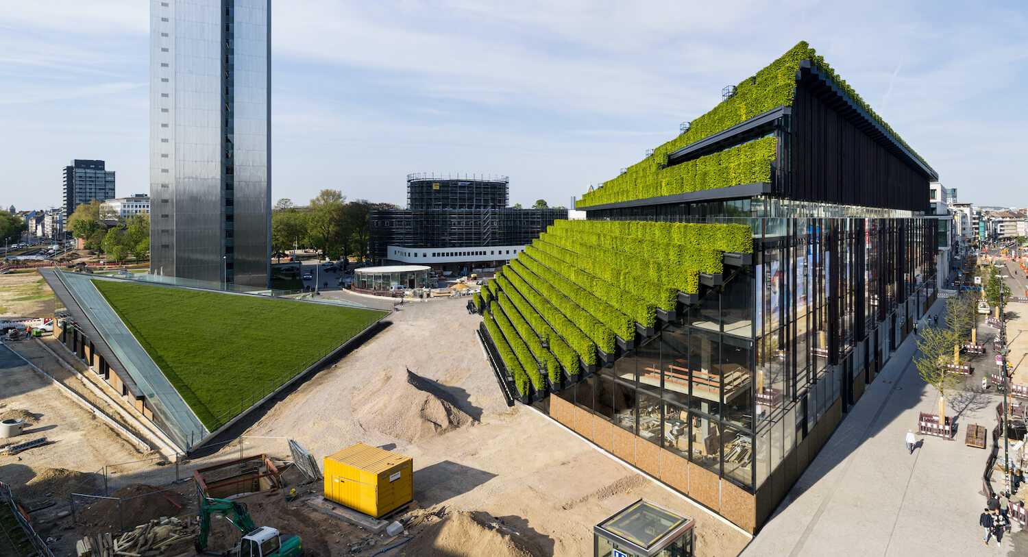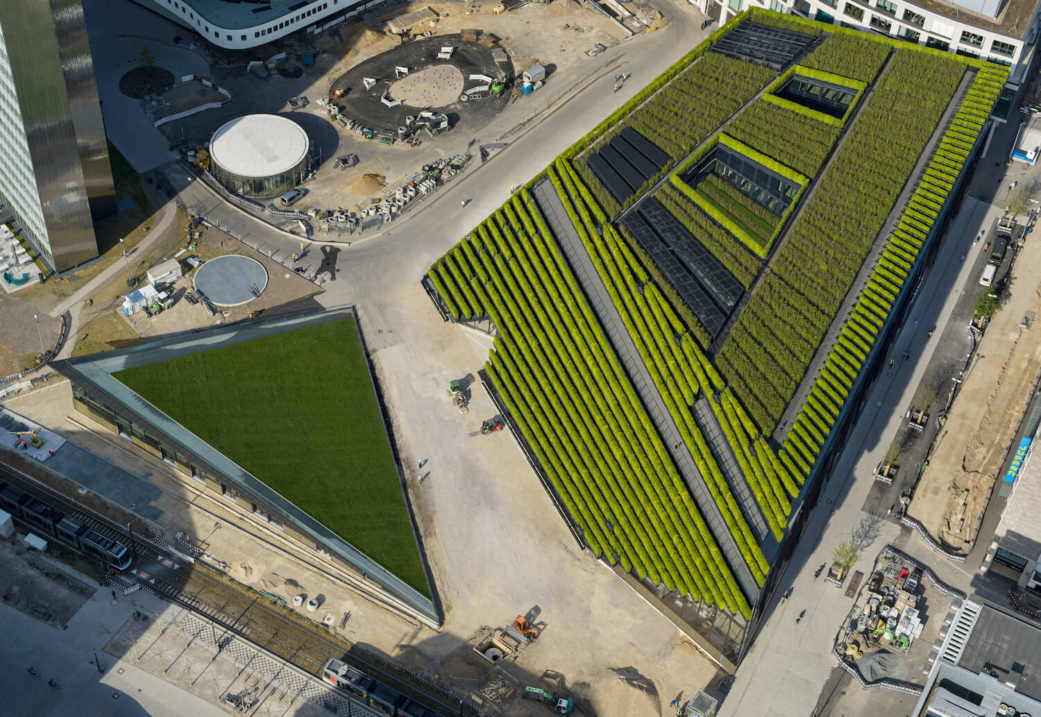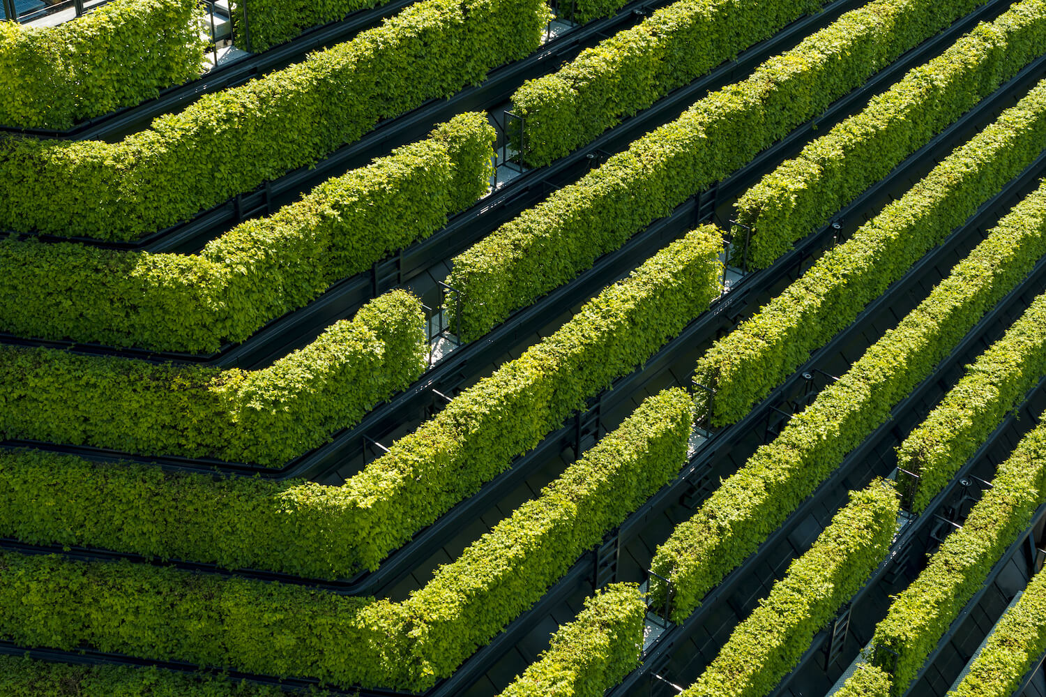 עיצוב הבניין סוטה מהטיפוסולוגיה הקונבנציונלית של גושי בניינים ולובש צורה טרפזית, עם משטחים משופעים הפונים לכיכר ולפארק הסמוכים. מישורים משופעים אלה, מכוסים כולם בגדר חיה של קרן ויוצרים חזית צמחית מדורגת, המשתרעת על פני יותר מ-8 קילומטרים במדידה שטוחה. משטח חי זה לא רק מגדיר את מראה הבניין, אלא גם נחשב כמשרת פונקציות סביבתיות: שיפור איכות האוויר, הפחתת אפקט אי החום העירוני, מתן בידוד קול וטיפוח מגוון ביולוגי עירוני. מערכת השקיה וגיזום מותאמת אישית מבטיחה שהצמחייה תישאר שופעת ומתוחזקת היטב לאורך כל השנה.