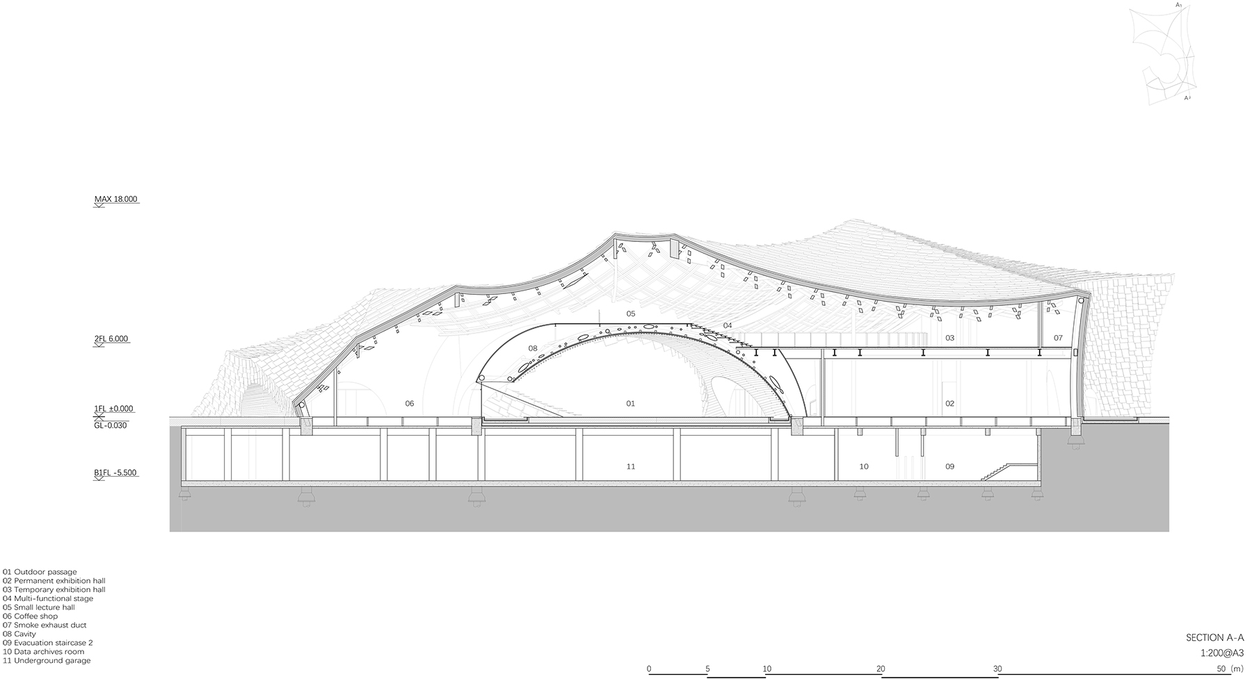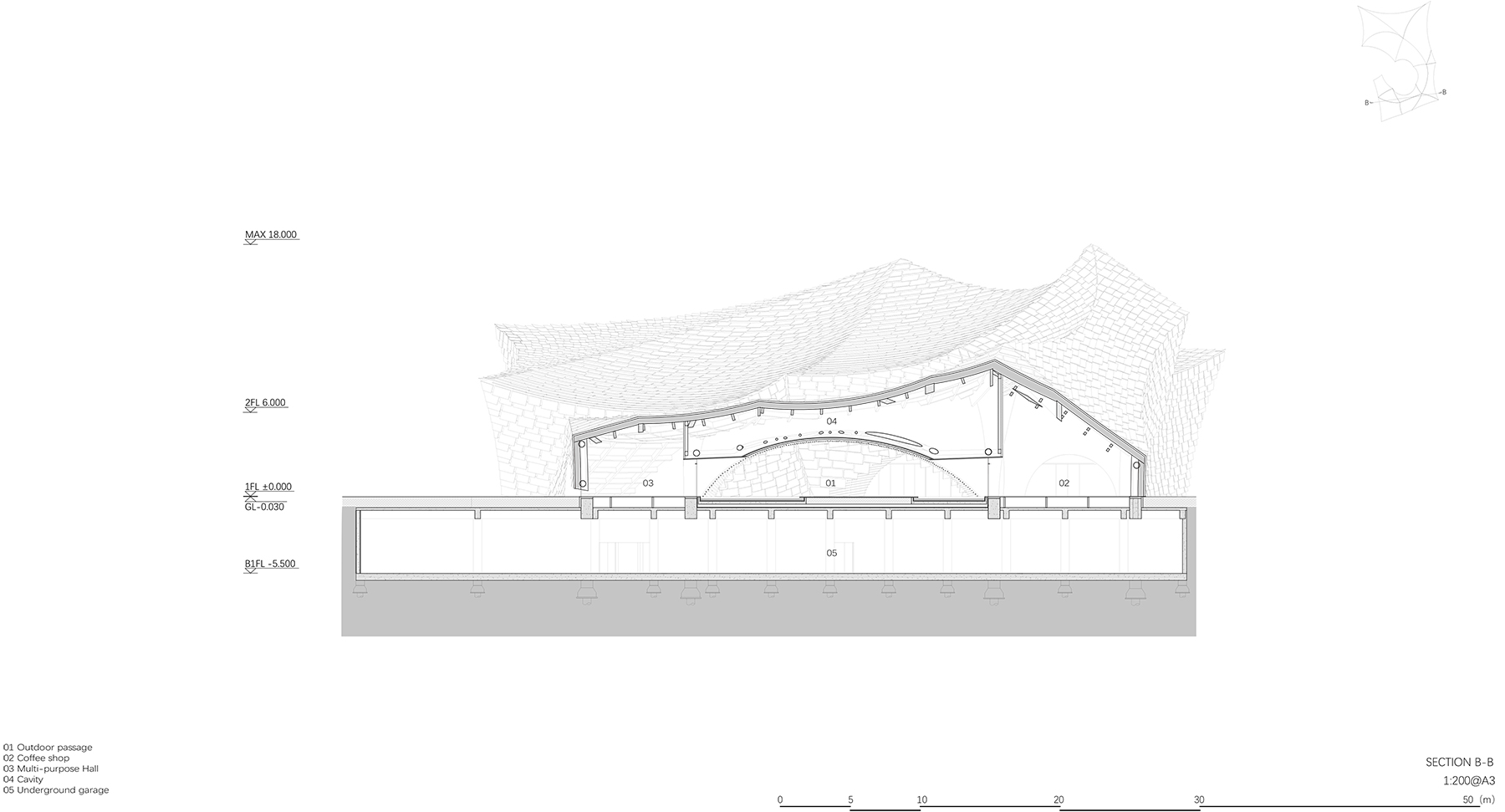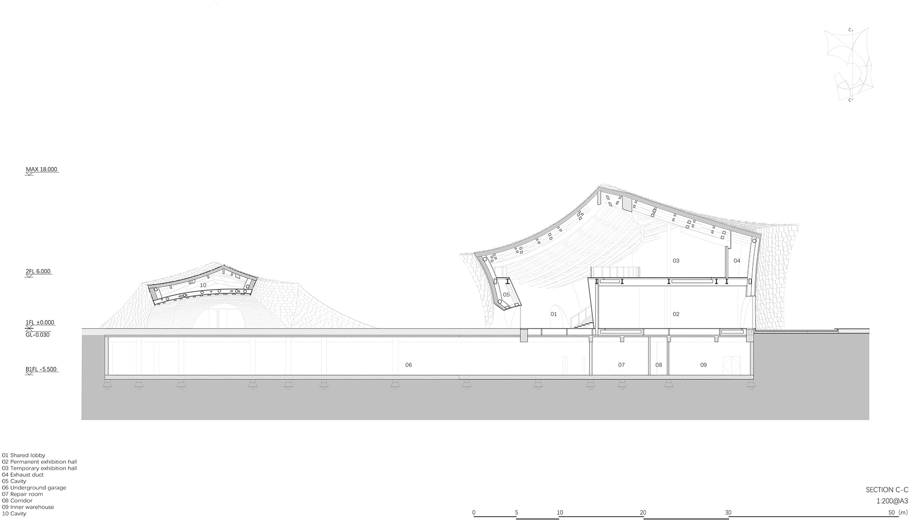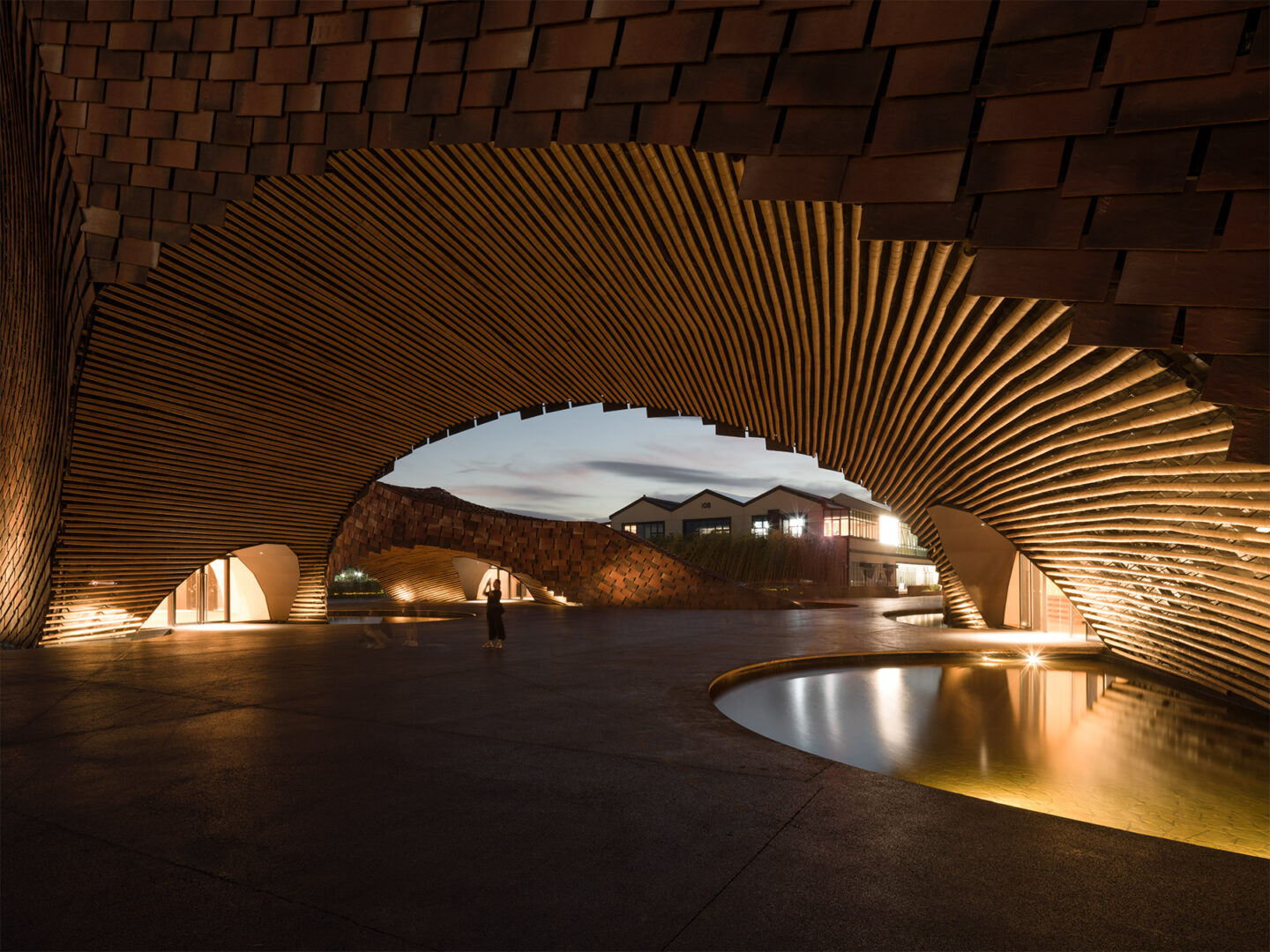הגג, במבנה קונכייה הפוכה המעוצבת באמצעות גאומטריה כדורית, נשען על ארבע שכבות של קורות עץ מסבכיות, המייצרות חלל פנימי דינמי וזורם. חזית המבנה פותחה בשיתוף אומנים מקומיים וכוללת פאנלים קרמיים מזוגגים בגוונים משתנים, המדמים את חומריות כלי התה המסורתיים של יישינג ומגיבים לאור ולשינויי עונות השנה.